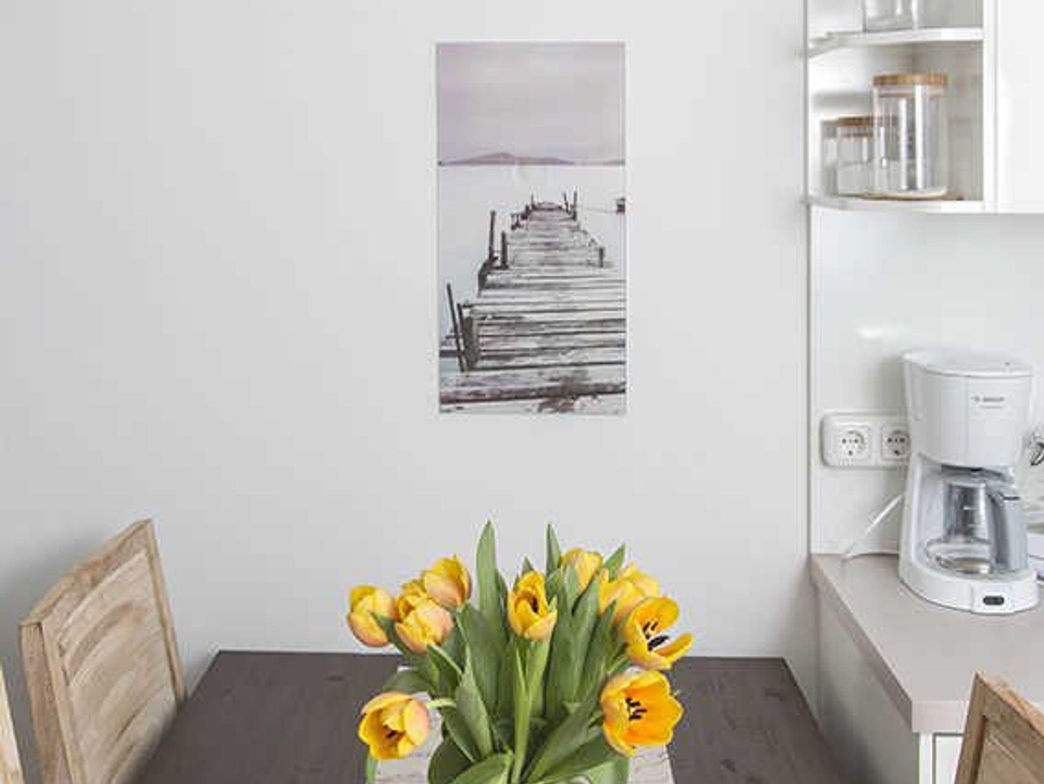 Das sehr liebevoll eingerichtete Nichtraucherappartement „Sonnendeck“ verfügt über ein großes, helles Wohnzimmer mit offenem Ess- und Küchenbereich sowie ein Schlafzimmer. ----- Das Schlafzimmer ist mit einem Doppelbett (180 x 200, eine große Matratze), hochwertigen Lattenrosten und Matratzen sowie einem Schwebetürenschrank mit ausreichend Stauraum ausgestattet. ----- Vom großzügigen Eingangsbereich gelangen Sie in den Wohnbereich mit integrierter Einbauküche. Die hochwertige Küche ist mit Cerankochfeld, Backofen, Geschirrspüler, Kühl-Gefrierkombination, Kaffeemaschine, Wasserkocher, Toaster, Töpfen, Pfannen sowie ausreichend Geschirr und Besteck ausgestattet. Der Essbereich für 4 Personen schließt sich unmittelbar an. -----