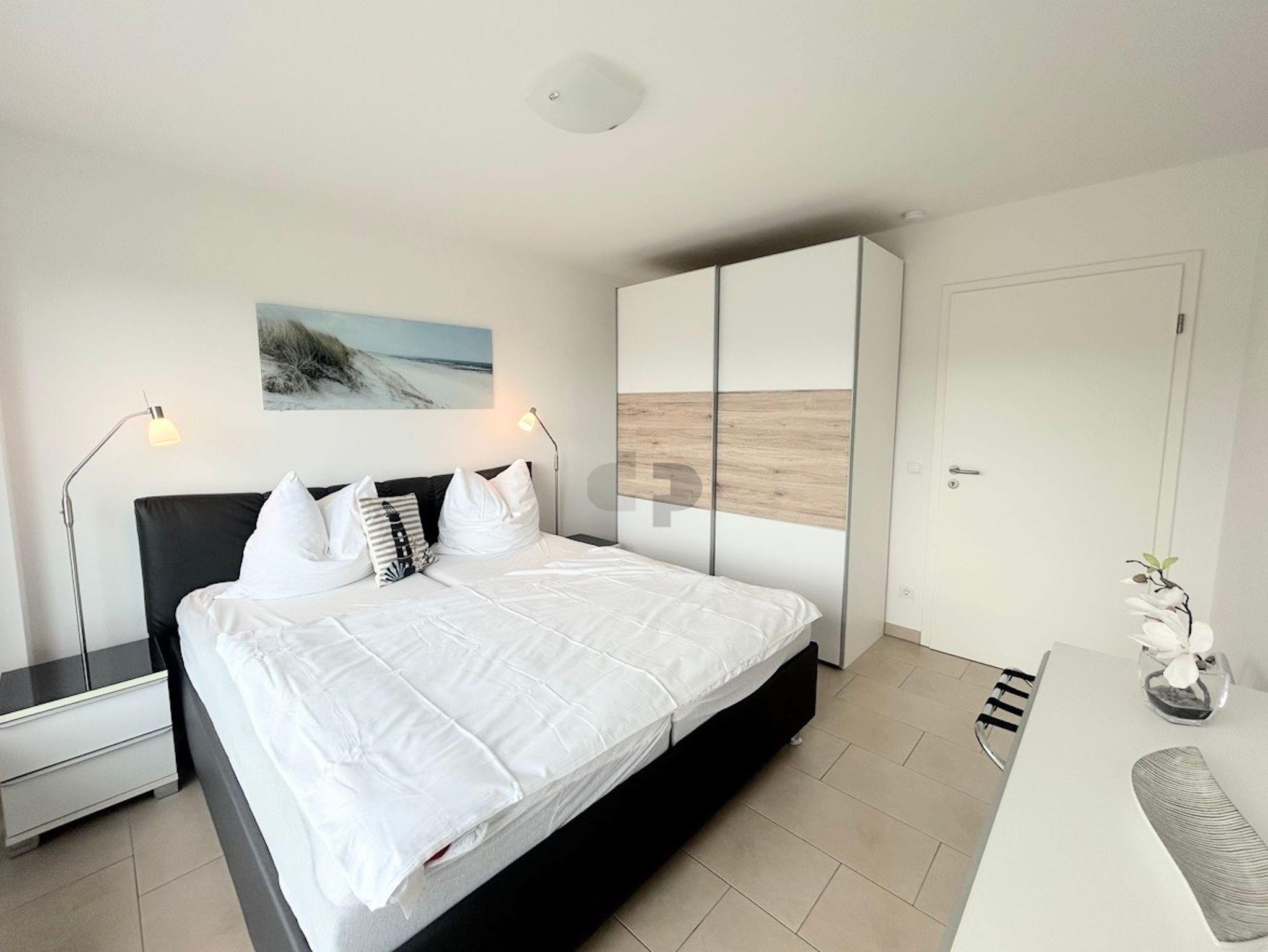 Das Schlafzimmer ist mit einem Doppelbett mit 2 Matratzen, Kleiderschrank und einer Kommode ausgestattet. Der Wohnbereich ist mit modernen Möbeln, einer Schlafcouch und TV ausgestattet.