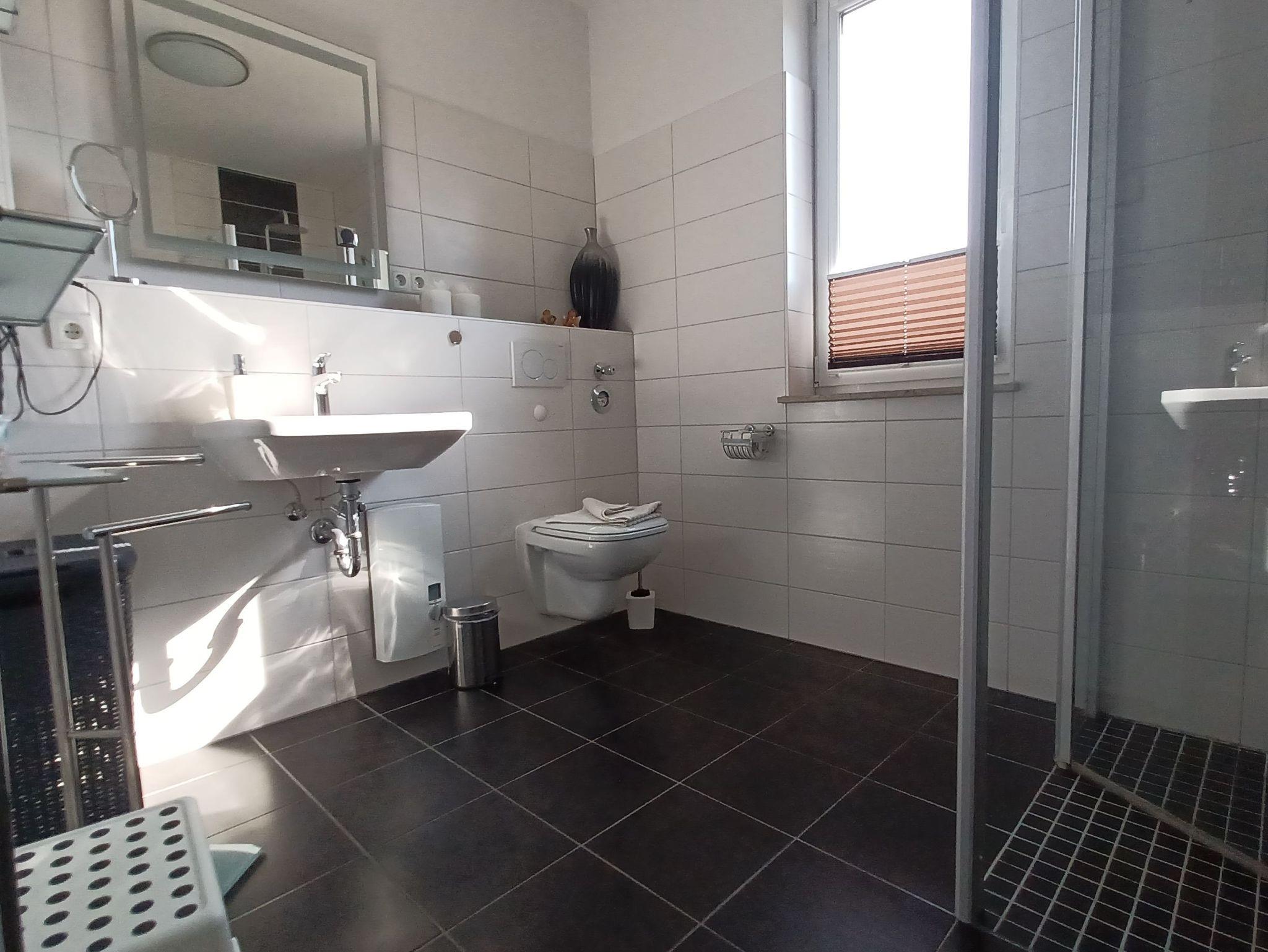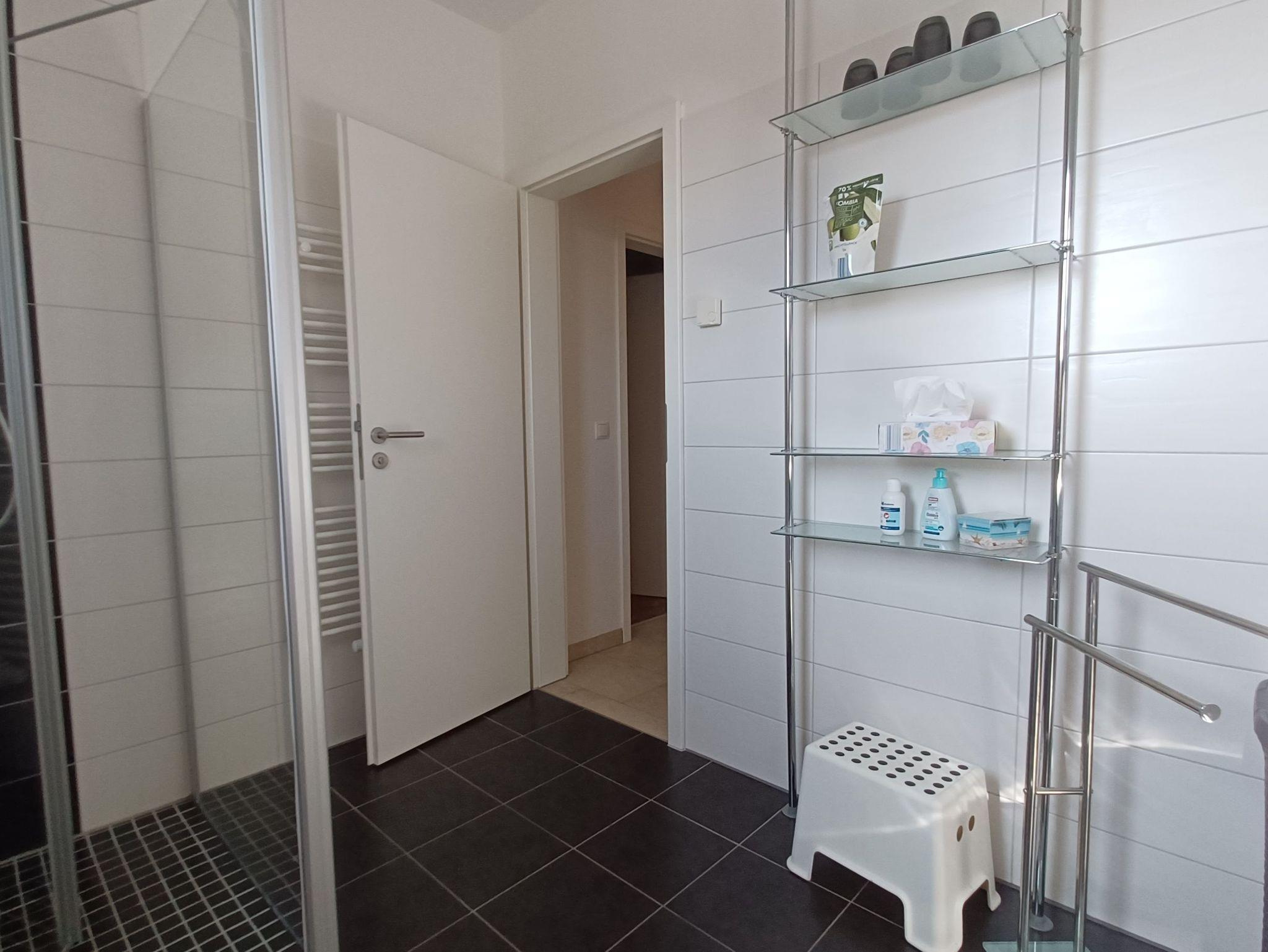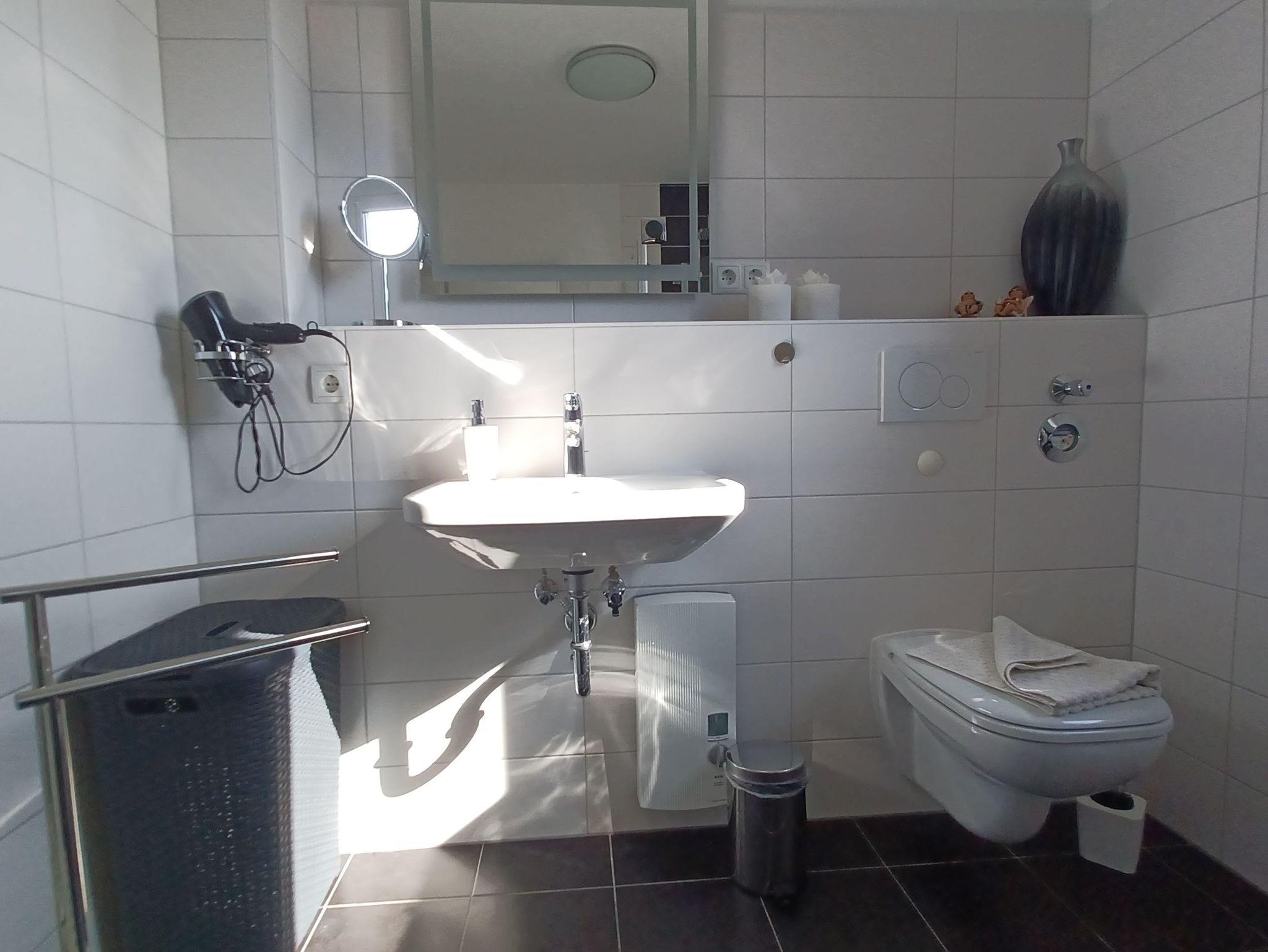 Das freundliche Tageslichtbad verfügt über eine sehr großzügige Regendusche mit Handbrause, genügend Ablagemöglichkeiten, sowie Waschplatz mit Föhn, Leuchtspiegel, groß dimensionierten Handtuchheizkörper mit Speichermöglichkeiten und großem transparenten frei schwebenden Wandregal.