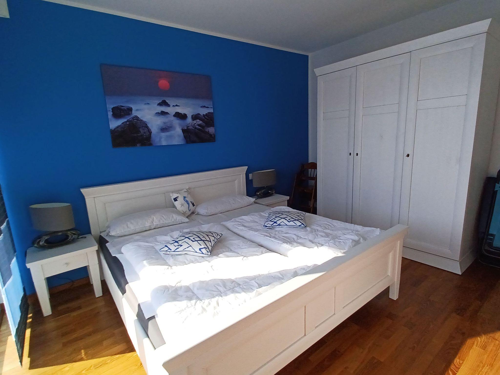 Im angrenzenden Schlafzimmer befindet sich ein hochwertiges Doppelbett (1,80 x 2,00 m), ein 3- teiliger Schrank, sowie eine Kommode. Desweiteren eine spezielle Pollen-Fliegengitter-Schiebetüre für Allergiker. An der rechten Nachtkonsole befindet sich ein Netzfreischalter. Hierdurch werden elektrische Felder und Spannungen unterbrochen. Somit entsteht kein schädlicher Elektrosmog und Sie schlafen ruhig und gesund !