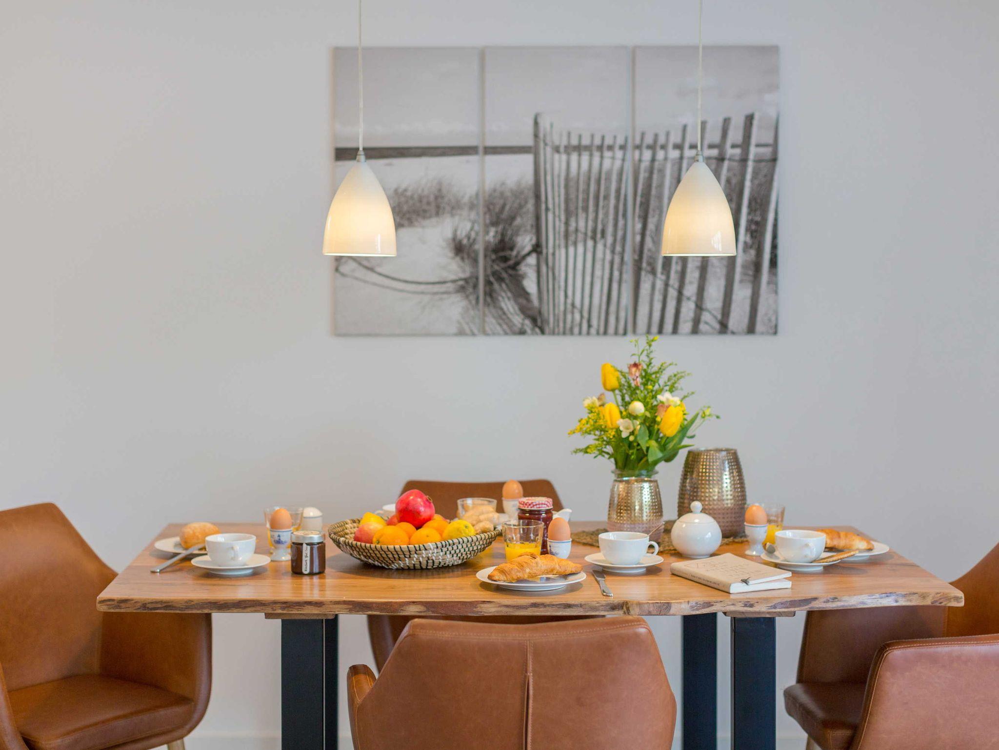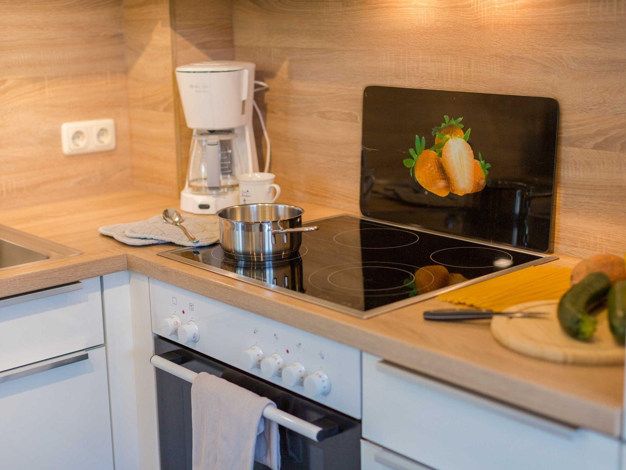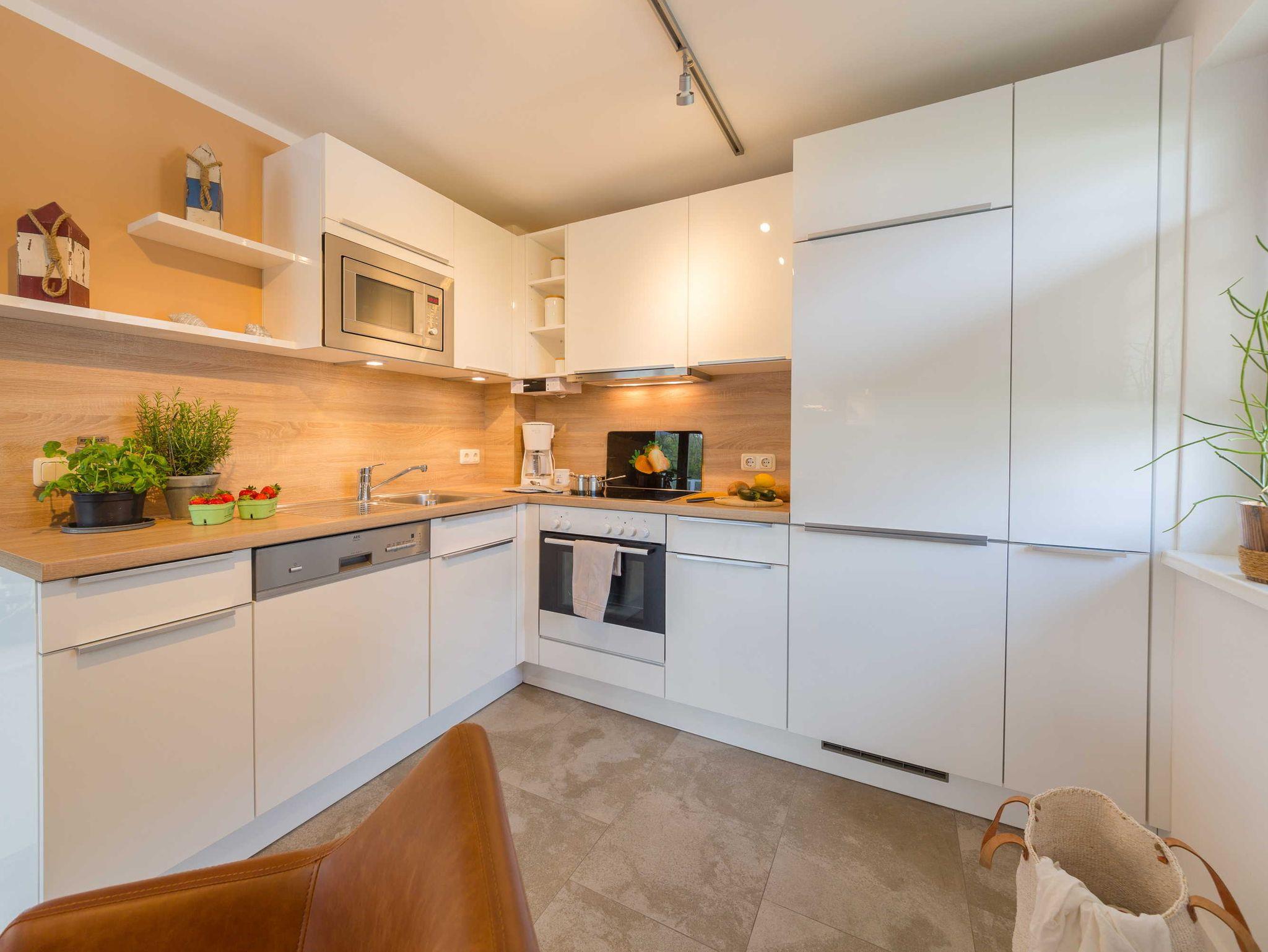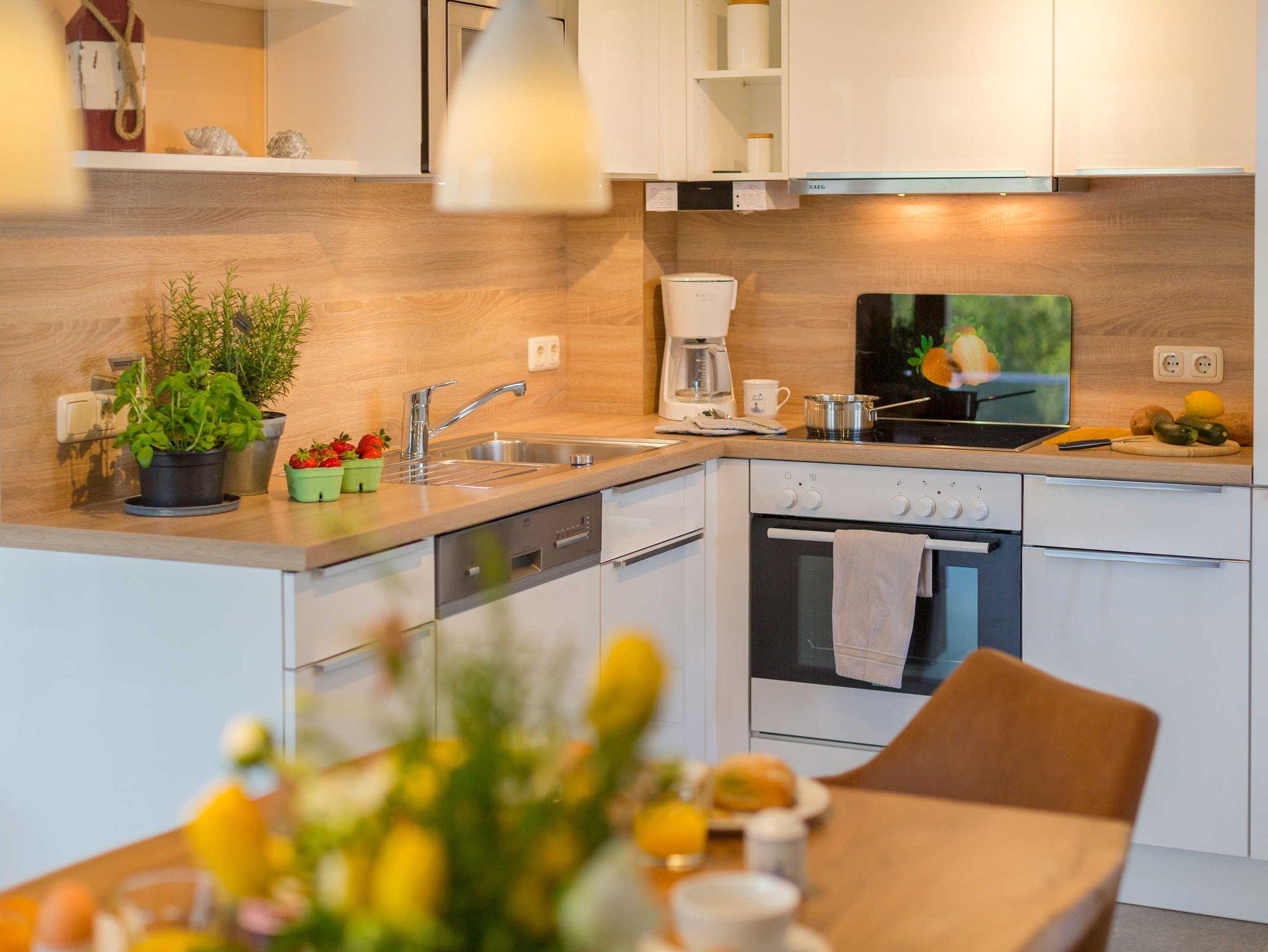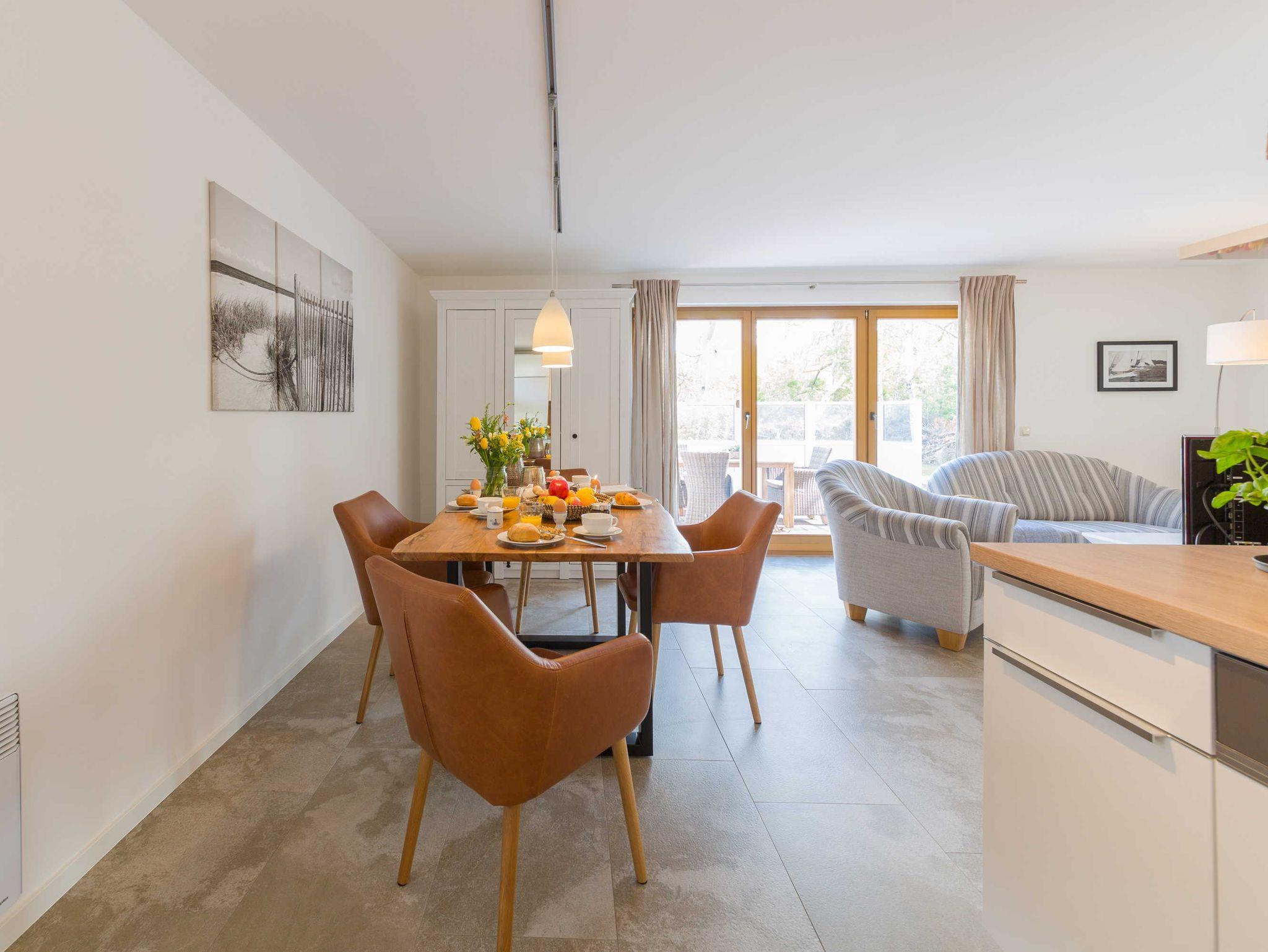 Das offene Wohnzimmer bieten neben einer Couchgarnitur einen Flachbild-TV mit SAT-Empfang und einen Blue-Ray Player. Im Essbereich steht ein großer Tisch mit ausreichend Stühlen. Die Einbauküche ist komplett ausgestattet, u.a. mit Geschirrspüler, Backofen-Herd, Kühlschrank, Kaffeemaschine, Toaster und Wasserkocher.