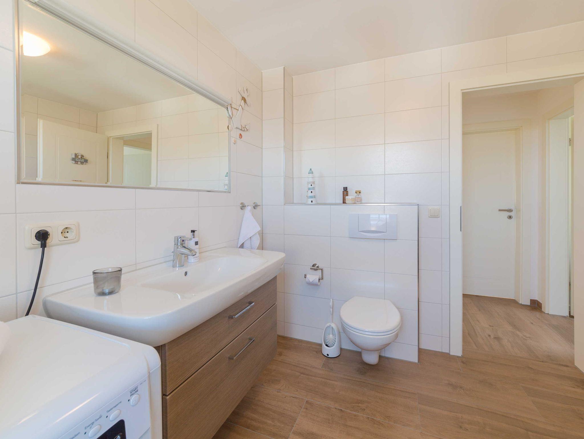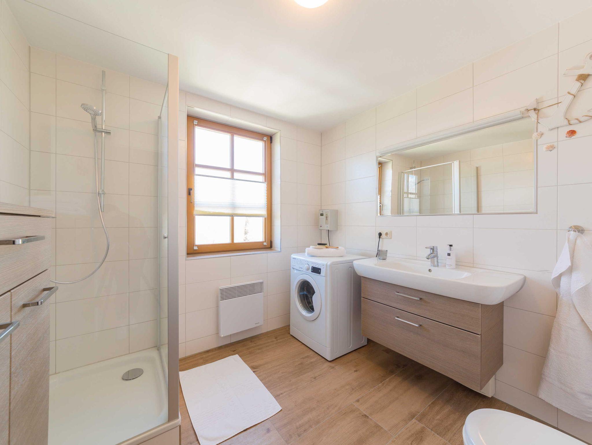 Das Badezimmer ist mit Dusche/WC und Münz-Waschmaschine ausgestattet. Zusätzlich gibt es ein separates Gäste-WC.