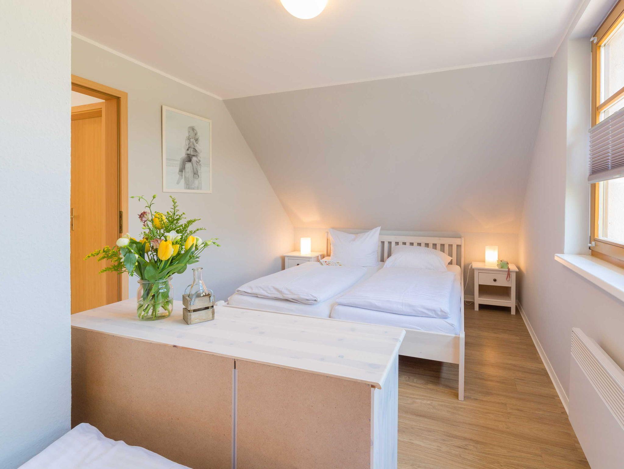 Die 2019 renovierte Doppelhaushälfte ist für bis zu 4 Personen geeignet und ca. 65 qm groß. Sie bietet Ihnen zwei separate Schlafzimmer mit jeweils einem Doppelbett. Die Betten sind 180 cm und 140 cm breit. Ein Schlafzimmer hat zusätzlich ein Zustellbett mit einer Breite von 90 cm.