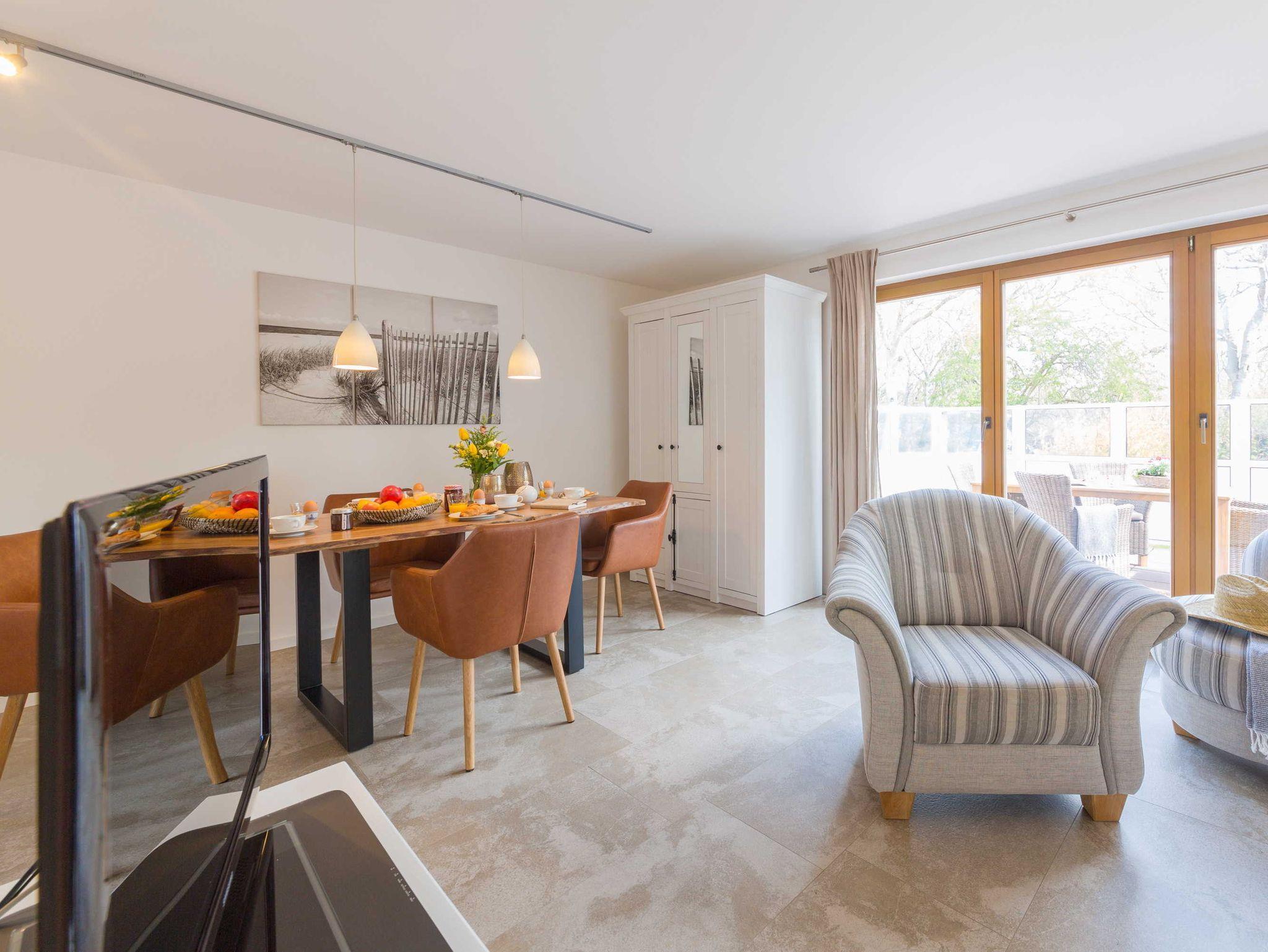 Das offene Wohnzimmer bieten neben einer Couchgarnitur einen Flachbild-TV mit SAT-Empfang und einen Blue-Ray-Player. Im Essbereich steht ein großer Tisch mit ausreichend Stühlen. Die Einbauküche ist komplett ausgestattet, u.a. mit Geschirrspüler, Backofen-Herd, Kühlschrank, Kaffeemaschine, Toaster und Wasserkocher.