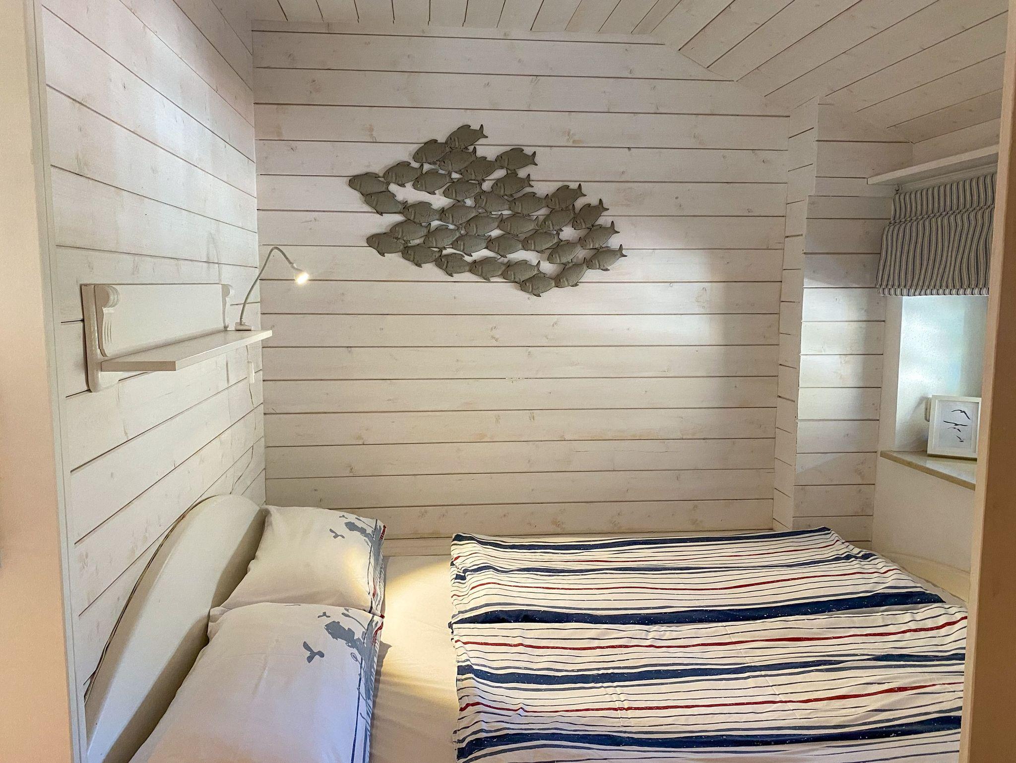 In der Ferienwohnung Wattmanbruukt im Dachgeschoss eines Einfamilienhauses erwartet dich eine gemütliche Auszeit mit Ostsee-Flair. Der separate Zugang über die Außentreppe führt dich in eine Wohnung für 4 Personen, die mit ihrem maritimen Stil und einem warmen Kamin im Wohnzimmer sofort zum Wohlfühlen einlädt. Das offene Wohnzimmer bietet eine einladende Atmosphäre, perfekt für entspannte Stunden mit einem guten Buch oder einem geselligen Abend. Die angrenzende offene Küche fügt sich harmonisch in den Raum ein und ermöglicht es dir, mit deinen Liebsten gemeinsam zu kochen und zu genießen. Das separate Schlafzimmer bietet ein komfortables Doppelbett für erholsame Nächte. Zusätzlich gibt es in einer charmanten Schlafkoje ein kleines Doppelbett, das sich ideal für Kinder oder weitere Mitreisende eignet. Das moderne Bad mit ebenerdiger Dusche ist gemütlich und freundlich gestaltet.Die Terrasse vor dem Haus lädt dazu ein, die frische Ostseeluft zu genießen und bietet Platz für entspannte Momente im Freien. Für Radfahrer ist eine sichere Unterstellmöglichkeit für Fahrräder vorhanden und ein Parkplatz direkt am Haus steht ebenfalls zur Verfügung.