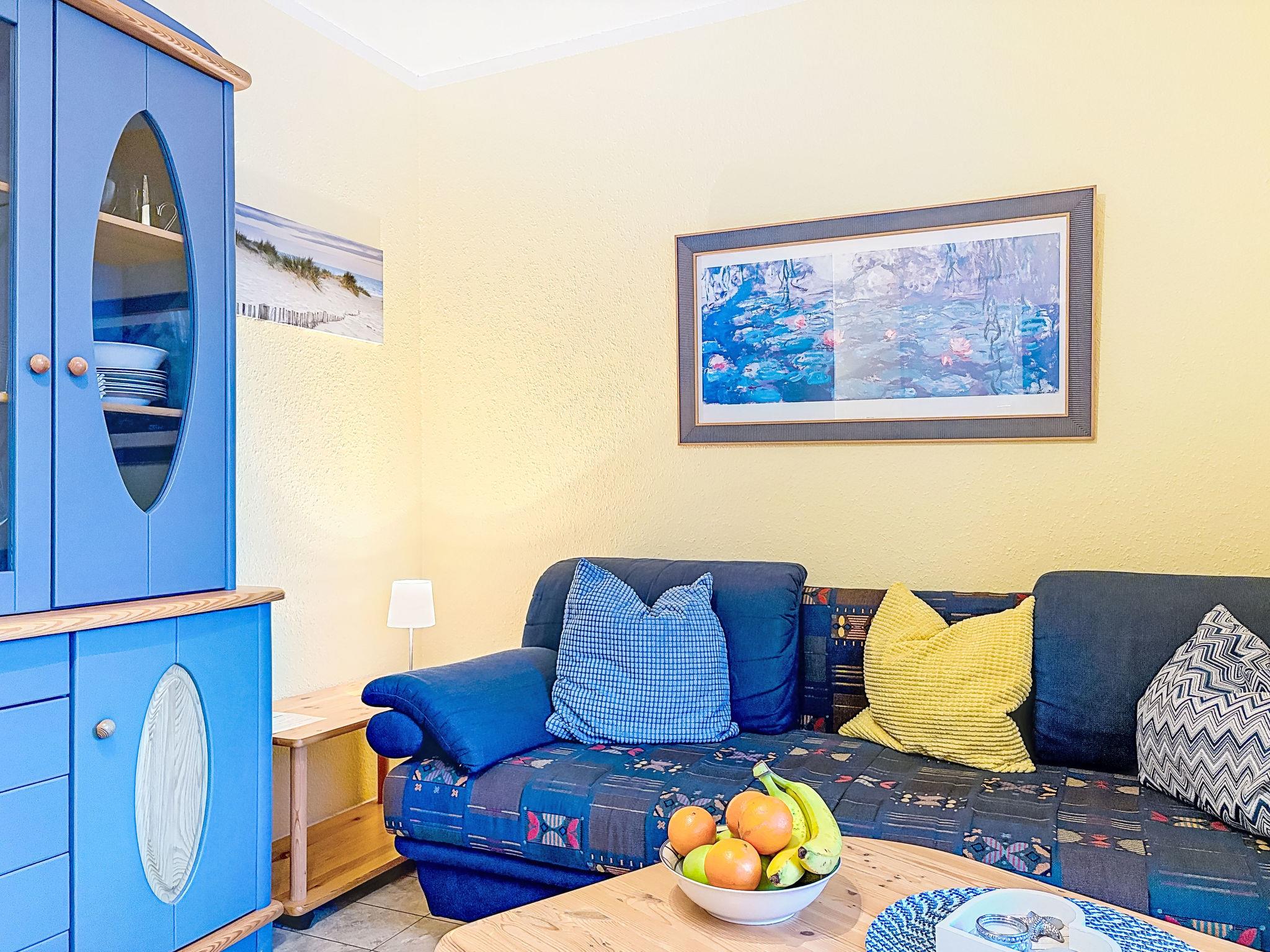 "Möwenblick", 2-Zimmer-Wohnung 42 m2 im 1. Stock. Rustikal und gemütlich eingerichtet: Wohn-/Esszimmer mit Digital-TV. Ausgang zum Balkon. 1 Zimmer mit 1 Doppelbett (180 cm, Länge 200 cm), Digital-TV. Kleine Küche (4 Kochplatten, Geschirrspüler, Toaster, Wasserkocher, Tiefkühler, elektrische Kaffeemaschine). Dusche/WC. Grosser Balkon 6 m2. Balkonmöbel. Zur Verfügung: Internet (WLAN, gratis). Parkplatz Nr. 237 beim Haus. Bitte beachten: Nichtraucher-Unterkunft.