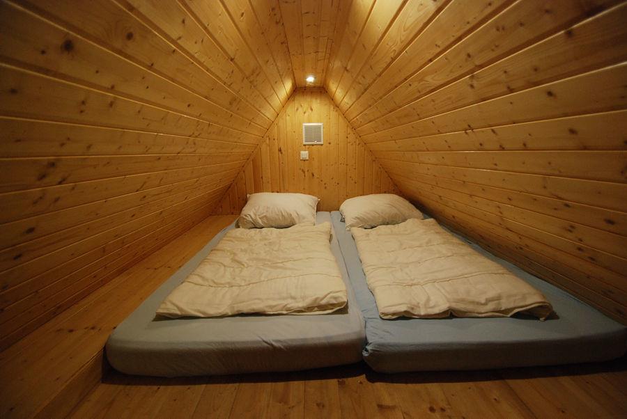 Die gut ausgestattete Küche besitzt unter anderem einen Kühlschrank, einen Herd zum Kochen und sogar eine Spülmaschine. Es gibt ein Schlafzimmer mit Doppelbett und einen niedrigen Spitzdachboden mit 2 Matratzen (für größere Kinder geeignet)