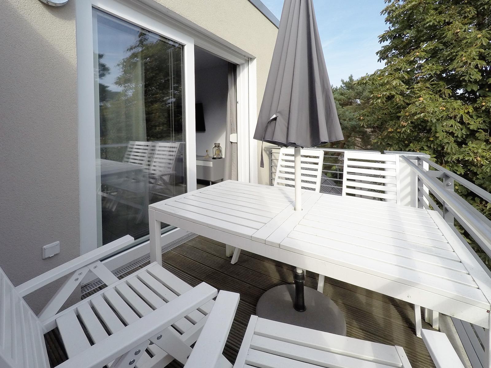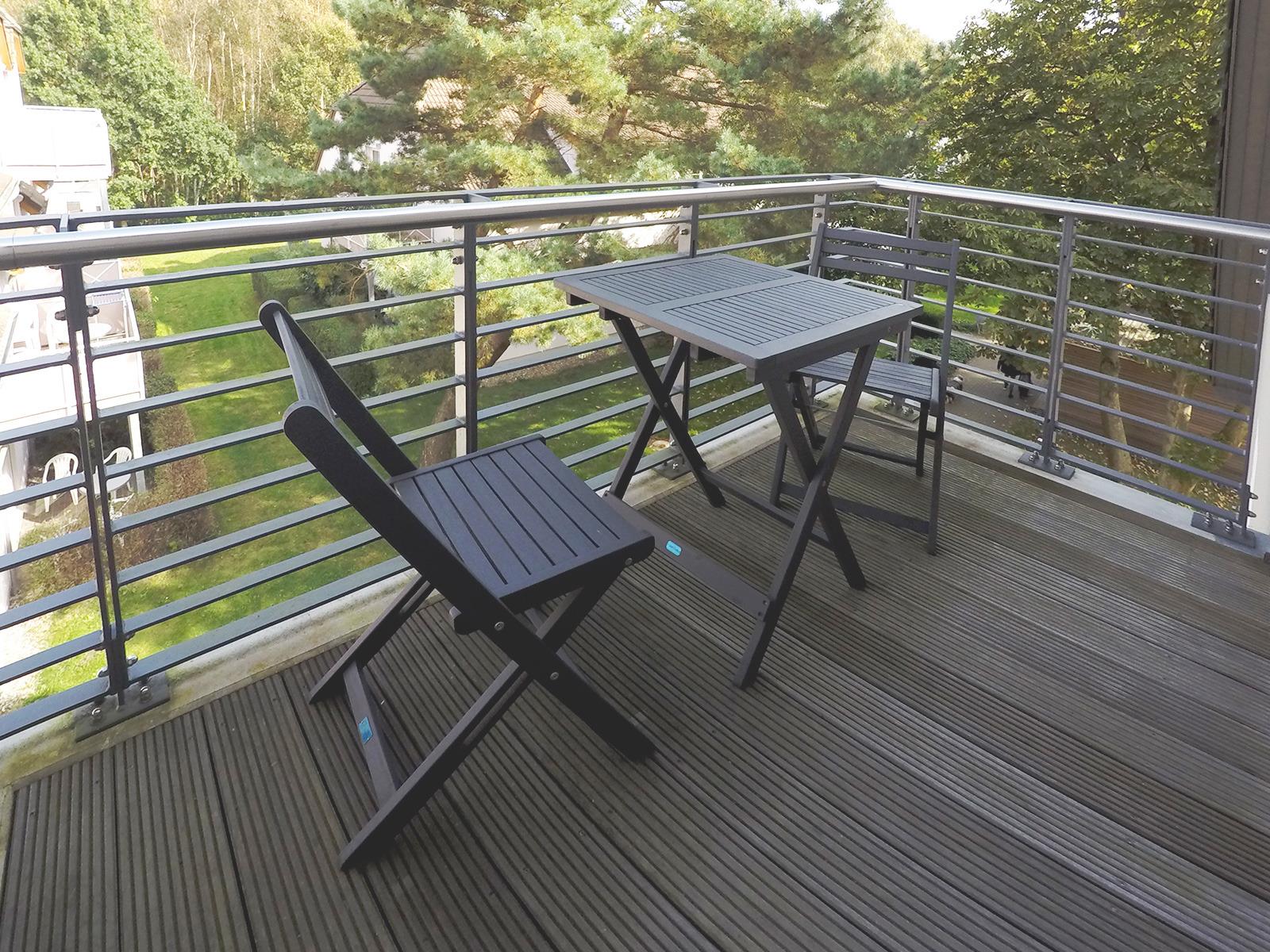 Moderne Familien-Ferienwohnung in Dierhagen-Strand, nur 350 m vom Strand, mit Balkon und Blick ins Grüne.