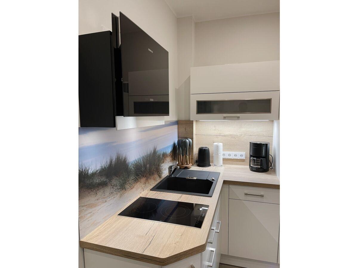 - eine offene, komplett mit Markengeräten ausgestattete Küche