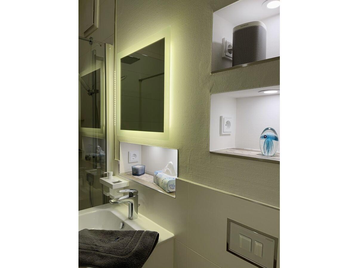 - ein Badezimmer mit großer bodengleicher Eckdusche, Fön, beleuchtetem Spiegel,
