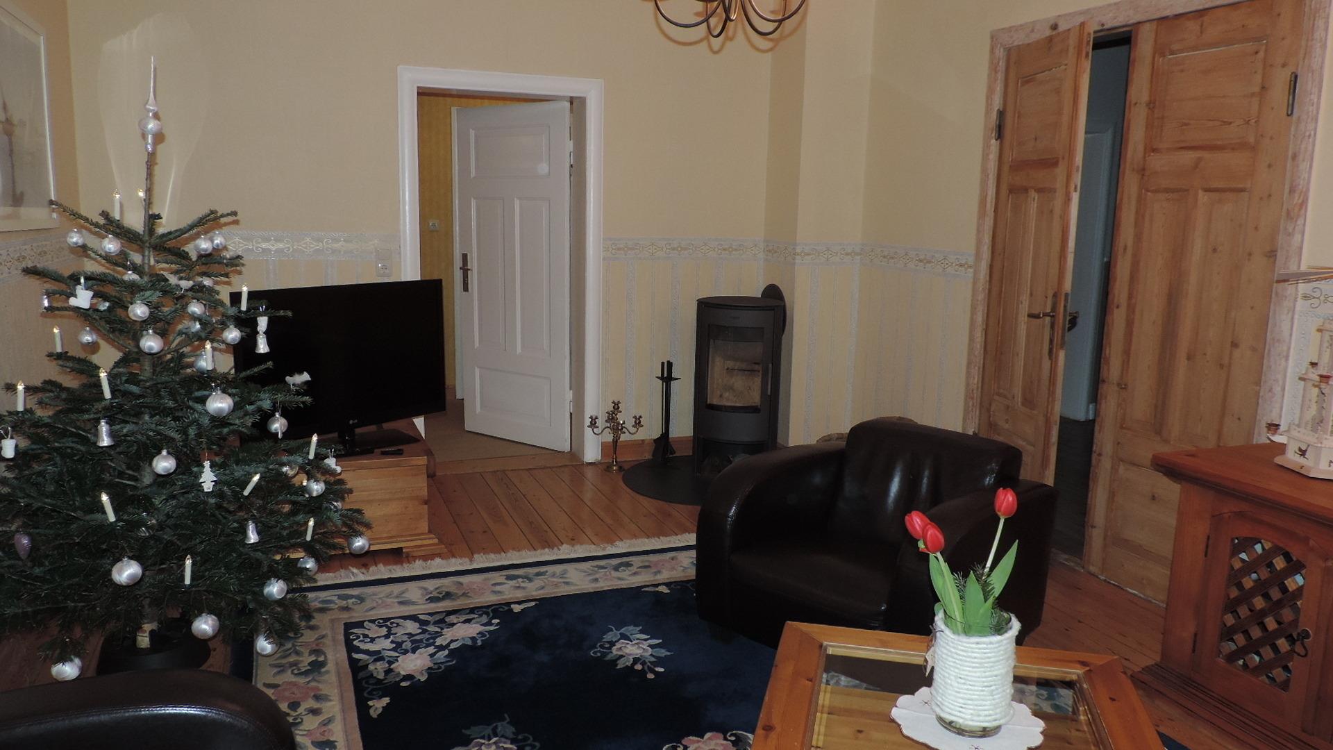 Wohnzimmer: Großzügig geschnitten mit gemütlichem Kaminofen und stilvollen Holzdielen.
