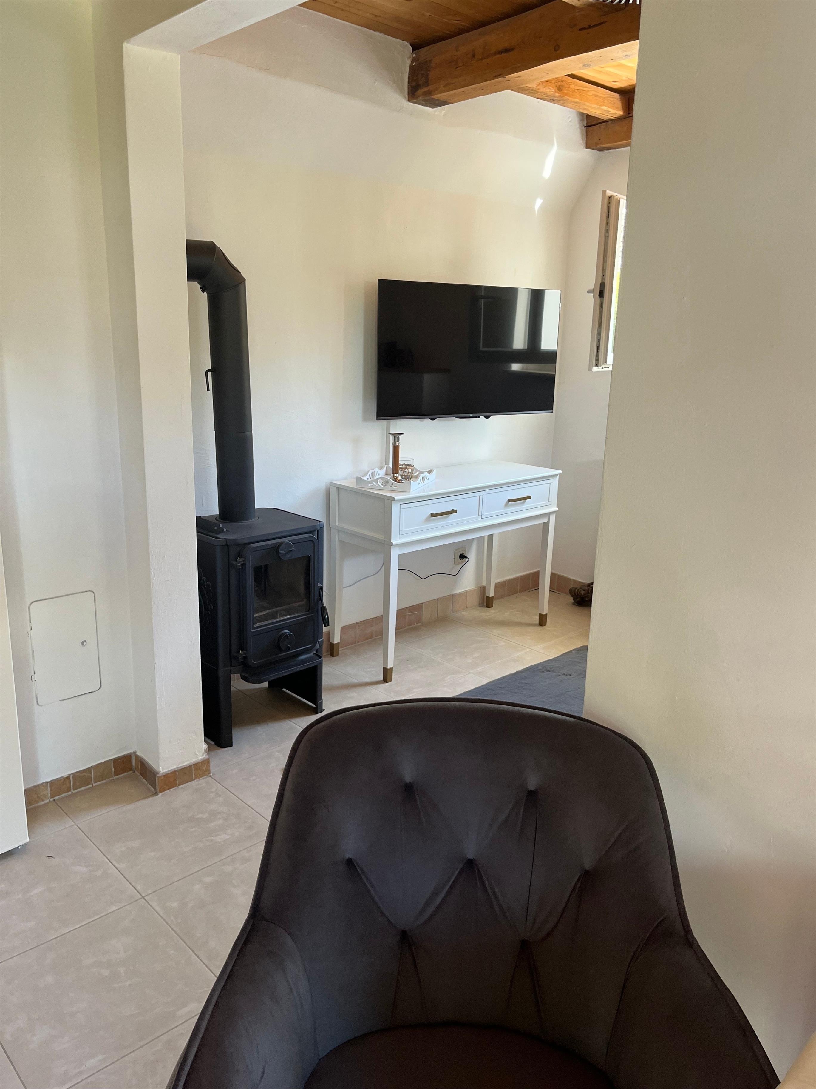 Für kalte Abende ist ein Kaminofen mit Holz vorhanden.
