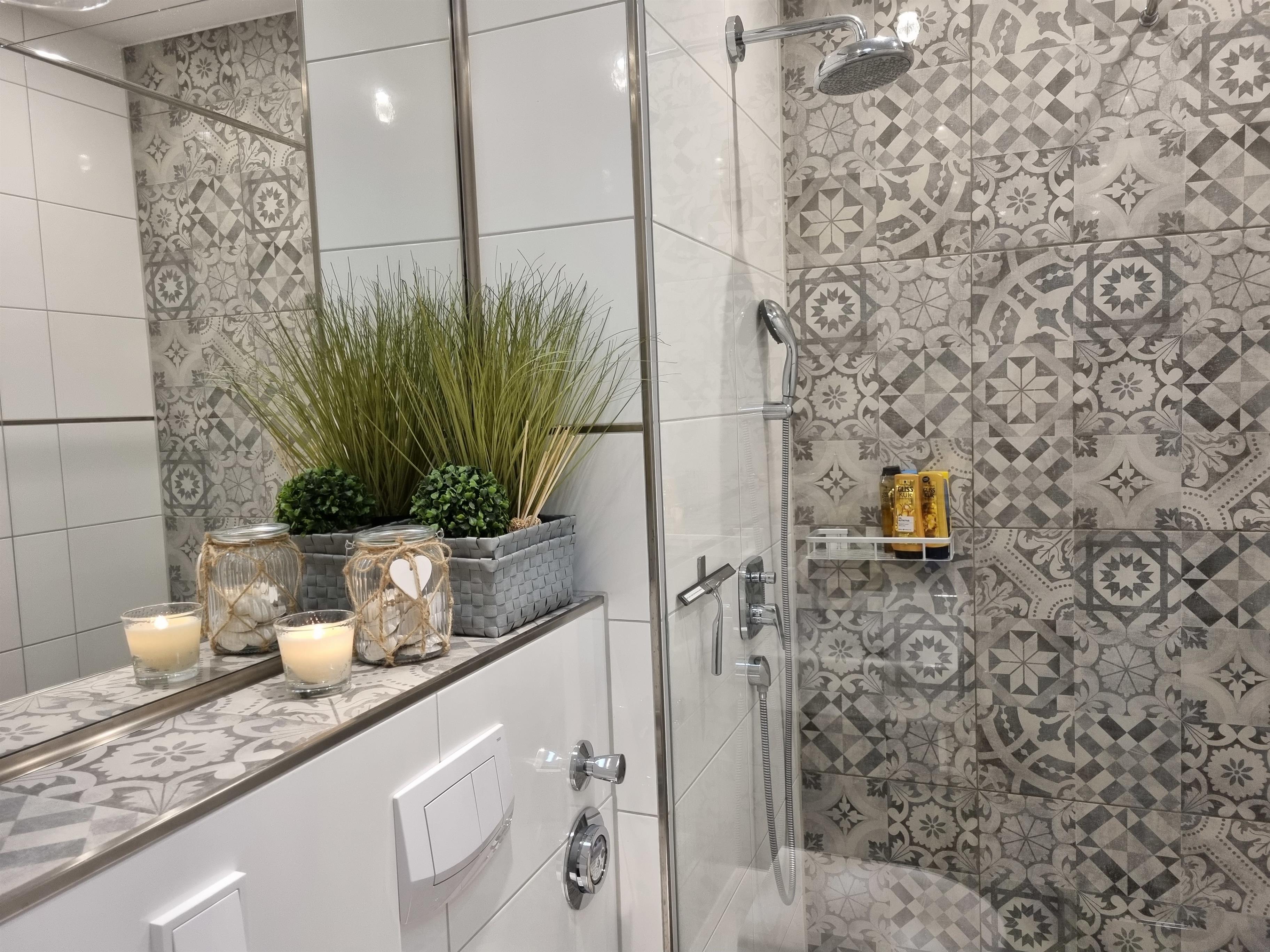 Das helle Wohlfühlbad ist mit einer Wellnessdusche und einem elektrischen Handtuchheizkörper ausgestattet. Der Panoramaspiegel mit seiner großflächigen Ablage bietet Platz für zahlreiche Utensilien.