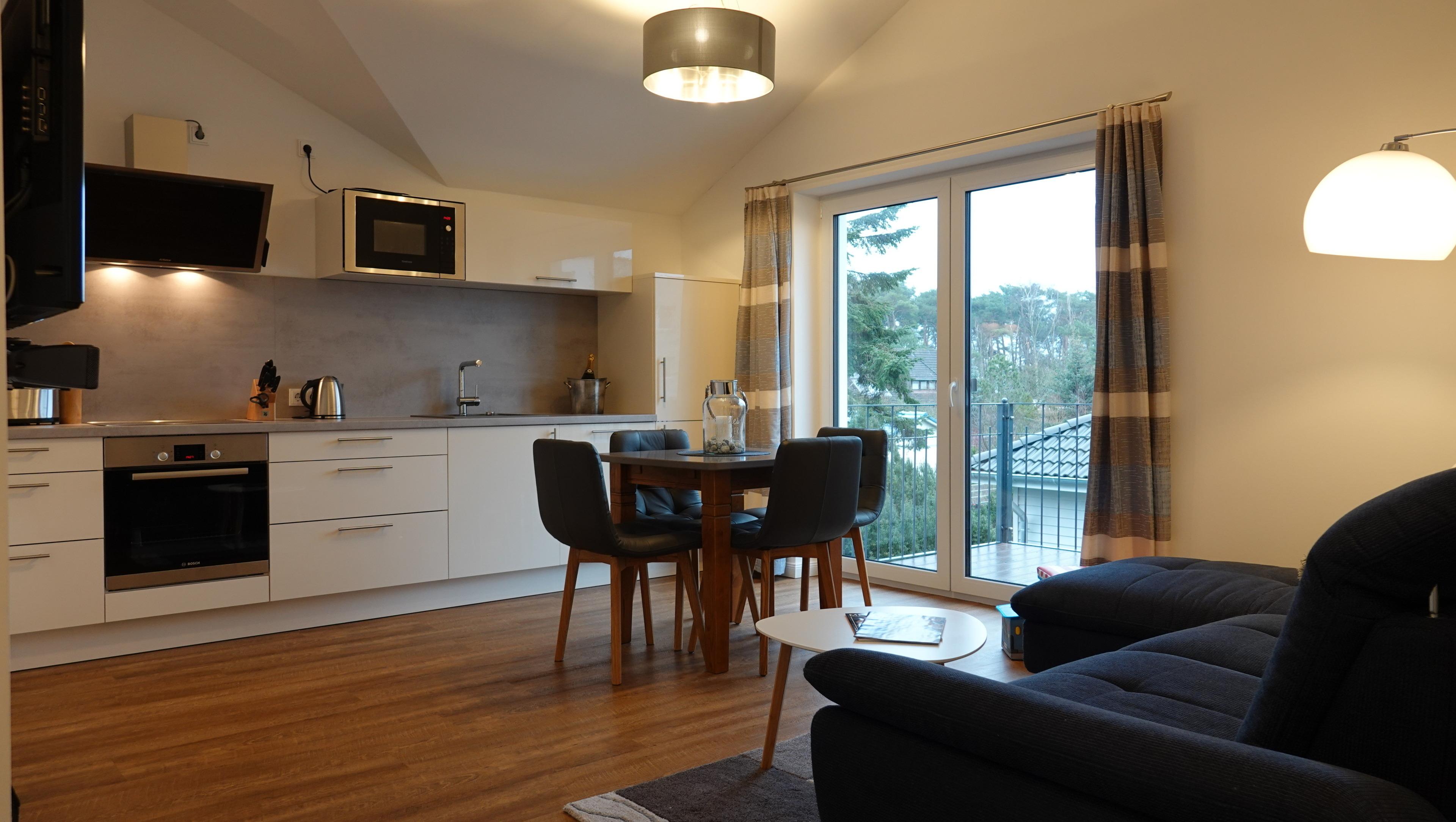 Im gemütlichen Wohnzimmer erwartet Sie eine große Schlafcouch, ein Esstisch mit 4 Essplätzen (erweiterbar auf 6),eine TV-Anlage mit Soundsystem und die hochwertig ausgestattete Küche: Induktionsherd, Backofen, Mikrowelle, Geschirrspüler, Kühlschrank mit Tiefkühlfach, Toaster, Kaffeemaschine und Wasserkocher.