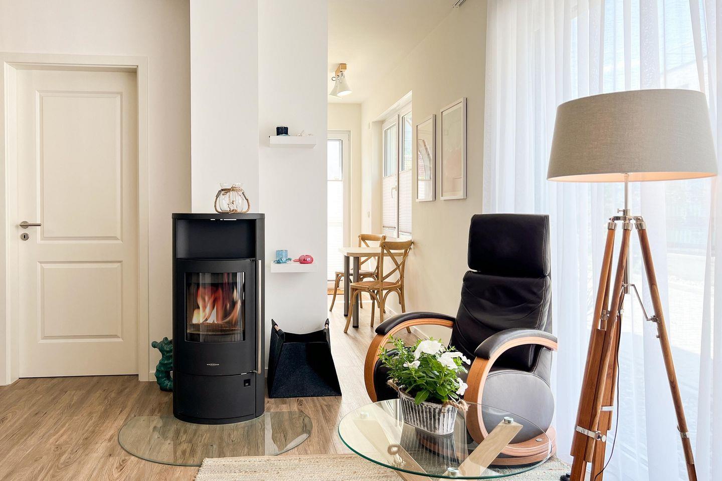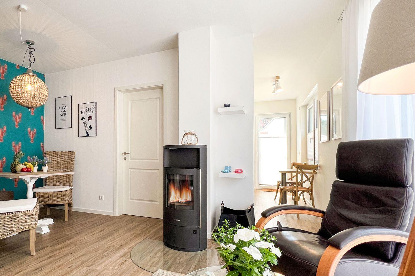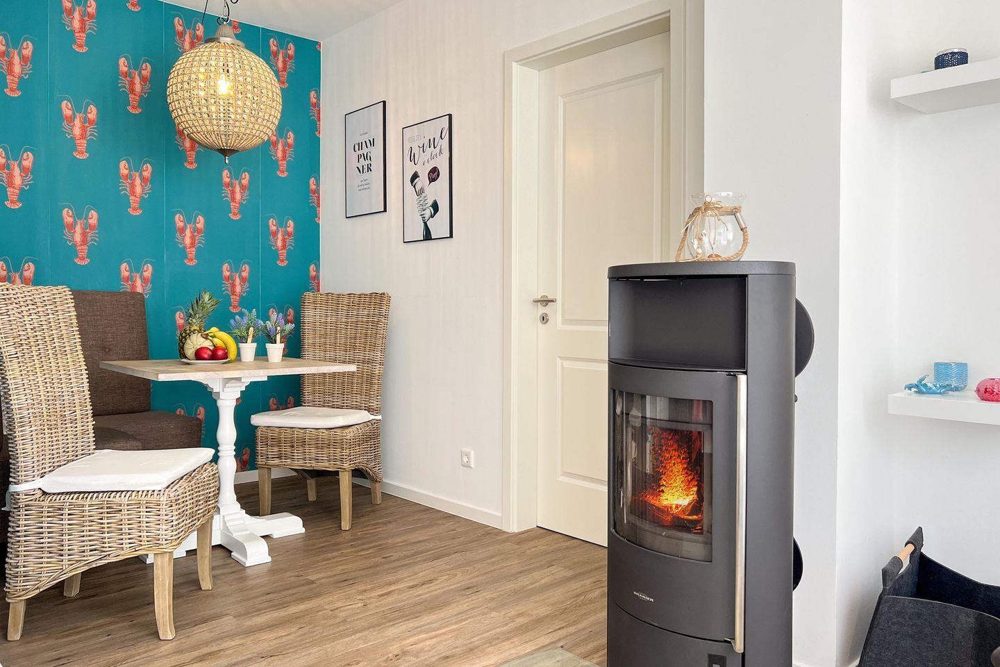 Der Wohn- und Essbereich bildet das Herzstück der Wohnung. Eine bequeme Sitzgruppe lädt zum Verweilen ein, während der Kamin besonders an kühleren Tagen für eine warme und behagliche Atmosphäre sorgt. Das Sofa bietet zusätzlich eine Schlafmöglichkeit für eine weitere Person.