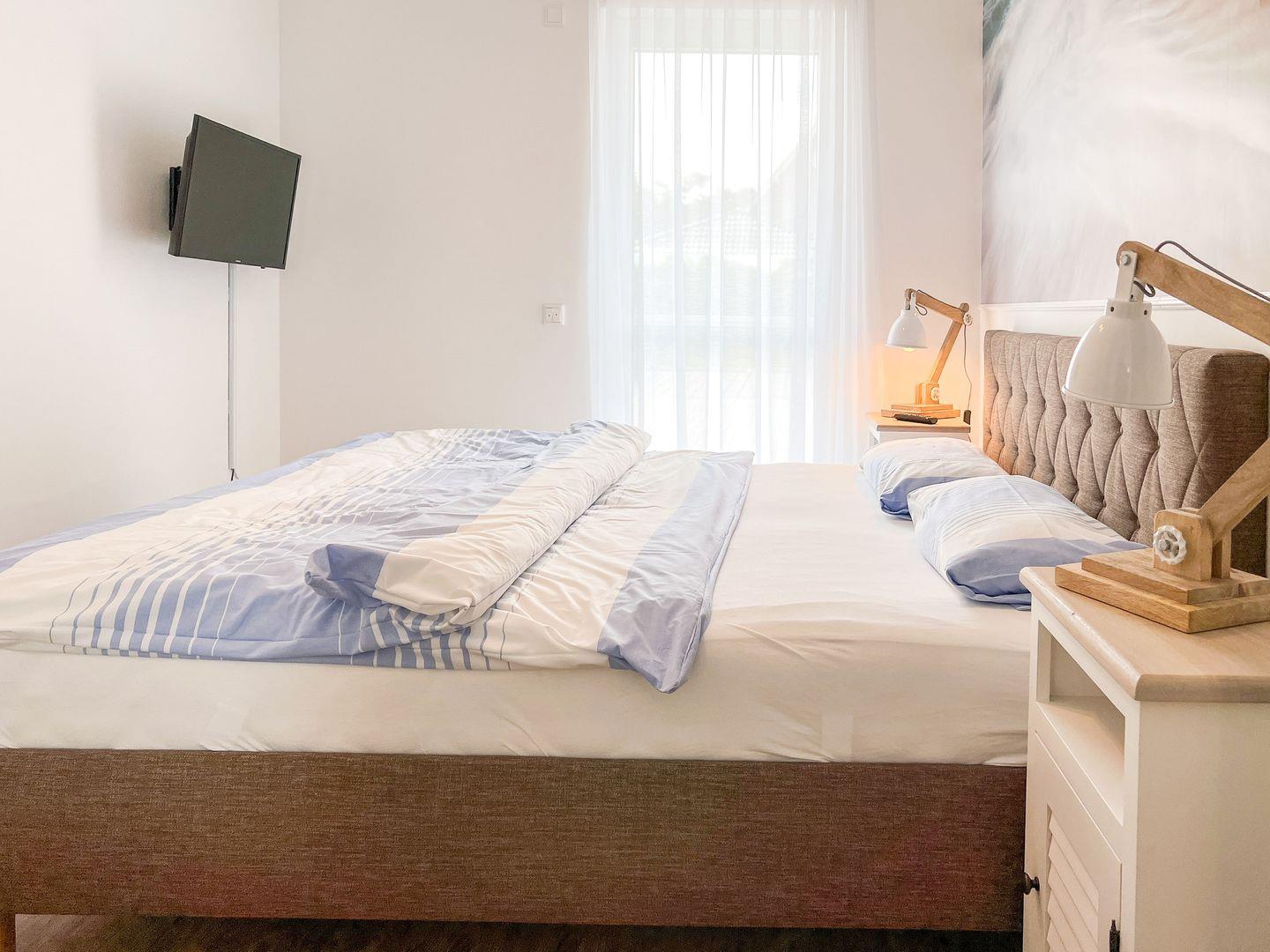 Im Schlafzimmer erwartet Sie ein komfortables Boxspringbett, das für erholsame Nächte sorgt und Ihnen den perfekten Start in den nächsten Urlaubstag ermöglicht.