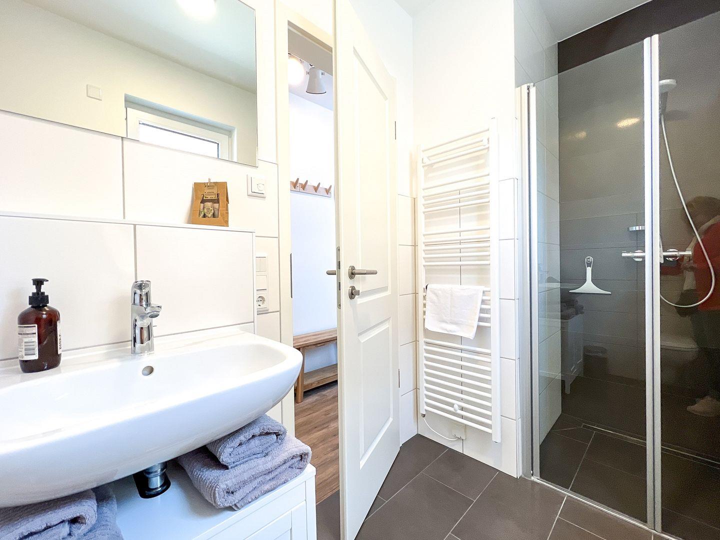 Das moderne Badezimmer ist mit einer ebenerdigen Dusche und Fußbodenheizung ausgestattet und bietet damit zusätzlichen Komfort.
