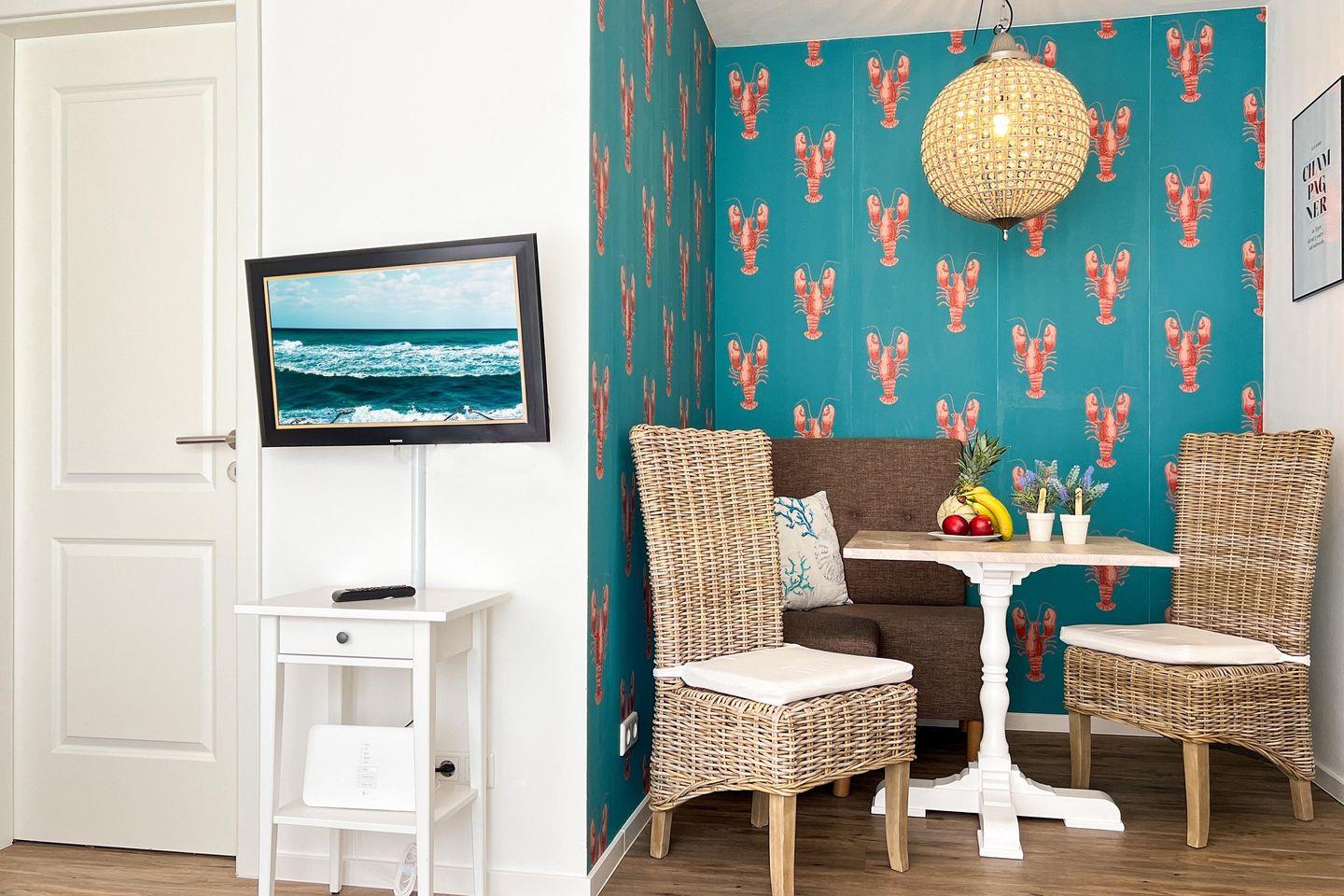 Die Wohnung No. 1 im Haus „Meerquartier“ in Dierhagen-Strand ist eine komfortable Erdgeschoss-Ferienwohnung für bis zu 3 Personen. Eine Terrasse lädt zu entspannten Stunden im Freien ein. Wohnbereich mit Kamin und Schlafsofa, moderne Küche mit Kapsel-Kaffeemaschine sowie ein Schlafzimmer mit Boxspringbett sorgen für hohen Wohnkomfort. WLAN, Flachbild-TV und ein PKW-Stellplatz stehen zur Verfügung.