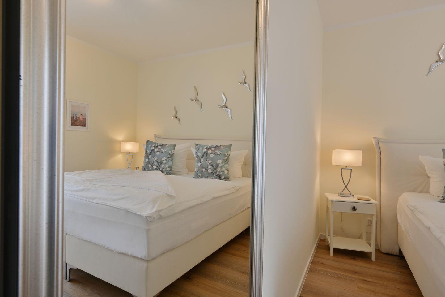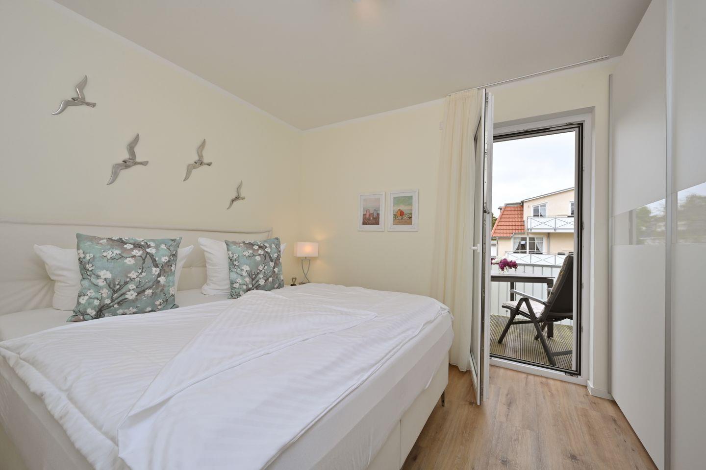 Komfortable 56?m² Meerquartier-Wohnung im 1. OG für 2 Personen, Aufzug vorhanden. Gemütlicher Wohnbereich mit Kamin, moderne Küche, Schlafzimmer mit Boxspringbett, Bad mit bodenebener Dusche und Fußbodenheizung. Nord-Balkon mit ruhigem Ausblick, WLAN, Pkw-Stellplatz, sichere Fahrradabstellmöglichkeiten. Haustierfreundlich, wenige Gehminuten zum Ostseestrand – perfekt für entspannte Urlaubstage.