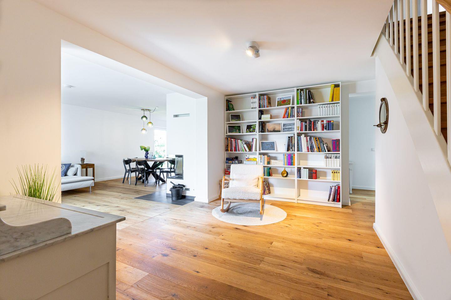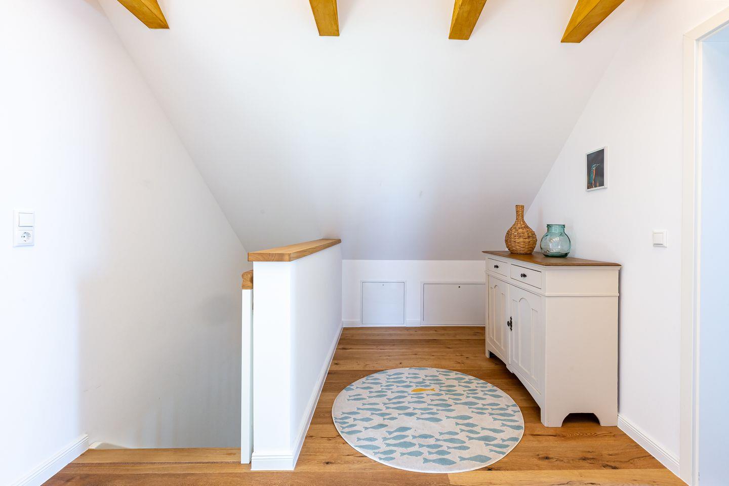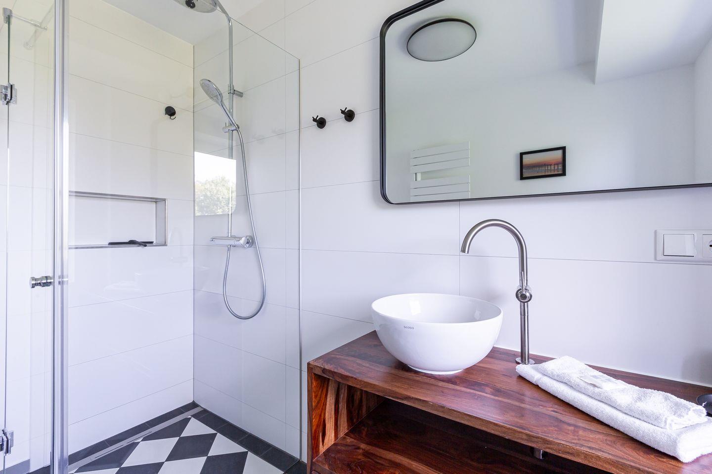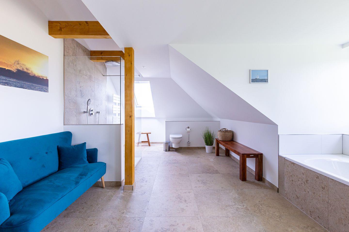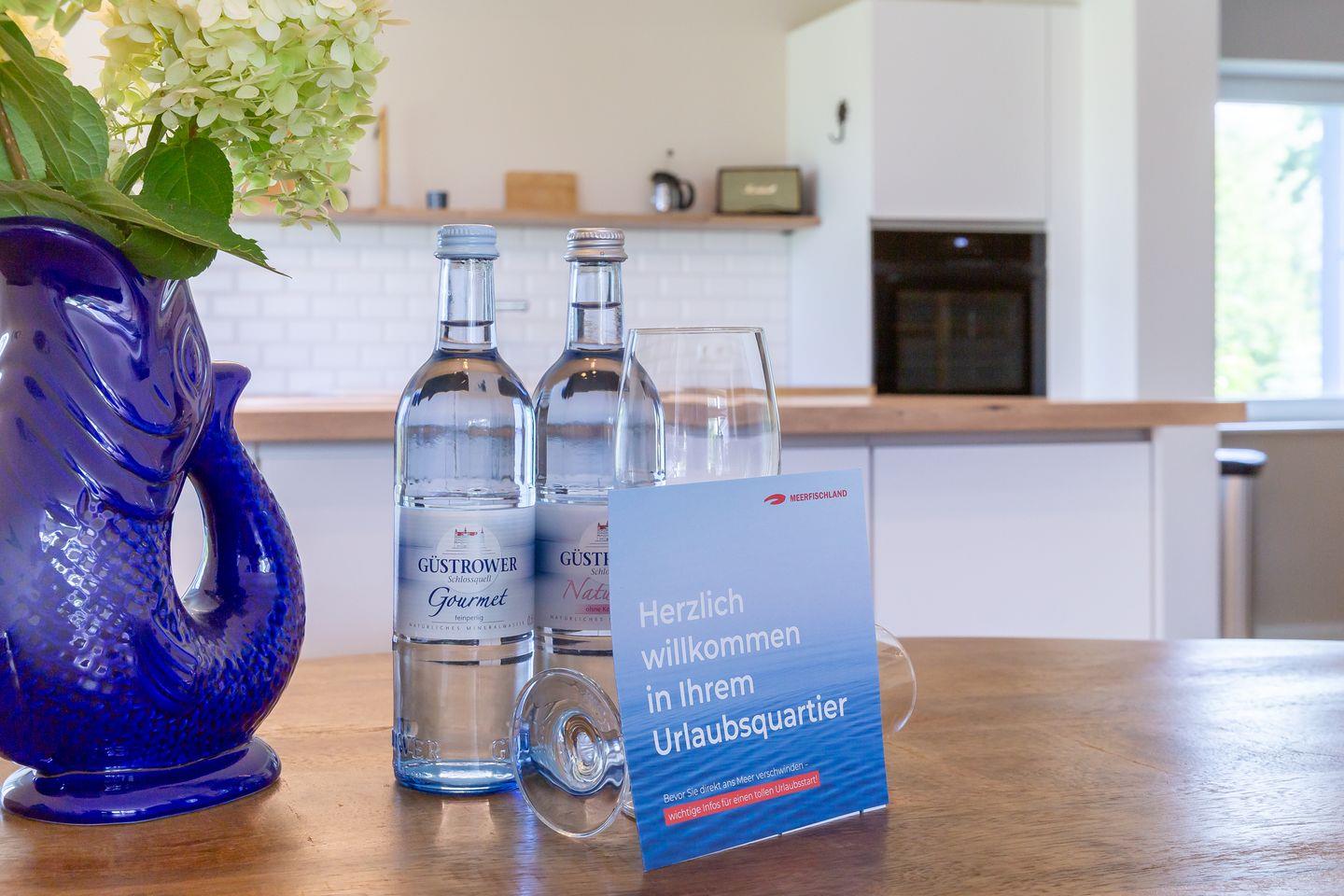 Willkommen in deinem ganz persönlichen Rückzugsort. In Eenhoorn erwartet dich hochwertiges Interieur, das Stil und Komfort perfekt miteinander verbindet. Die offene Küche ist das Herzstück des Hauses und lädt dazu ein, gemeinsam zu kochen und gesellige Stunden am großen Esstisch zu verbringen. Im Wohnzimmer befindet sich ein gemütliches Sofa, auf dem du dich am Abend vor dem knisternden Kamin entspannen kannst. Das Erdgeschoss beherbergt außerdem ein urgemütliches und liebevoll eingerichtetes Schlafzimmer sowie ein erstes Duschbad. In der oberen Etage erwarten dich zwei weitere heimelige Schlafzimmer - eins mit Doppelbett und eins mit getrennten Betten, dass sich sehr gut als Kinderzimmer nutzen lässt. Kleiderschränke, Verdunklungsmöglichkeiten und Insektenschutz an den Fenstern sorgen zudem für einen erholsamen Schlaf. Ein echtes Highlight: Das Traumbad mit einer Badewanne, von der du einen atemberaubenden Blick auf den Bodden genießt. Die große Regendusche und das stylische Sofa im Bad machen diesen Ort zu einer Wohlfühloase und runden das Luxus-Feeling perfekt ab.