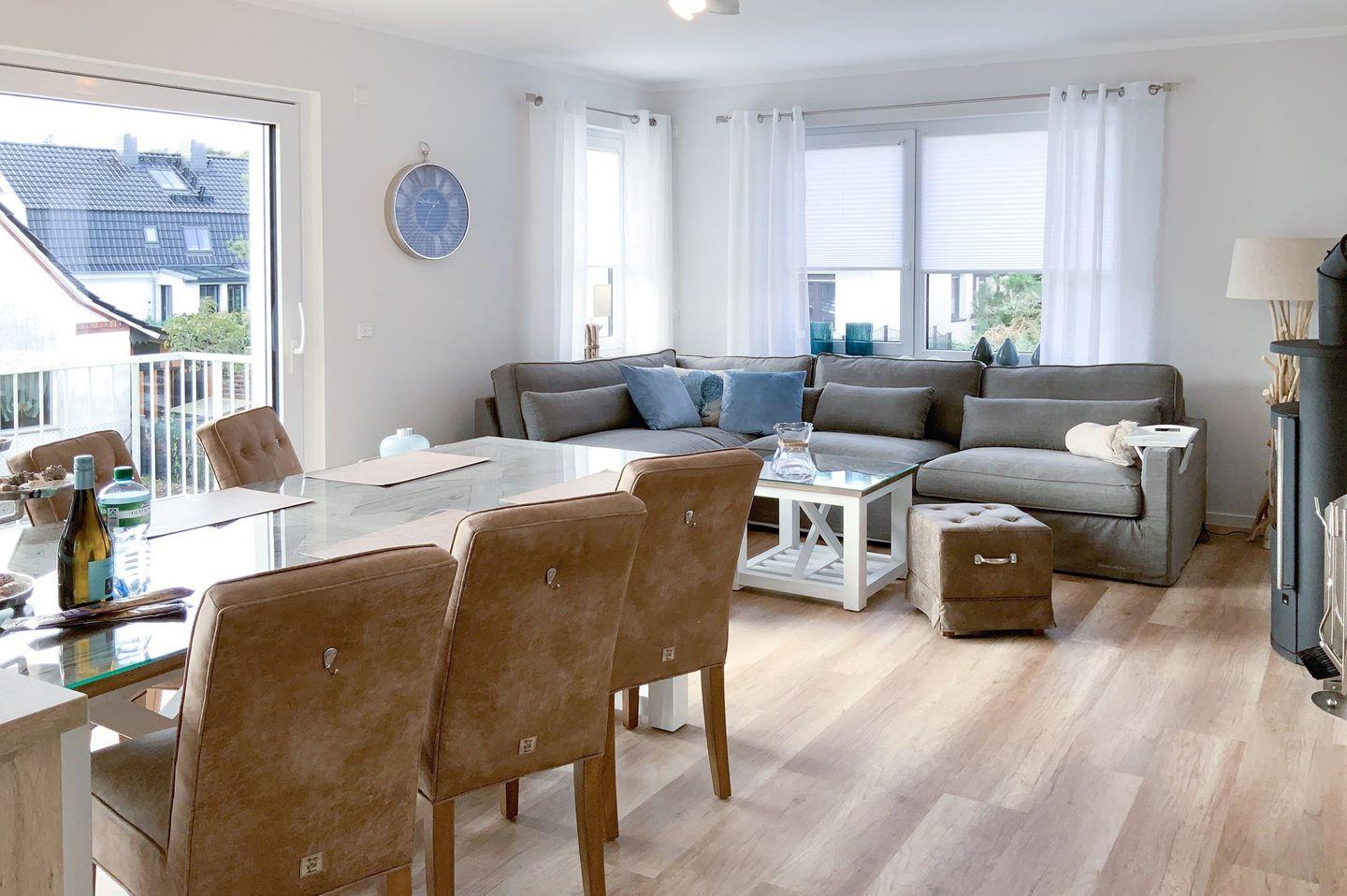 Stilvolles 120?m² Appartement für 6 Personen im 1. OG mit 3 Schlafzimmern, 2 Bädern + Gäste-WC, offenem Wohnbereich mit Kamin, voll ausgestatteter Küche, Fußbodenheizung, WLAN und 3 TVs. Allergiker-, kinder- und rollstuhlfreundlich. Nur 300?m zum Strand, Balkon mit Gartenmöbeln, 2 Privatparkplätze inklusive. Perfekt für Familien oder Freunde für erholsame Urlaubstage an der Ostsee.