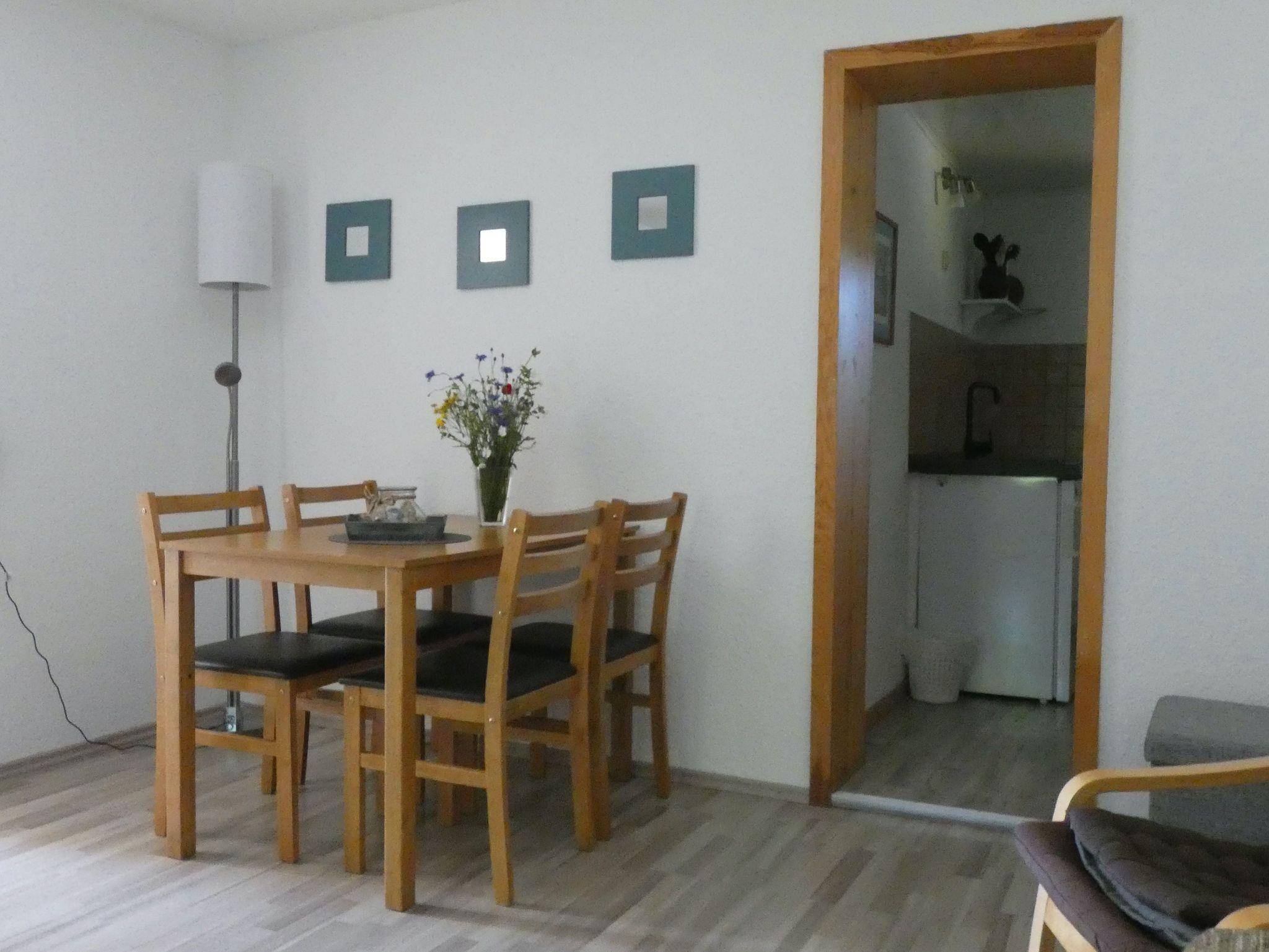 Ein Durchgang vom Wohnzimmer verbindet zur Küche. Die Küche ist mit einer Mikrowelle, einem Kühlschrank mit Gefrierfach, 2 Elektroherdplatten, Kaffeemaschine sowie Eier- und Wasserkocher ausgestattet.