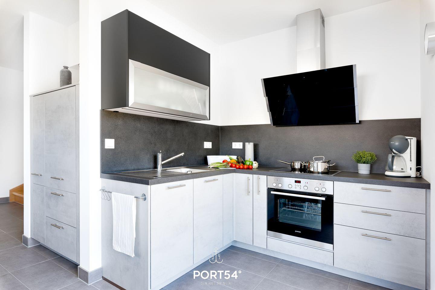 Im Erdgeschoss erwartet Dich eine offene, voll ausgestattete Küche, ideal für die Zubereitung eigener Mahlzeiten.