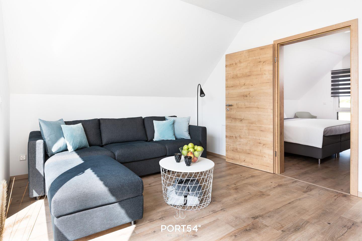 Auf derselben Etage befindet sich zudem das Wohnzimmer, das mit einem komfortablen Schlafsofa ausgestattet ist.