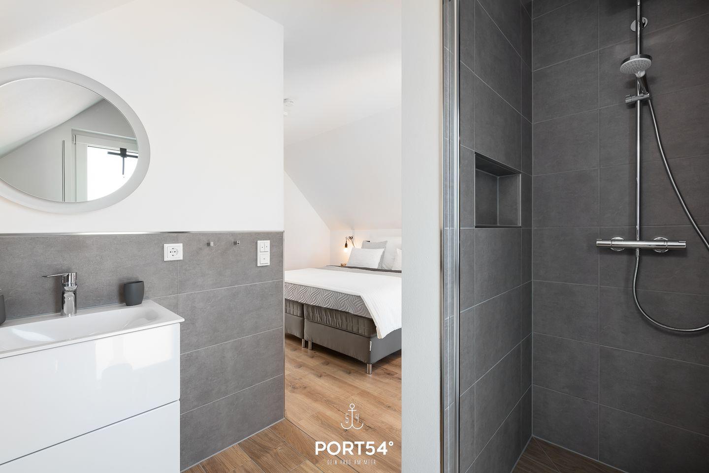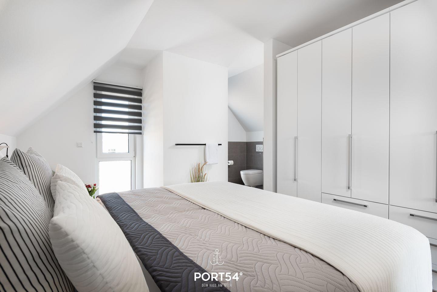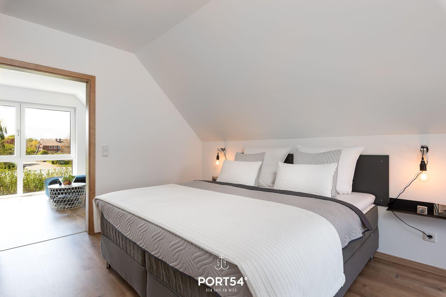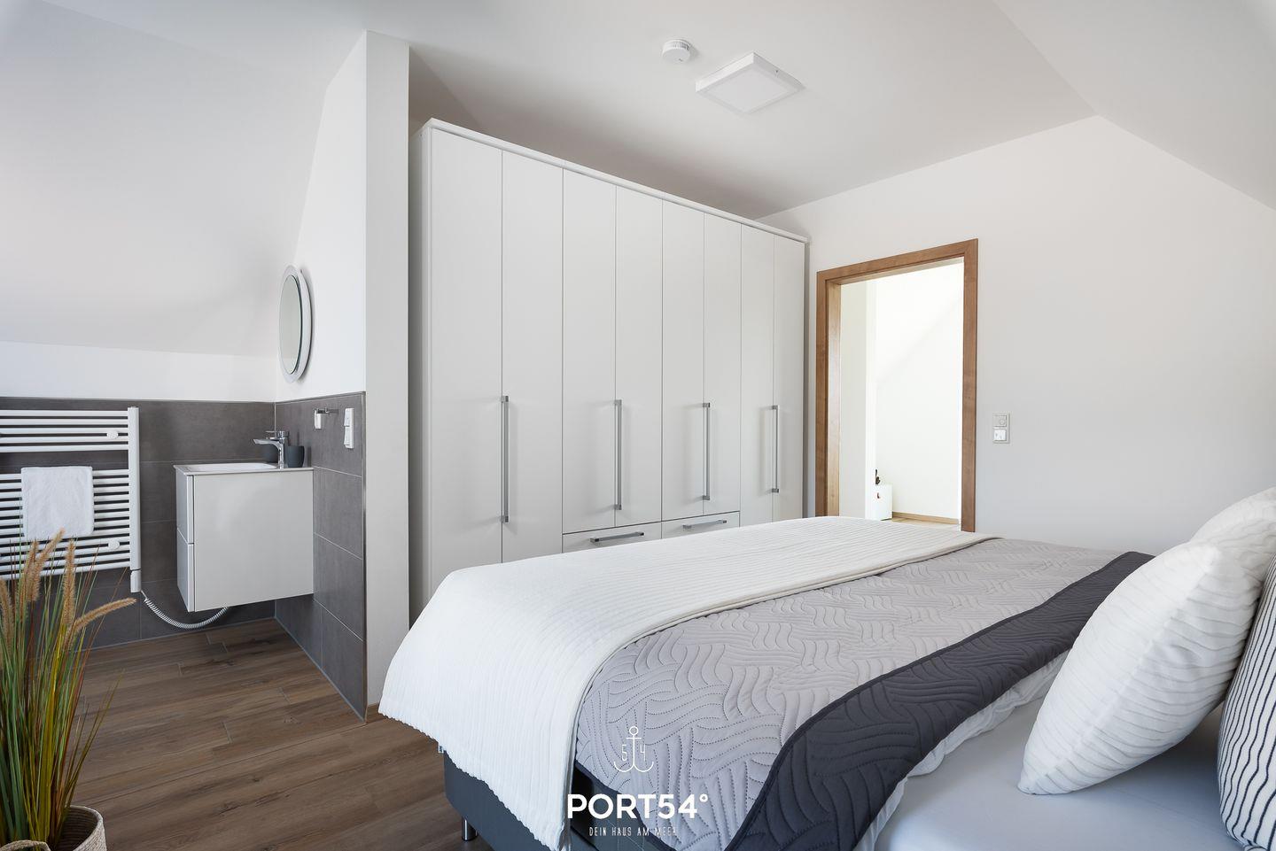 Im Obergeschoss verbringst Du erholsame Nächte im stilvollen Schlafzimmer mit direktem Zugang zu einem charmant integrierten, ebenerdigen Bad.