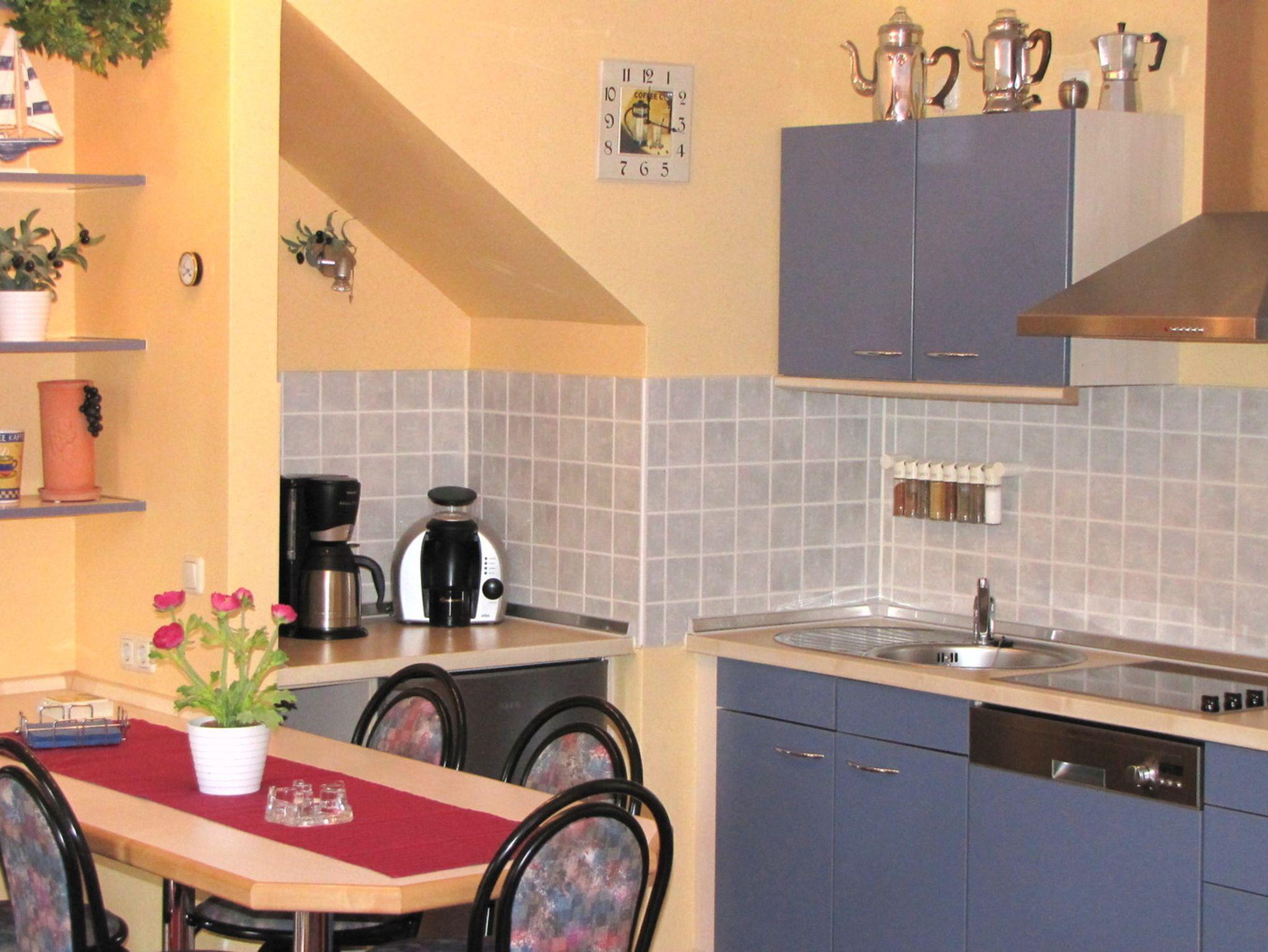 Die Küchenzeile mit dem davor befindlichen Essplatz ist unter anderem ausgestattet mit Spülmaschine, Cerankochfeld, Dunstabzug, Wasserkocher, Toaster, Kaffeemaschine, Espressomaschine (Tassimo), Mikrowelle und natürlich reichhaltigem Zubehör sowie mehr als ausreichendem Geschirr und Besteck.