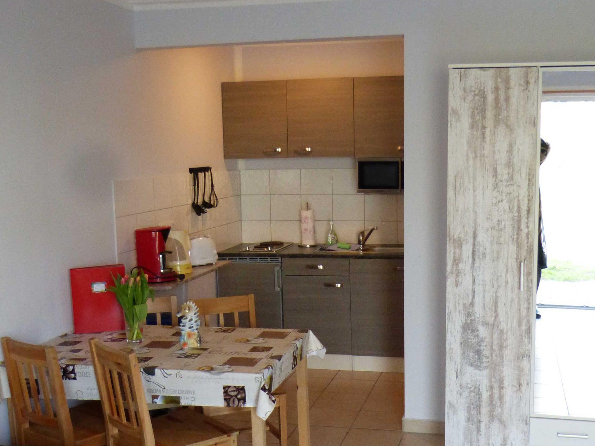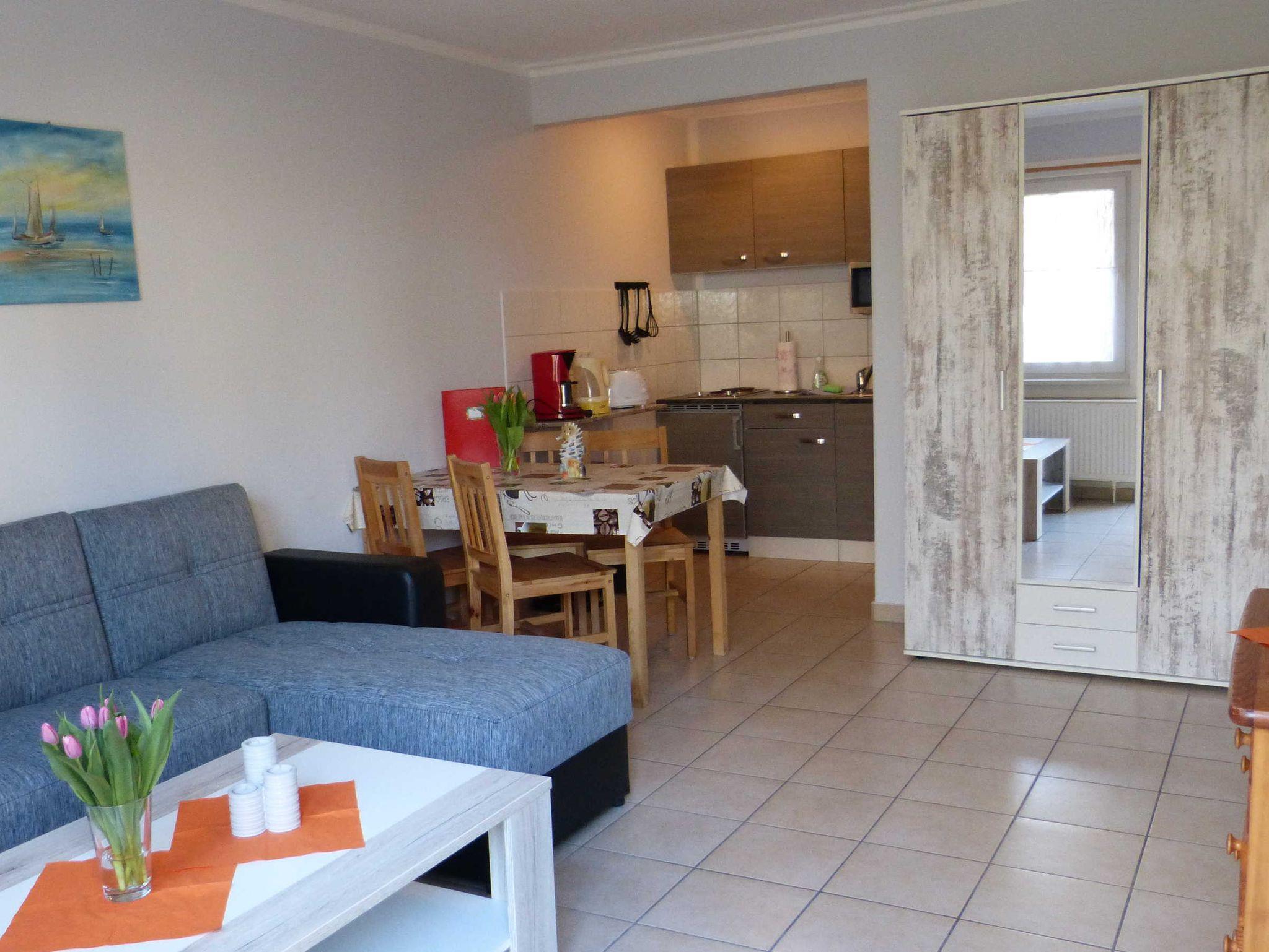 Die Ferienwohnung liegt im Erdgeschoß, hat eine Größe von 36 m² und verfügt über einen Wohnraum mit Pantry, zwei Schlafzimmer mit je einem Doppelbett, ein Badezimmer und eine Terrasse. Im Wohnzimmer ist zudem eine Aufbettung möglich (Schlafsofa). In der Miniküche befinden sich zwei Kochplatten, eine Kaffemaschine, ein Wasserkocher, ein Toaster, ein Kühlschrank mit Gefrierfach sowie eine Mikrowelle. Wäsche kann zugebucht werden (Handtuch- Bettwäschepaket 25,00 pro Person). Im Ferienpark kann ein Grill gemietet werden, ebenso ist die Nutzung einer gemeinschaftlichen Waschmaschine möglich (gegen Gebühr).