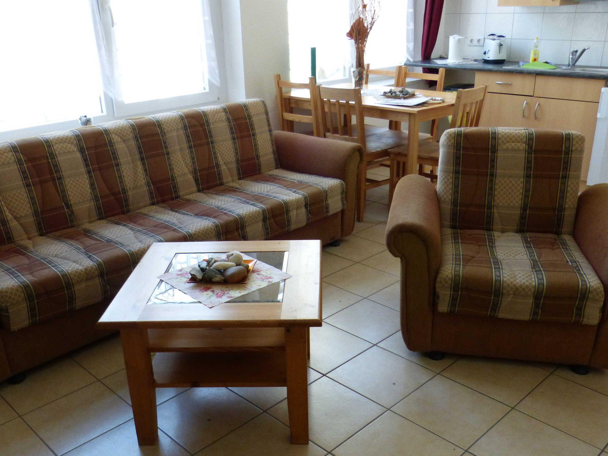 Die Ferienwohnung liegt im 1. Obergeschoß, hat eine Größe von 38 m² und verfügt über einen Wohnraum mit Pantry, ein Schlafzimmer mit einem Doppel- und einem 3-er Etagenbett und ein Badezimmer. Die Terrasse vor dem Haus kann gemeinschaftlich genutzt werden. In der Miniküche befinden sich zwei Kochplatten, eine Kaffemaschine, ein Wasserkocher, ein Toaster, ein Kühlschrank mit Gefrierfach sowie eine Mikrowelle. Wäsche kann zugebucht werden ((Handtuch- Bettwäschepaket 25,00 pro Person). Im Ferienpark kann ein Grill gemietet werden, ebenso ist die Nutzung einer gemeinschaftlichen Waschmaschine möglich (gegen Gebühr).