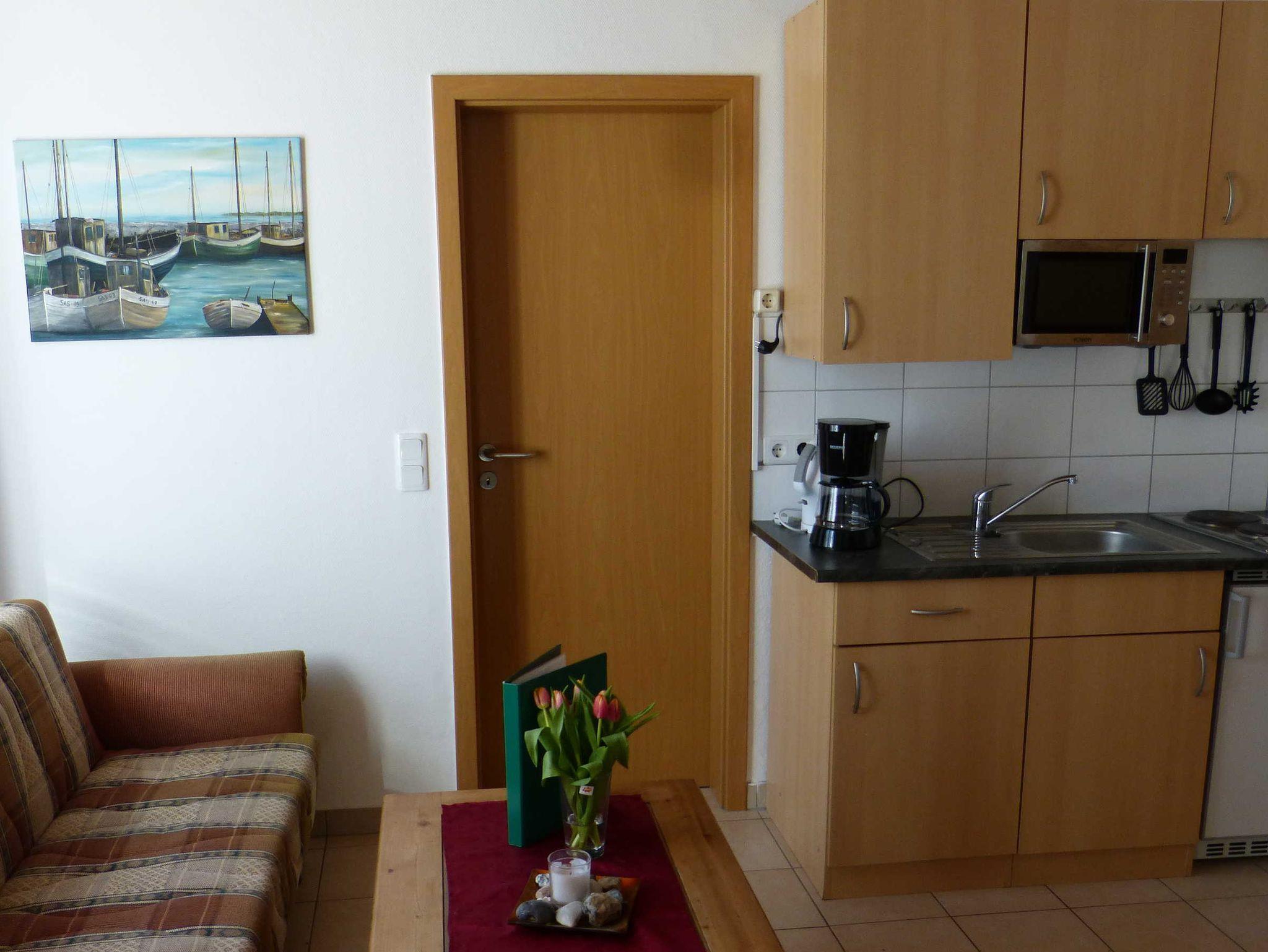 Die Ferienwohnung liegt im 1. Obergeschoß, hat eine Größe von 36 m² und verfügt über einen Wohnraum mit Pantry, ein Schlafzimmer mit einem Doppel- und einem 3-er Etagenbett und ein Badezimmer. Die Terrasse vor dem Haus kann gemeinschaftlich genutzt werden. In der Miniküche befinden sich zwei Kochplatten, eine Kaffemaschine, ein Wasserkocher, ein Toaster, ein Kühlschrank mit Gefrierfach sowie eine Mikrowelle. Wäsche kann zugebucht werden ((Handtuch- Bettwäschepaket 25,00 pro Person). Im Ferienpark kann ein Grill gemietet werden, ebenso ist die Nutzung einer gemeinschaftlichen Waschmaschine möglich (gegen Gebühr).