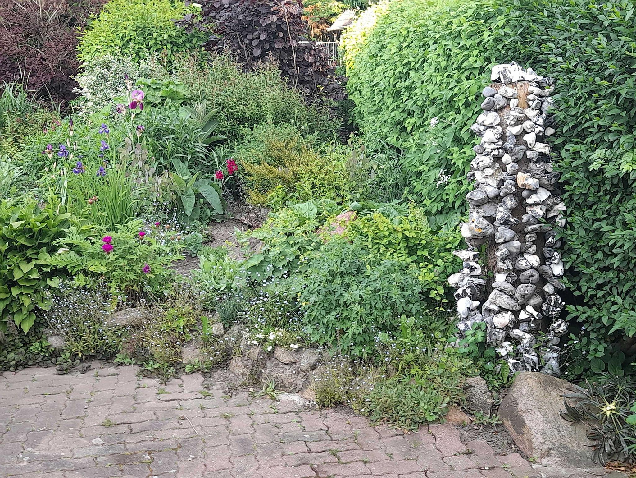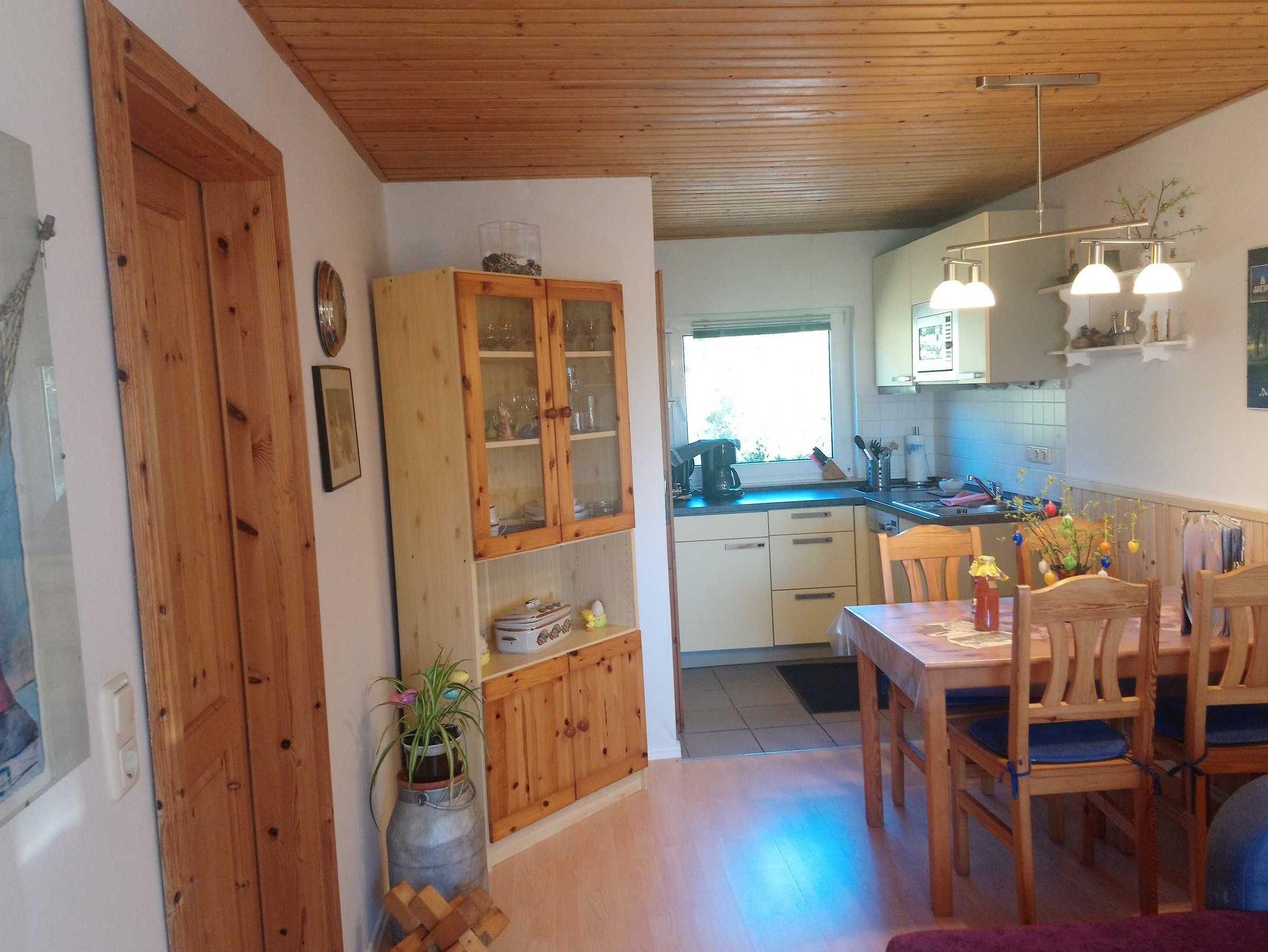 Kleine, idyllisch gelegene Ferienwohnung (ca. 45 qm) mit Blick in den Blumengarten für bis zu 3 Personen. Es gibt ein Familienschlafzimmer mit 1 Doppel- und 1 Einzelbett. Der Wohnbereich ist aufgeteilt in Küche mit Esstisch und gemütlicher Sofaecke. Die Küchenzeile ist ausgestattet mit Kühlschrank und Frostfach, Kochfeld, Geschirrspüler sowie einer Mikrowelle. Ein kleiner Backofen ist auch vorhanden. Es gibt ein Duschbad mit WC. Eine Terrasse schließt sich direkt an die Ferienwohnung an. Ein paar Schritte weiter befindet sich noch eine Grillecke im Grünen.