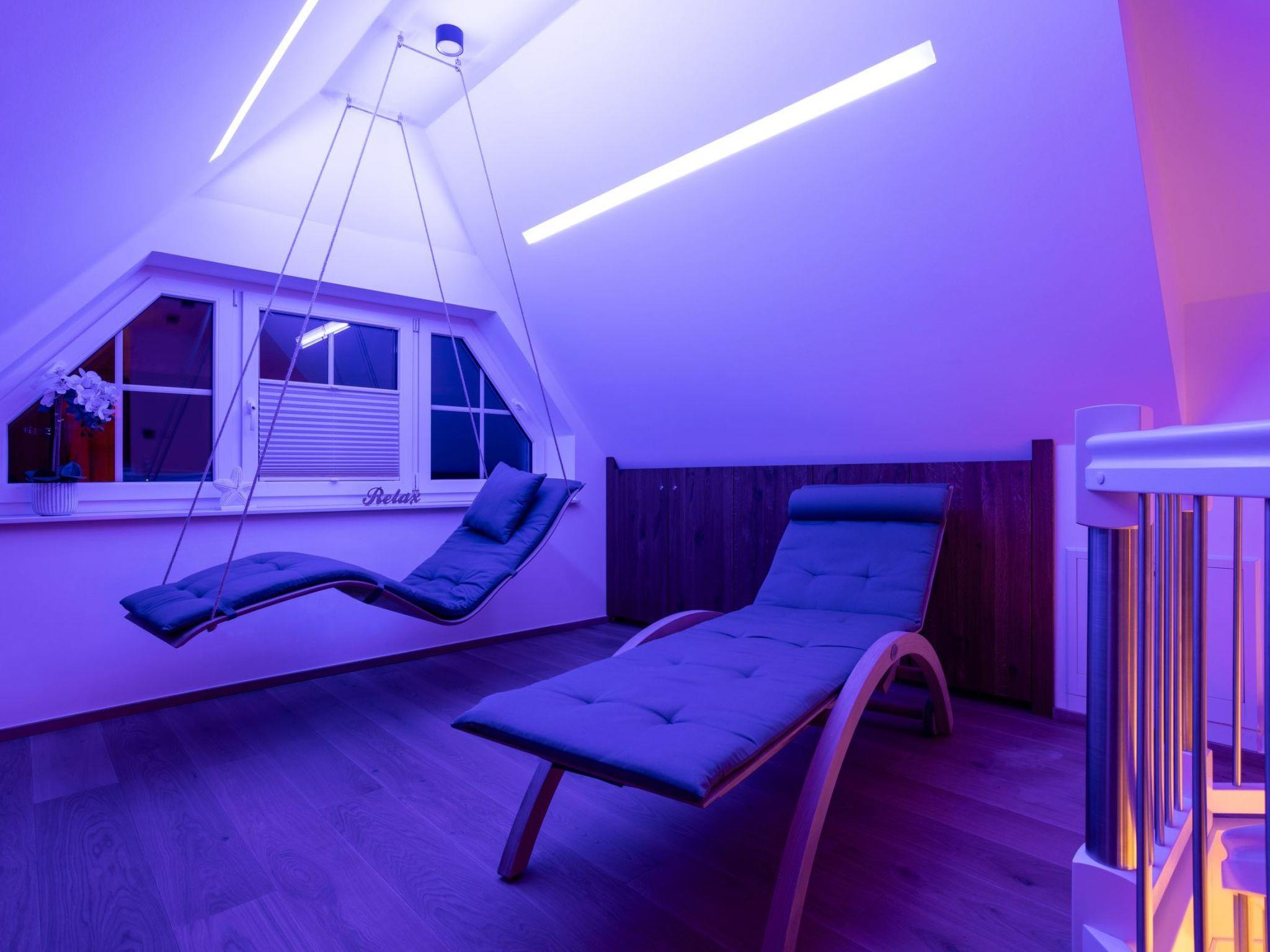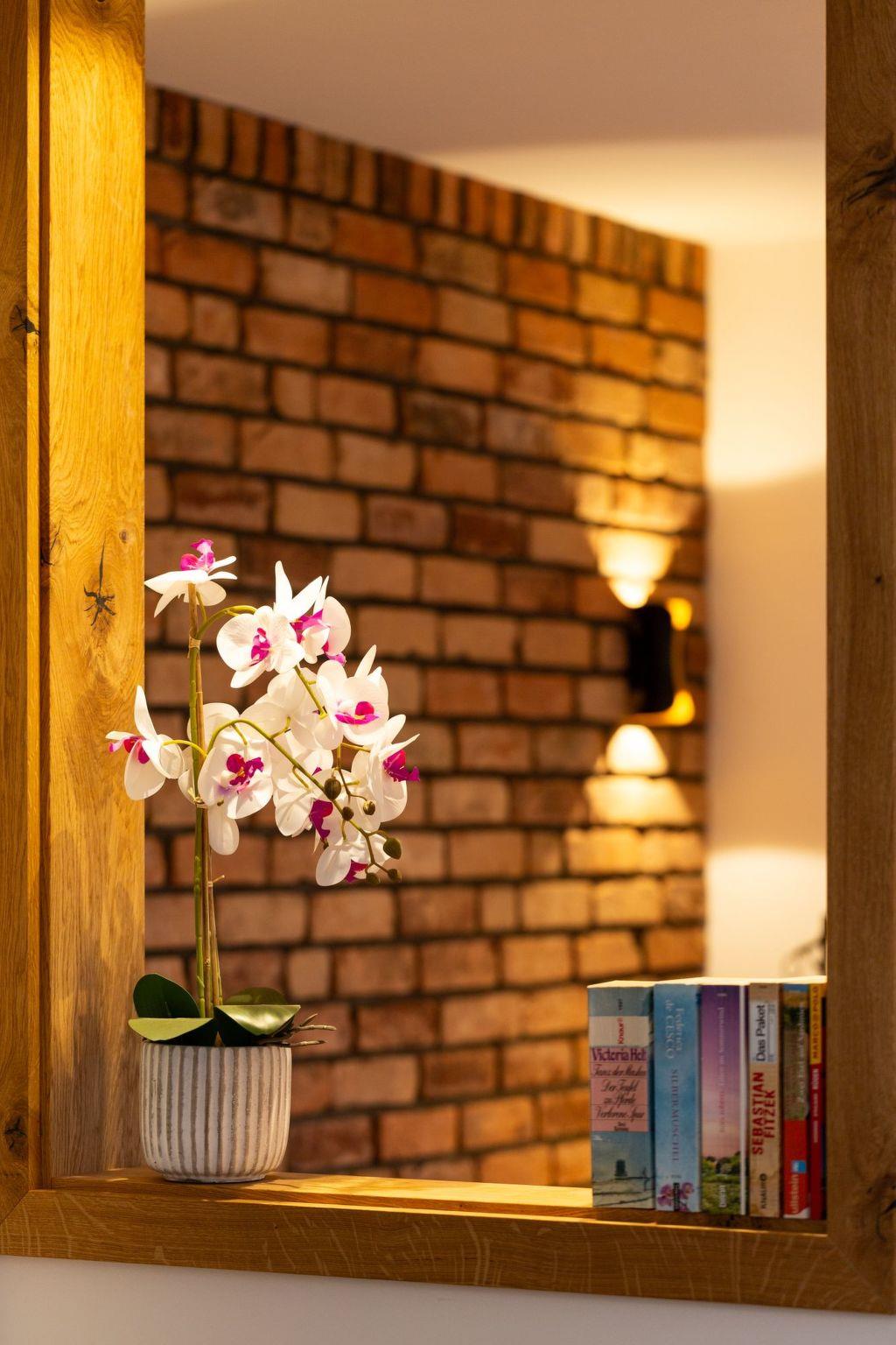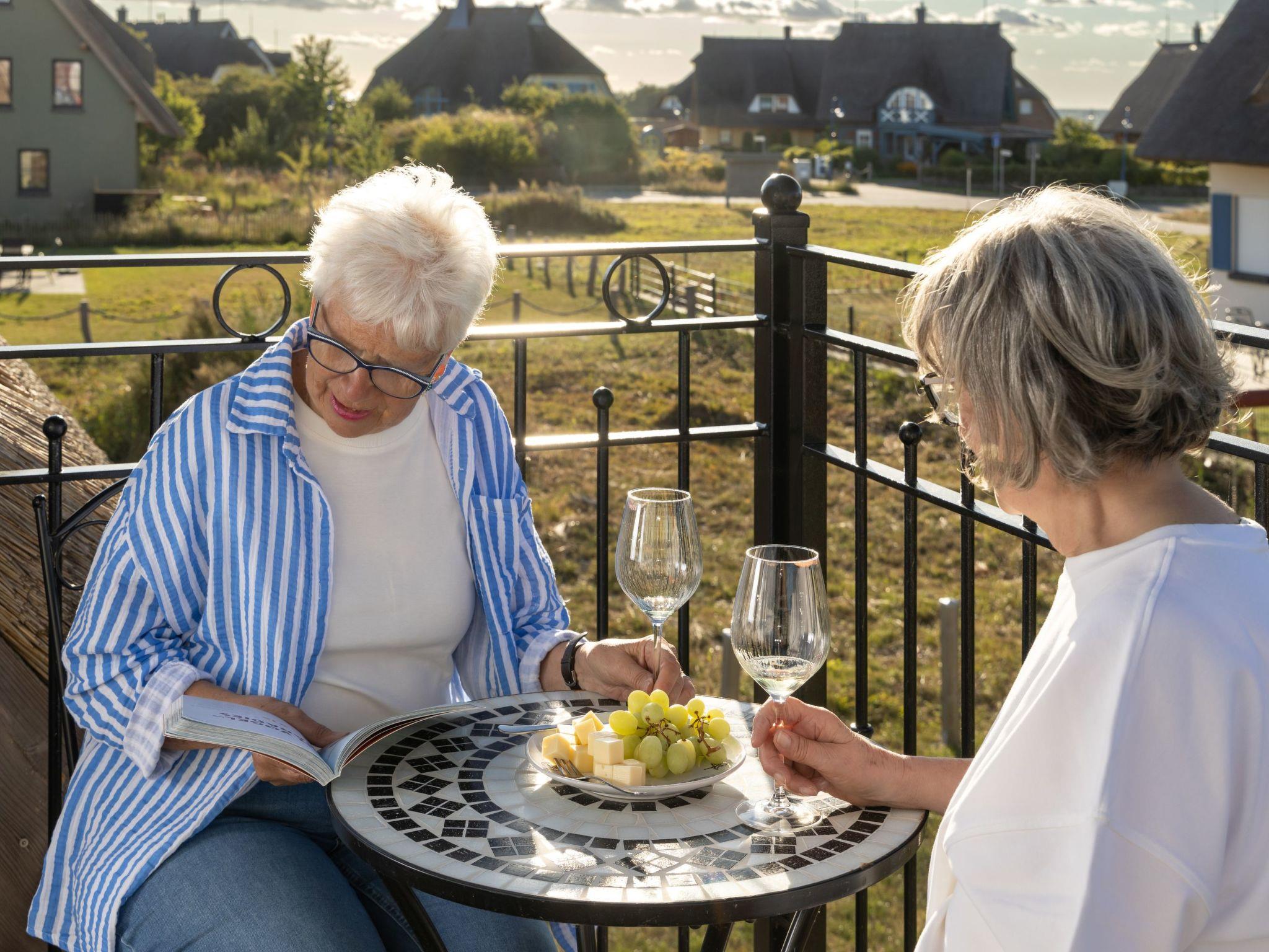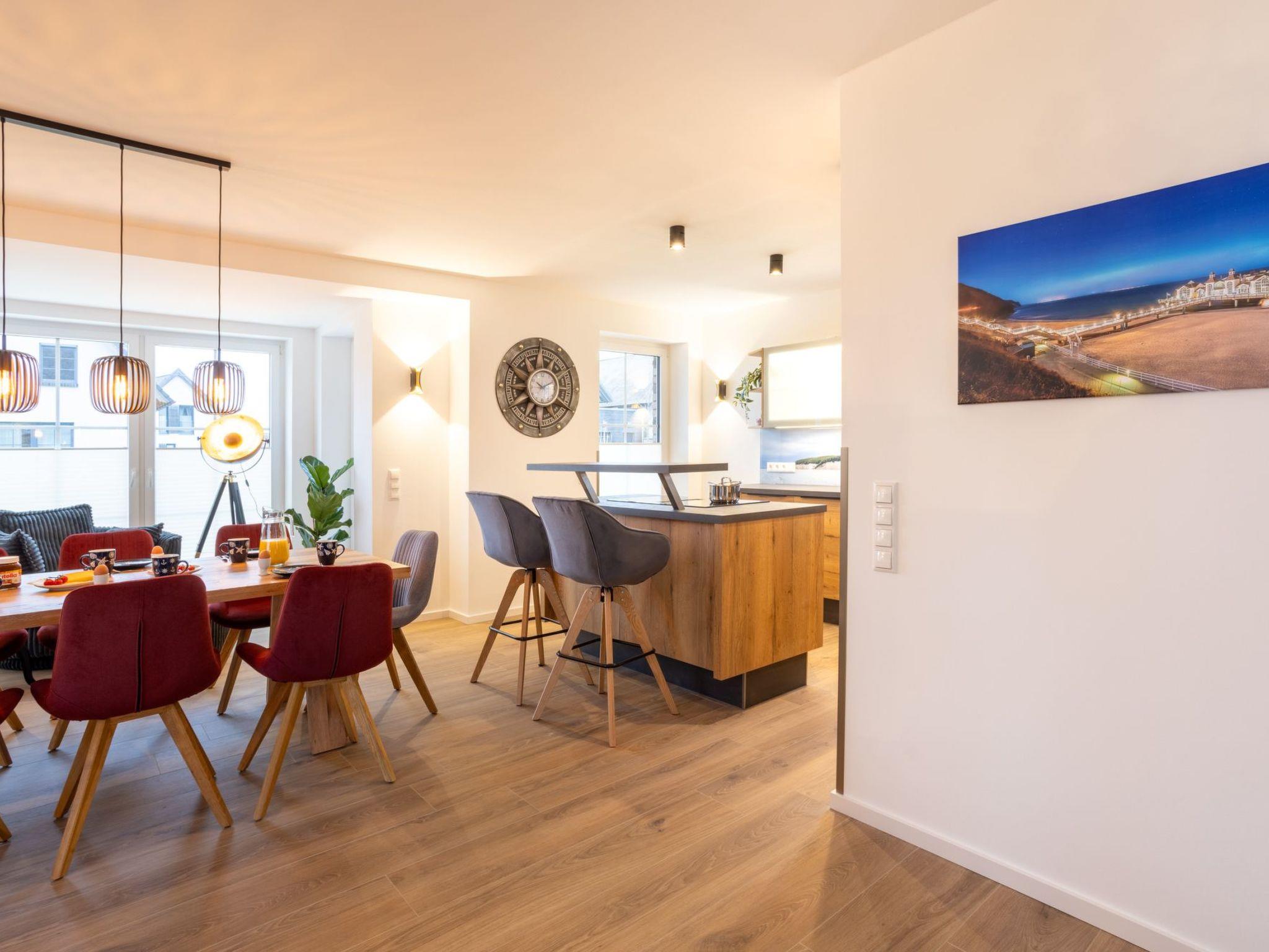 Das Reethaus vereint traditionellen Charme mit modernem Komfort. Im Dachgeschoss erwartet Sie eine private Sauna mit Ruheraum, stimmungsvoller Beleuchtung und gemütlichen Wellnessliegen – ein perfekter Rückzugsort nach einem Strandspaziergang. Im großzügigen Wohnbereich sorgt ein Kaminofen für behagliche Abende, während große Fenster und ein lichtdurchfluteter Erker den Blick in die Natur öffnen. Eine moderne Küche mit Kochinsel und Bar lädt dazu ein, auch im Urlaub kulinarische Erlebnisse zu genießen.