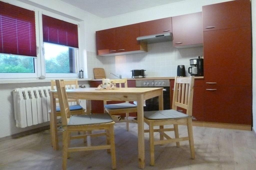 Sie wohnen in einem Ferienhaus auf einem angenehm gelegenen großen Grundstück in kleiner dörflicher Wohnlage, die vom touristischen Verkehr nicht gestört wird. Die Wohnung ist komplett und modern eingerichtet. In der Küche mit Cerankochfeld, Backofen, Kühlschrank, Geschirrspüler, Kaffeemaschine und Toaster können Sie sich bequem selbst versorgen. Gern können Sie auch die Gartenflächen auf dem Grundstück direkt zur Entspannung nutzen. Der Ferienwohnung steht ein eigener Sitzplatz zur Verfügung. Parkfläche für Fahrzeuge auf dem Grundstück, Unterstellmöglichkeit für Fahrräder und Motorräder. Nebenkosten inclusive.