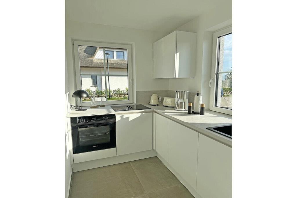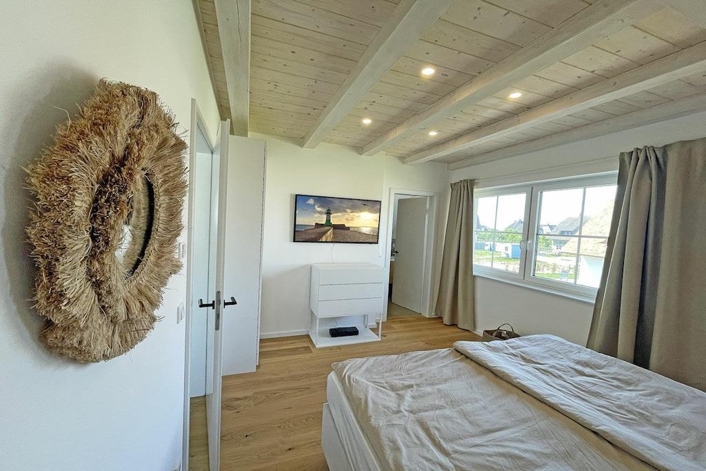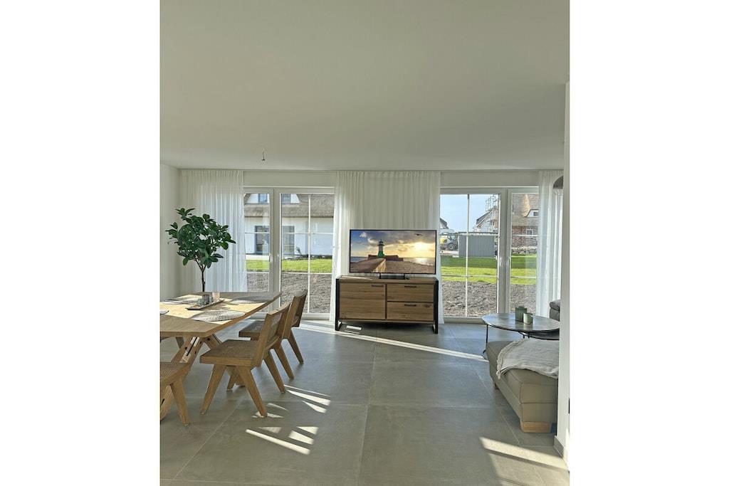 Erdgeschoss: modern eingerichteter Wohnbereich mit gemütlicher Couchlandschaft und Sessel, Internet/ WLAN, TV Sat/Kabel (Flatscreen), komplett ausgestattete hochwertige Einbauküche, großer Esstisch für 6 Personen, 4-Plattenherd (Induktionsherd), Backofen, Kühlschrank mit einem großen Gefrierfach, Geschirrspüler, Kaffeemaschine und diversen Elektrogeräten, Gästebad mit Waschbecken und WC, Hauswirtschaftsraum mit Waschmaschine, Staubsauger Obergeschoss: 1. und 2. Schlafzimmer sind mit einem komfortablen Boxspringbett (durchgehende Matratze 180 x 200) und Kleiderschrank ausgestattet, jedes Schlafzimmer mit separatem Badzugang, beide Bäder mit ebenerdiger Dusche und WC, 1 Schlafzimmer mit TV Sauna Außenbereich: gepflegtes komplett umzäuntes Grundstück, Terrasse mit Gartenmöbeln (5 Gartenstühle), 1 Strandkorb, Sonnenschirm.