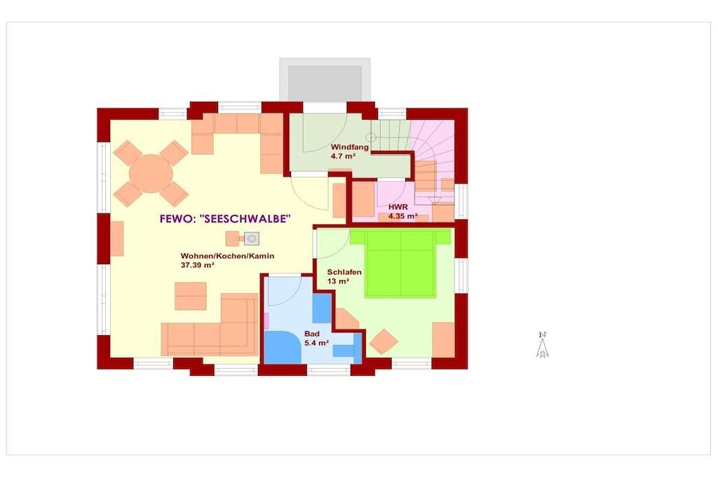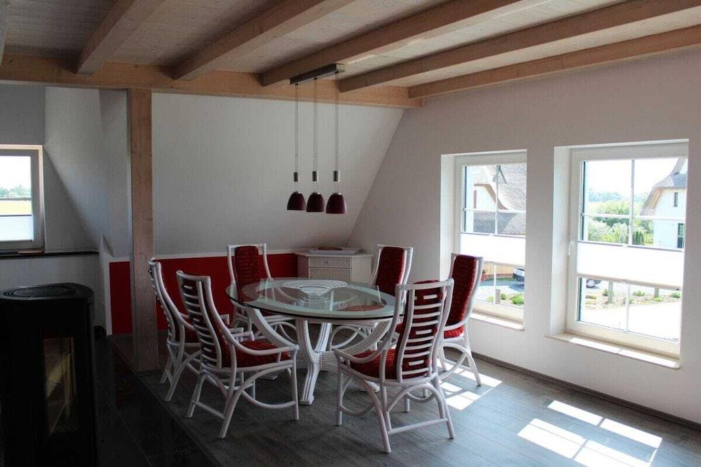Ferienhaus mit den zwei Ferienwohnungen: "Seeadler" und "Seeschwalbe" Die Ferienwohnung Seeadler im Obergeschoss + Dachgeschoss ist mit einer Wohnfläche von 78 qm sehr gut für eine Belegung mit 4 Personen geeignet. Die Ferienwohnung "Seeigel" im Erdgeschoss mit Terrasse: Wohnfläche 60m². Sehr gut geeignet für zwei Personen. Die Ferienwohnungen verfügt über einen großen ansprechenden Wohnraum mit moderner, voll eingerichteter Einbauküche, Essplatz, Sitzecke, Kamin und LCD-TV. "Seeadler" Zwei Schlafzimmer mit je einem Doppelbett mit Liegefläche: 2.00m x 1.80m. Zwei wunderschön gestaltete Bäder bieten großzügige Duschen. Der Gartensitzplatz ist ausgestattet mit Strandkorb, Grill, Gartenmöbeln und Liegen. Vom Haus erhält man einen fantastischen Blick auf das Meer und die Insel Hiddensee. "Seeigel": Ein Schlafzimmer mit einem Doppelbett mit Liegefläche: 2.00m x 1.80m. Ein wunderschön gestaltetes Bad bietet eine großzügige Dusche. Die Terrasse ist ausgestattet mit Strandkorb, Grill, Gartenmöbeln und Liegen. Eine Aufbettung, Haustiere, eine geänderte Anreise oder eine kürzere Buchungszeit sind auf Anfrage möglich.