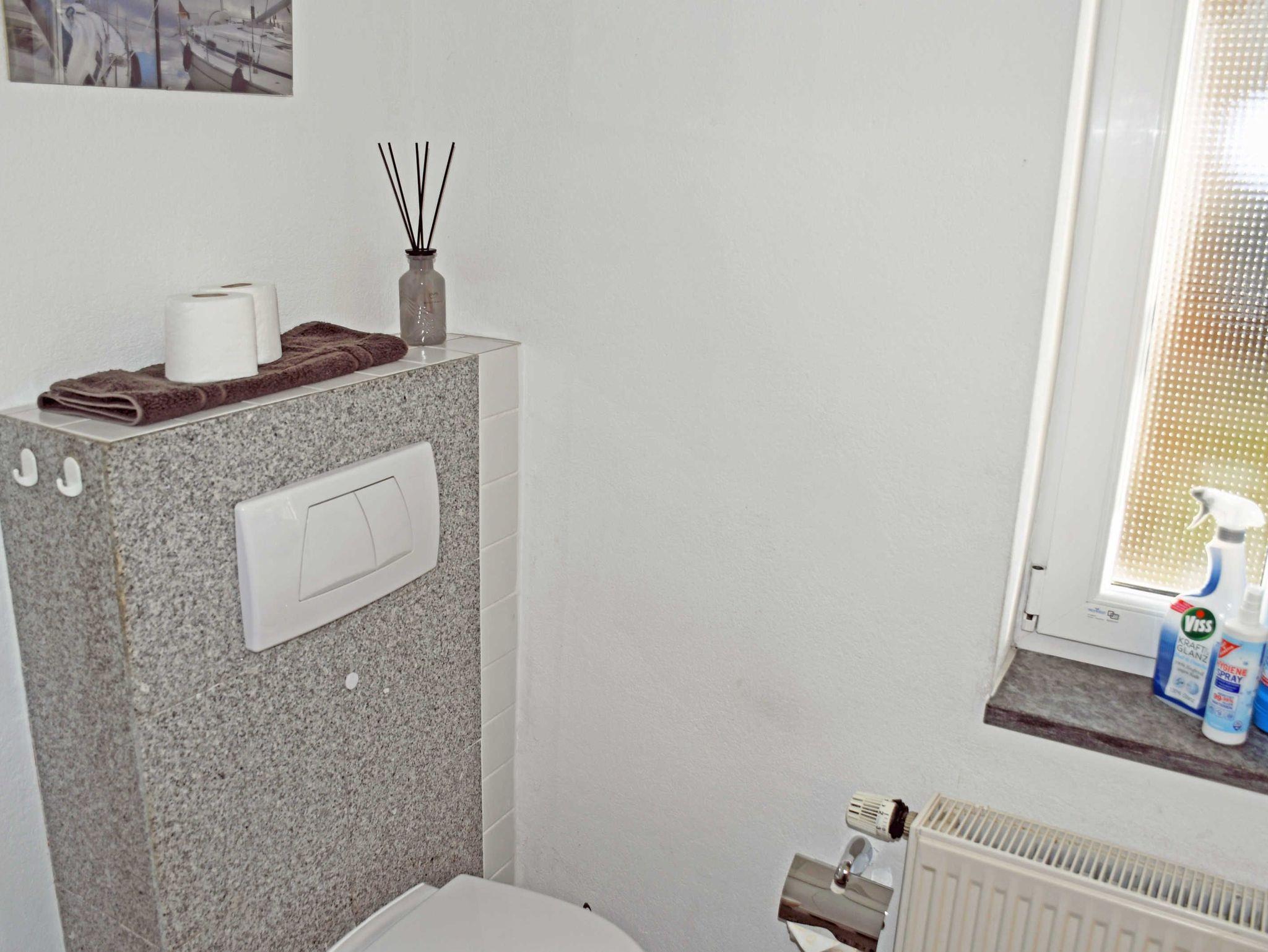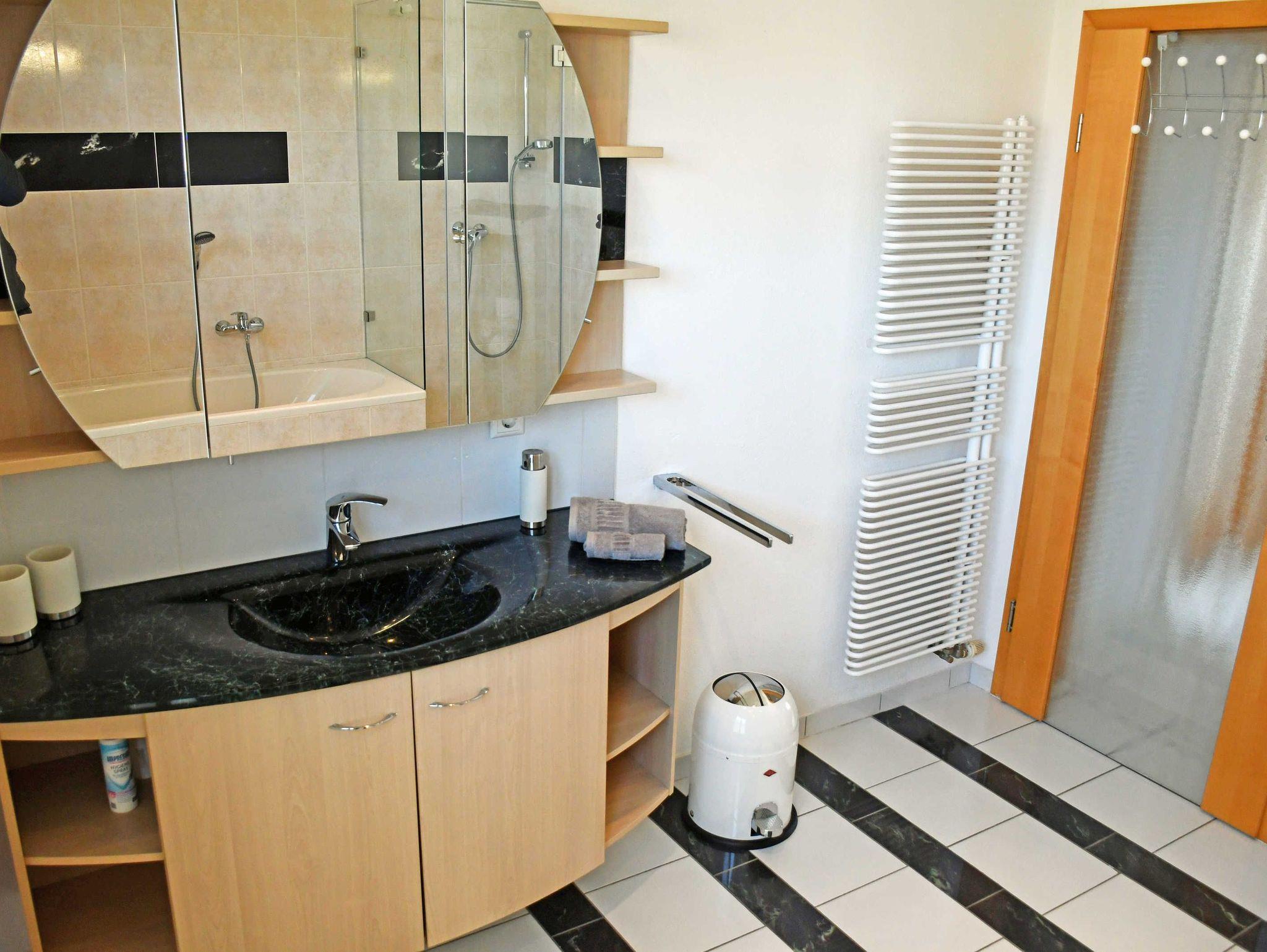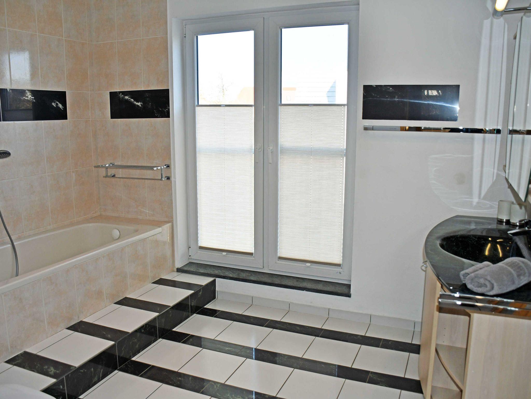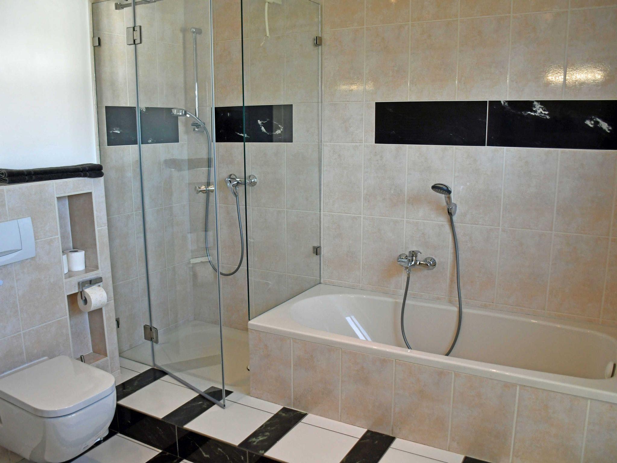 Das moderne große Bad ist mit Dusche, Badewanne, WC und Waschtisch ausgestattet und verfügt über Tageslicht.