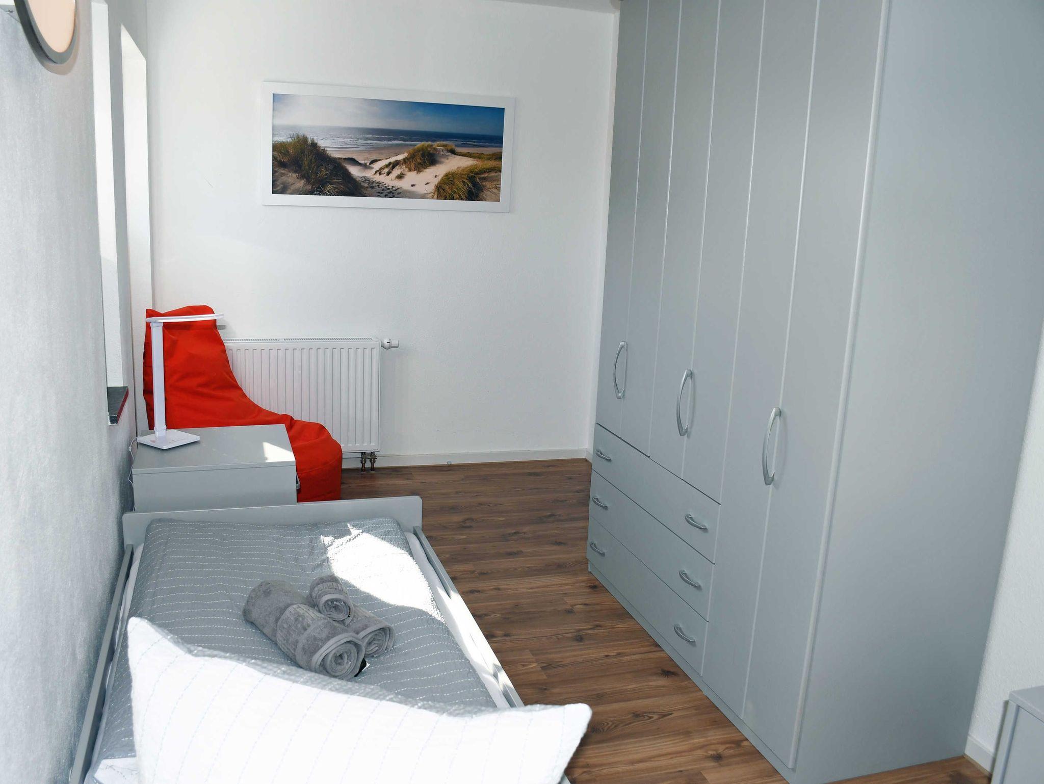 Das erste Schlafzimmer ist mit einem bequemen Doppel-Boxspringbett mit Nachttischen und Leselampen sowie einem Kleiderschrank ausgestattet. Hier steht auch eine kleine Schlafcouch für 2 Gäste, 1,40 m breit. Im zweiten Schlafzimmer stehen zwei Einzelbetten mit Nachttisch und Leselampe sowie eine Kommode.