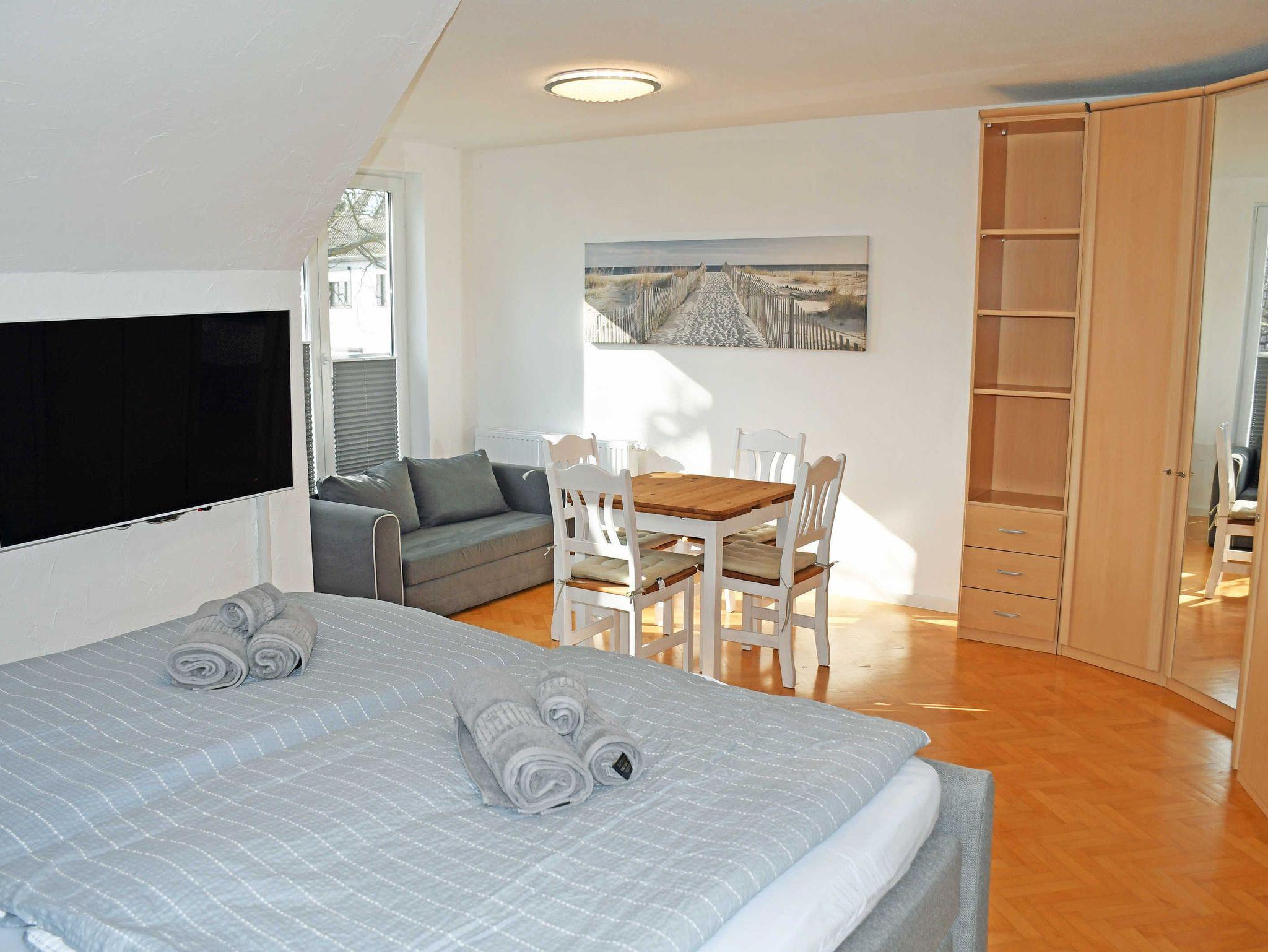 Gäste dieser Ferienwohnung können auch ein kostenloses WLAN-Internet nutzen. Im hellen Wohnraum befinden sich eine bequeme Schlafcouch mit einem Tisch, ein modernes Flachbild-TV-Gerät. Hier steht auch ein Esstisch mit Stühlen.