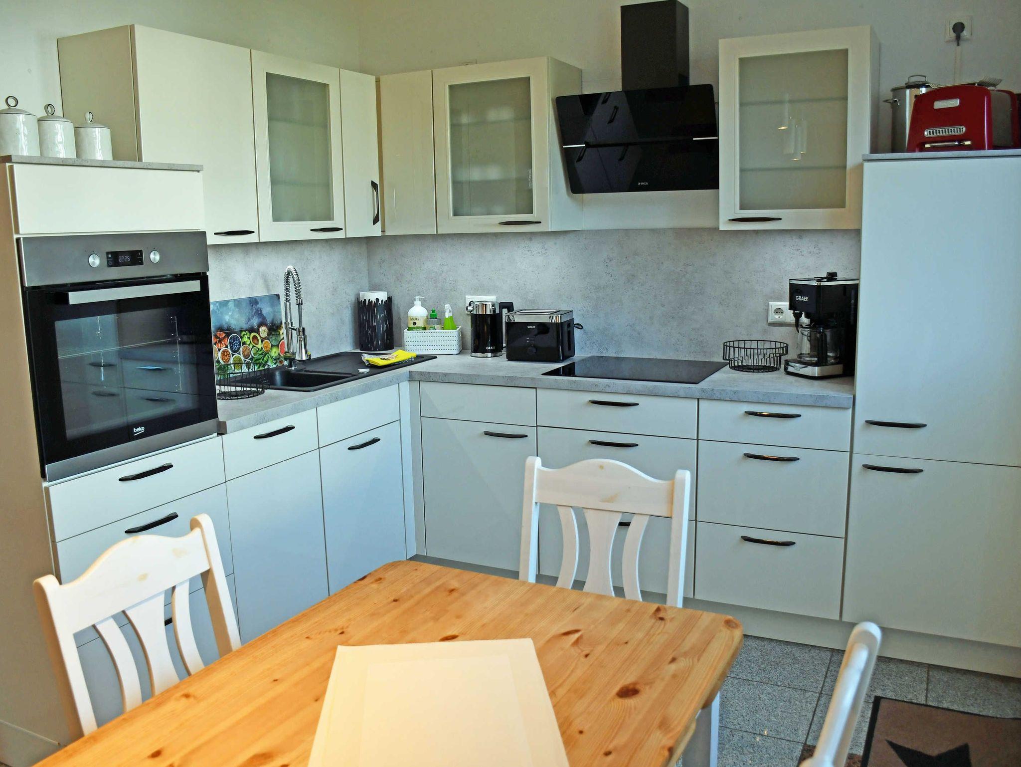 Die moderne Küchenzeile ist exklusiv ausgestattet mit Cerankochfeld, Abzugshaube, Spülmaschine, Mikrowelle, Backofen, Wasserkocher, Kaffeemaschine, Toaster und umfangreichen weiteren Küchenutensilien.