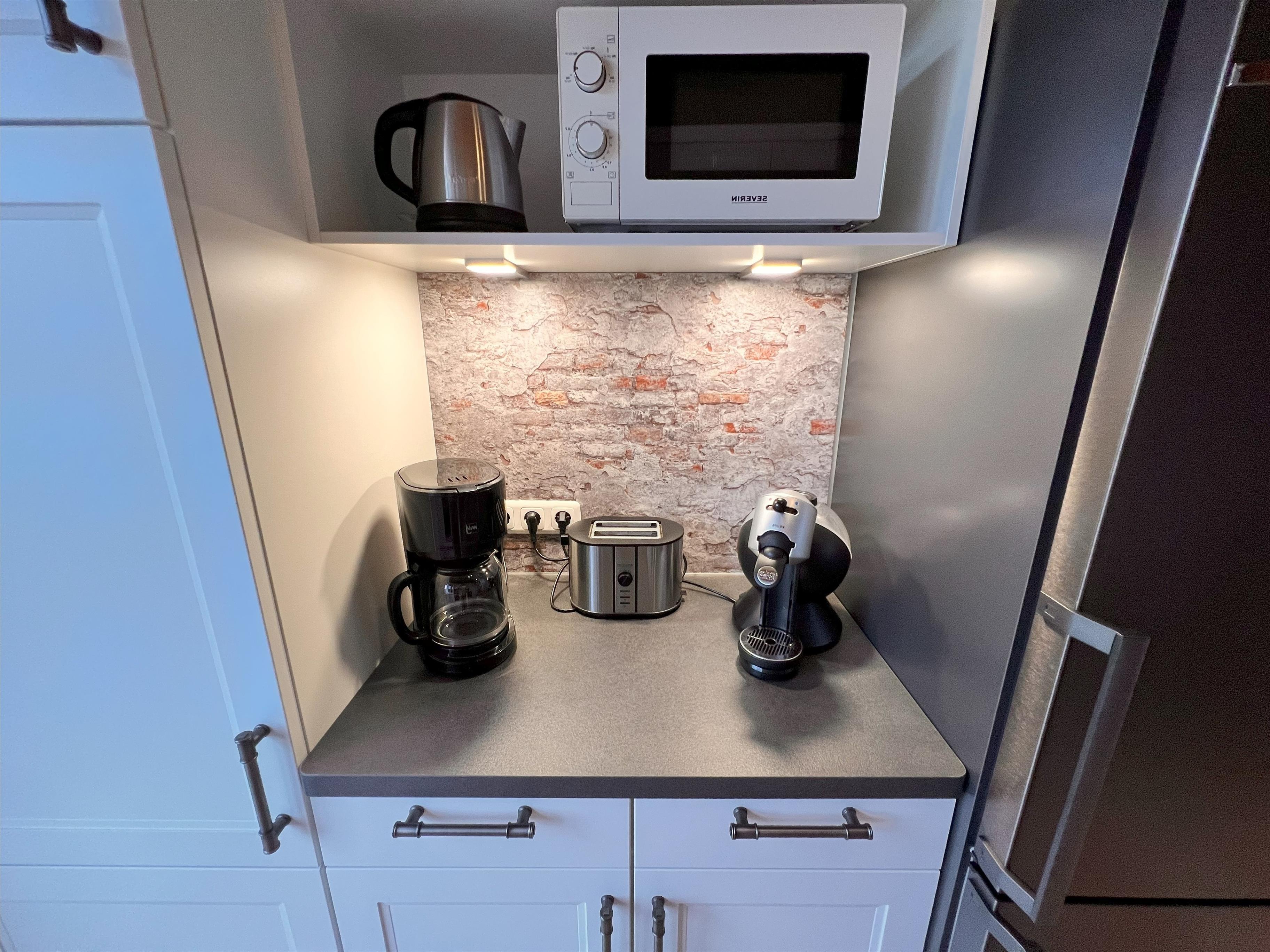 Toaster, Kaffeemaschine, Wasserkocher, Geschirrspüler, Mikrowelle, Geschirr und vieles mehr..