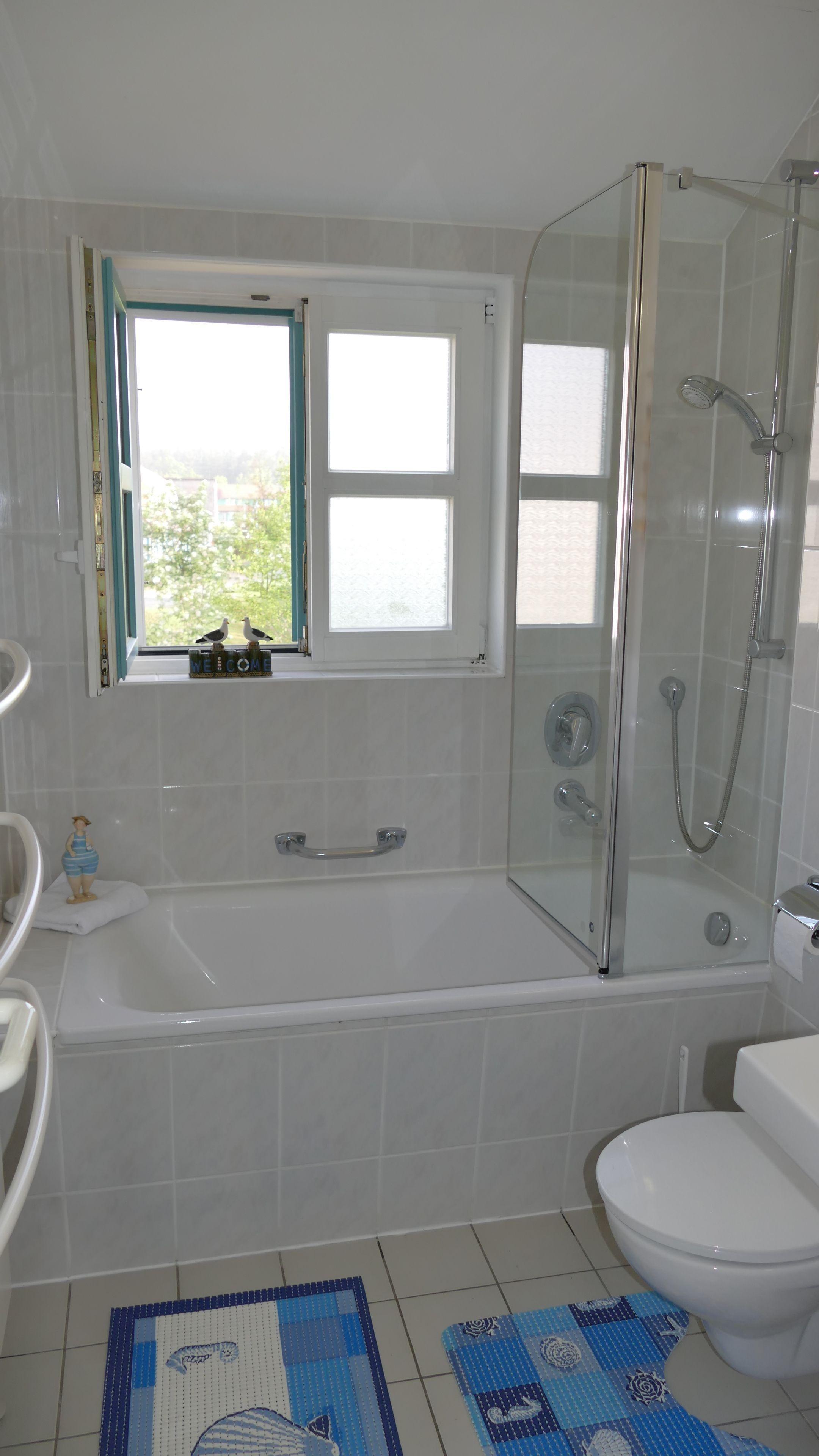 Im Obergeschoss befinden sich ein Schlafzimmer mit Doppelbett, ein zweites Schlafzimmer/Kinderzimmer mit zwei Einzelbetten (zusammenstellbar) sowie ein Vollbad mit Fenster. Für Duschfans befindet sich am Wannenrand eine Duschtrennwand.