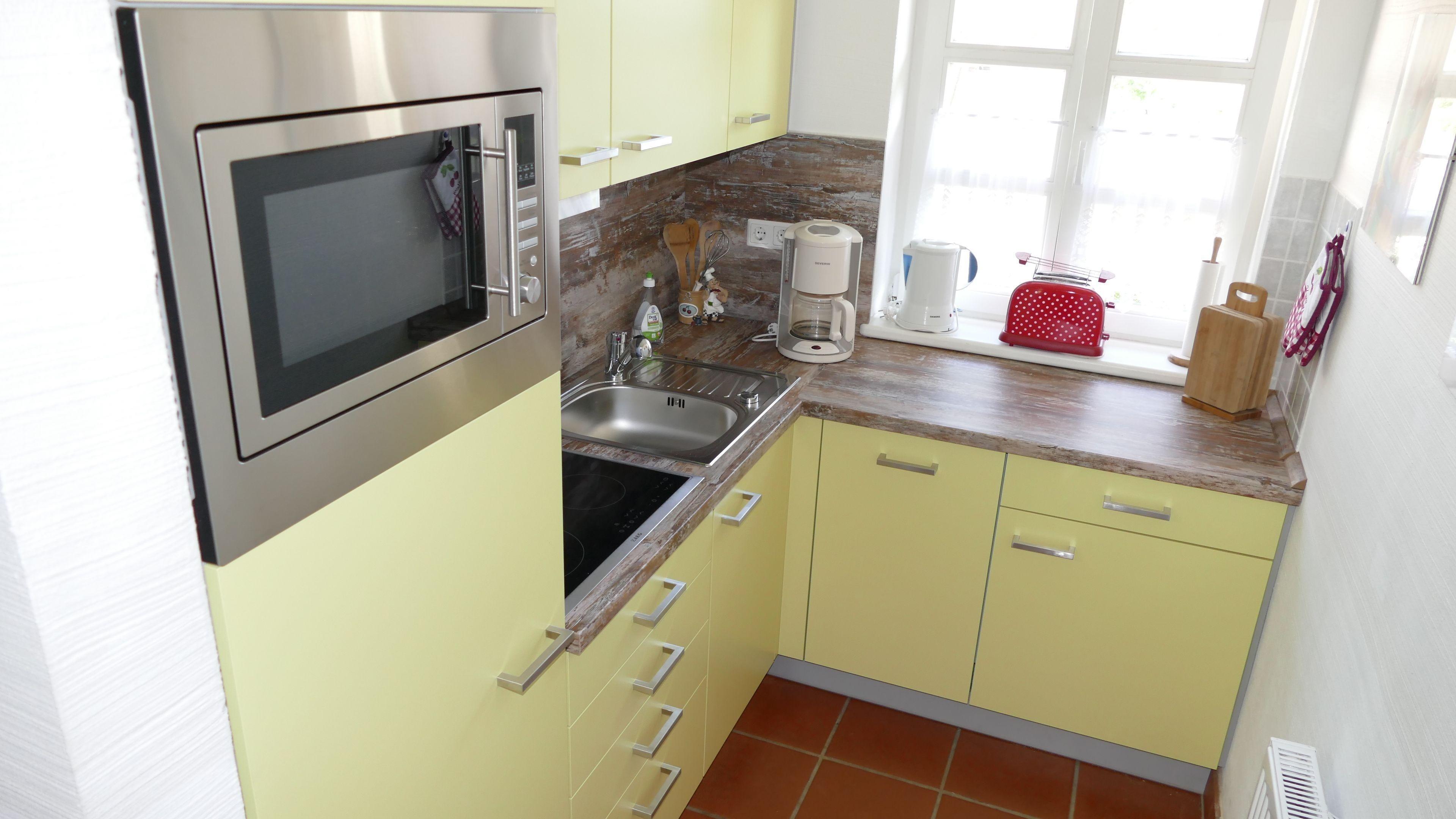 Die stylische Küchenzeile verfügt über Fenster, Cerankochfeld mit Umlufthaube, Geschirrspüler, Kaffeemaschine, Toaster, Wasserkocher, Mikrowelle mit Backfunktion, Kühlschrank mit kleinem Gefrierfach sowie über ausreichend Geschirr zum Essen und Kochen.