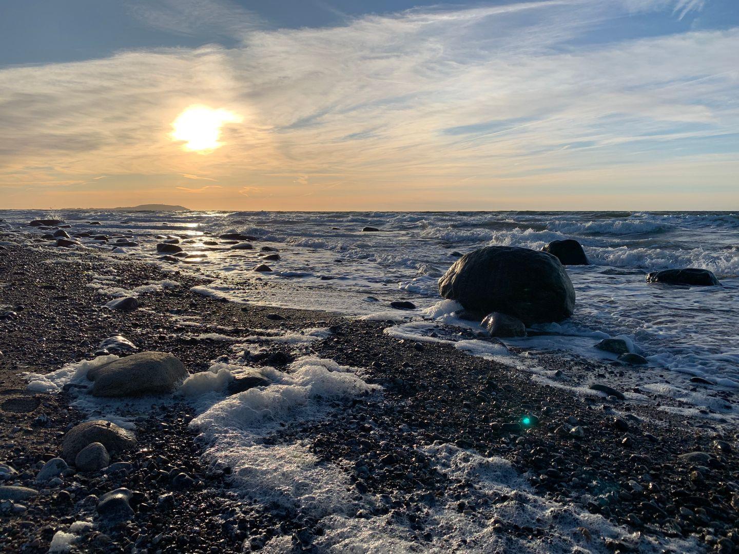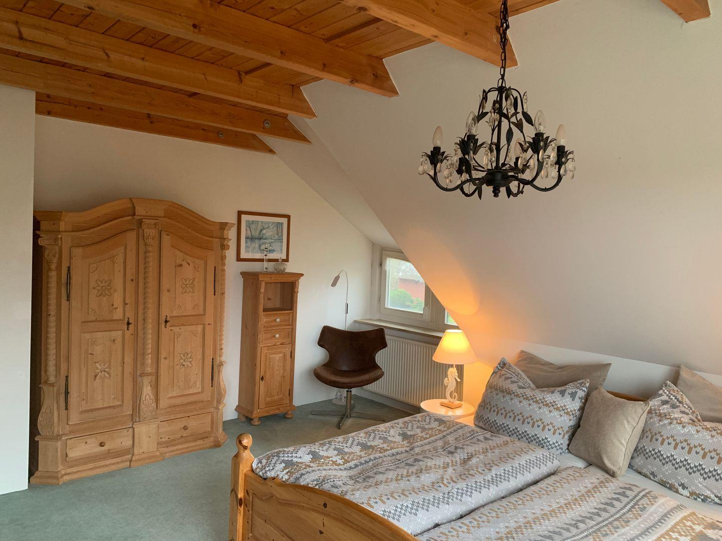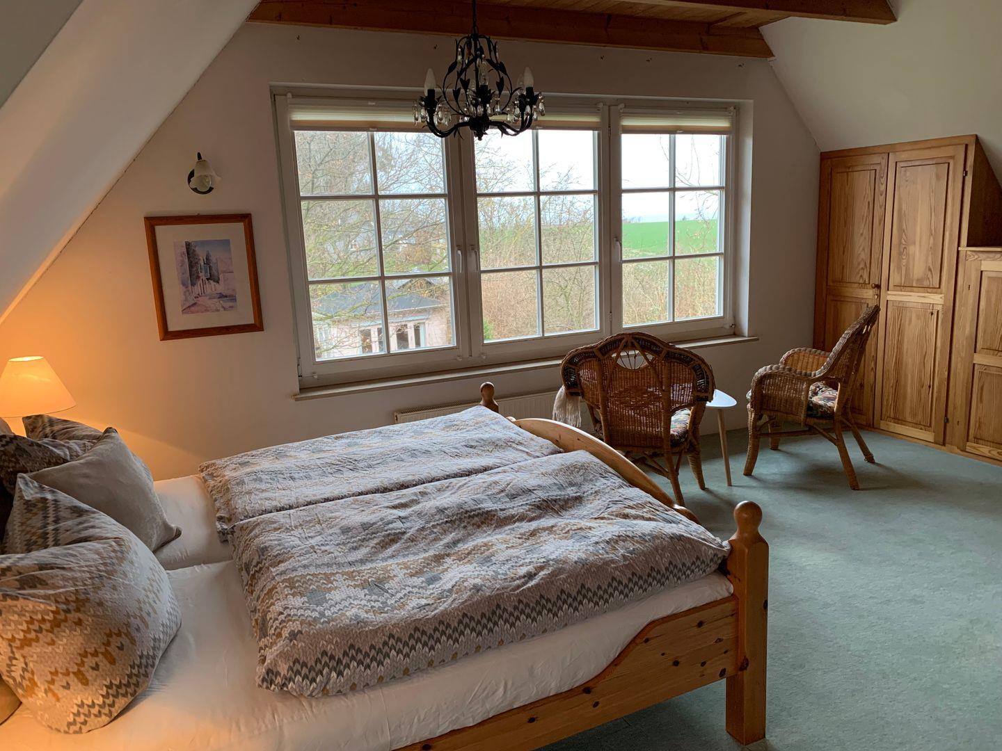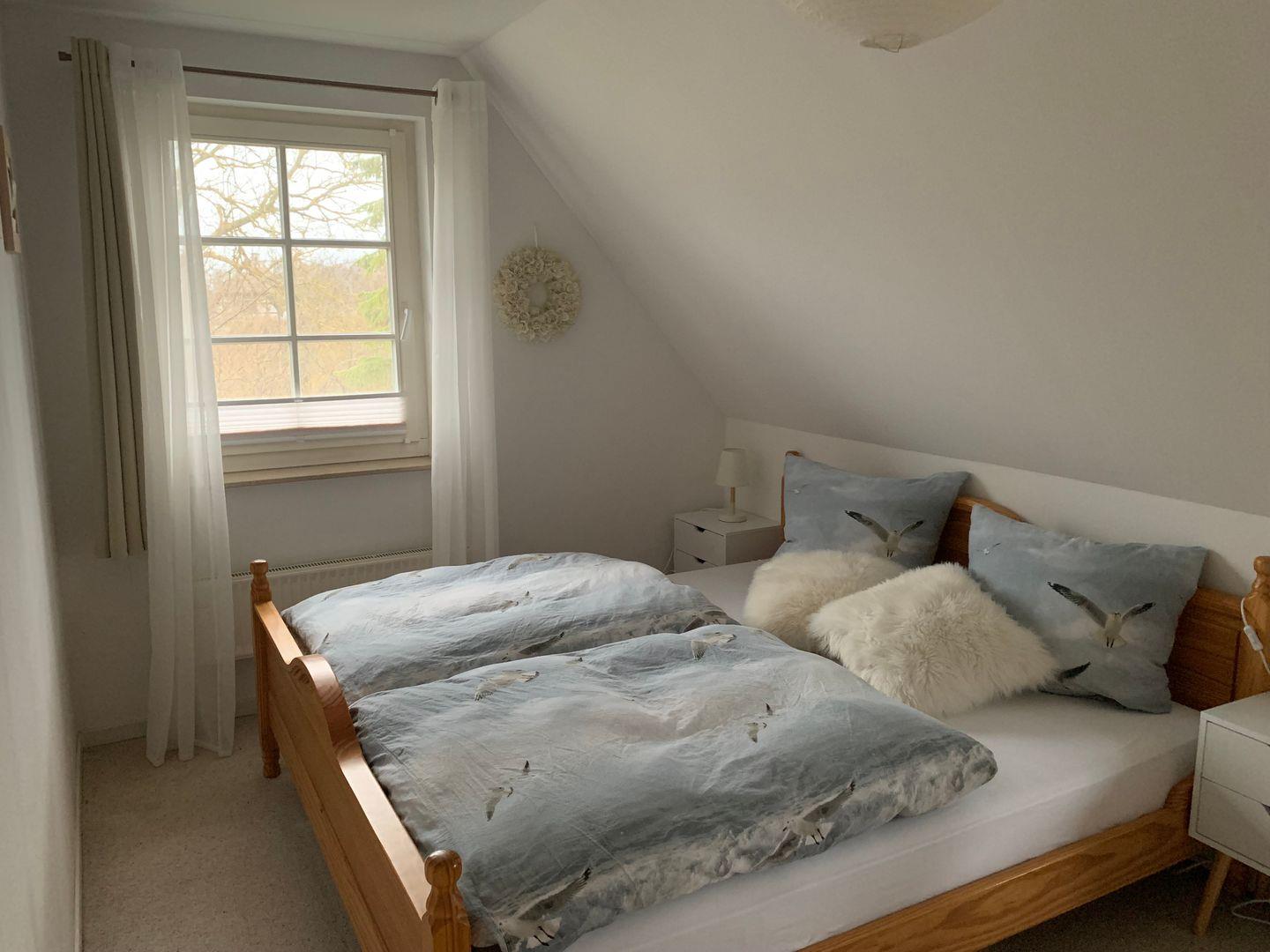 Im Obergeschoß des Hauses gibt es 2 Schlafzimmer, beide ausgestattet mit Doppelbetten, im Wohnzimmer kann eine weitere Person auf der Schlafcouch übernachten. Bei Bedarf steht ein selbst aufblasbares Luftbett zur Verfügung (1,20 x 2,00 m). Von den Schlafzimmern im OG hat man einen schönen Seeblick, man sieht die Sonnenuntergänge und die vorüberziehenden Segelboote.