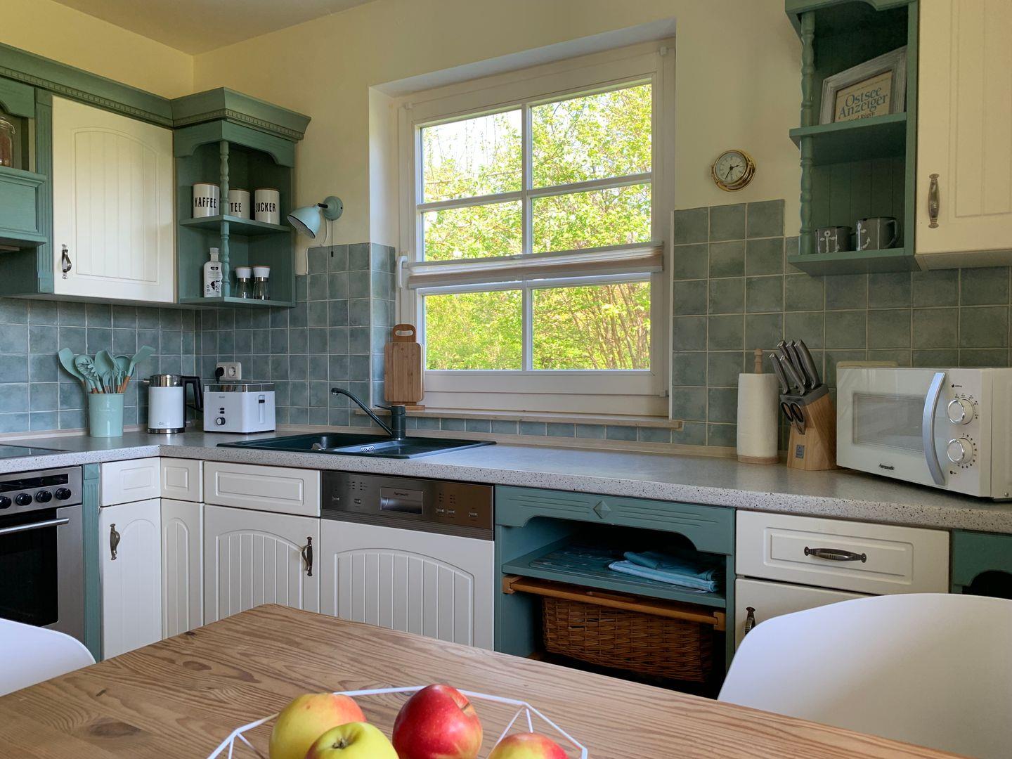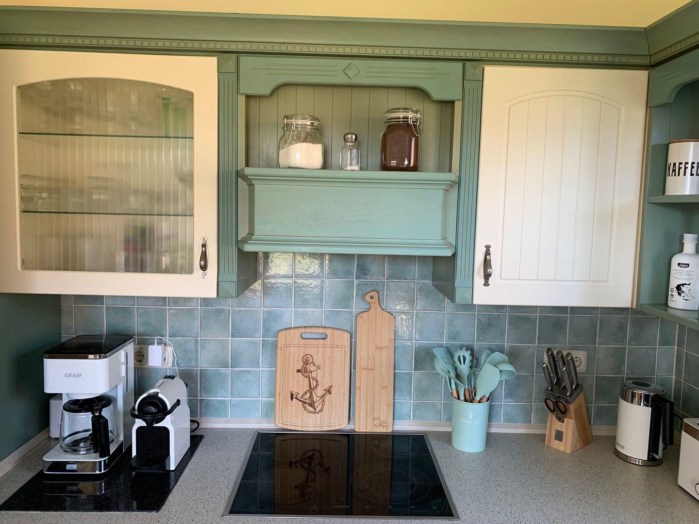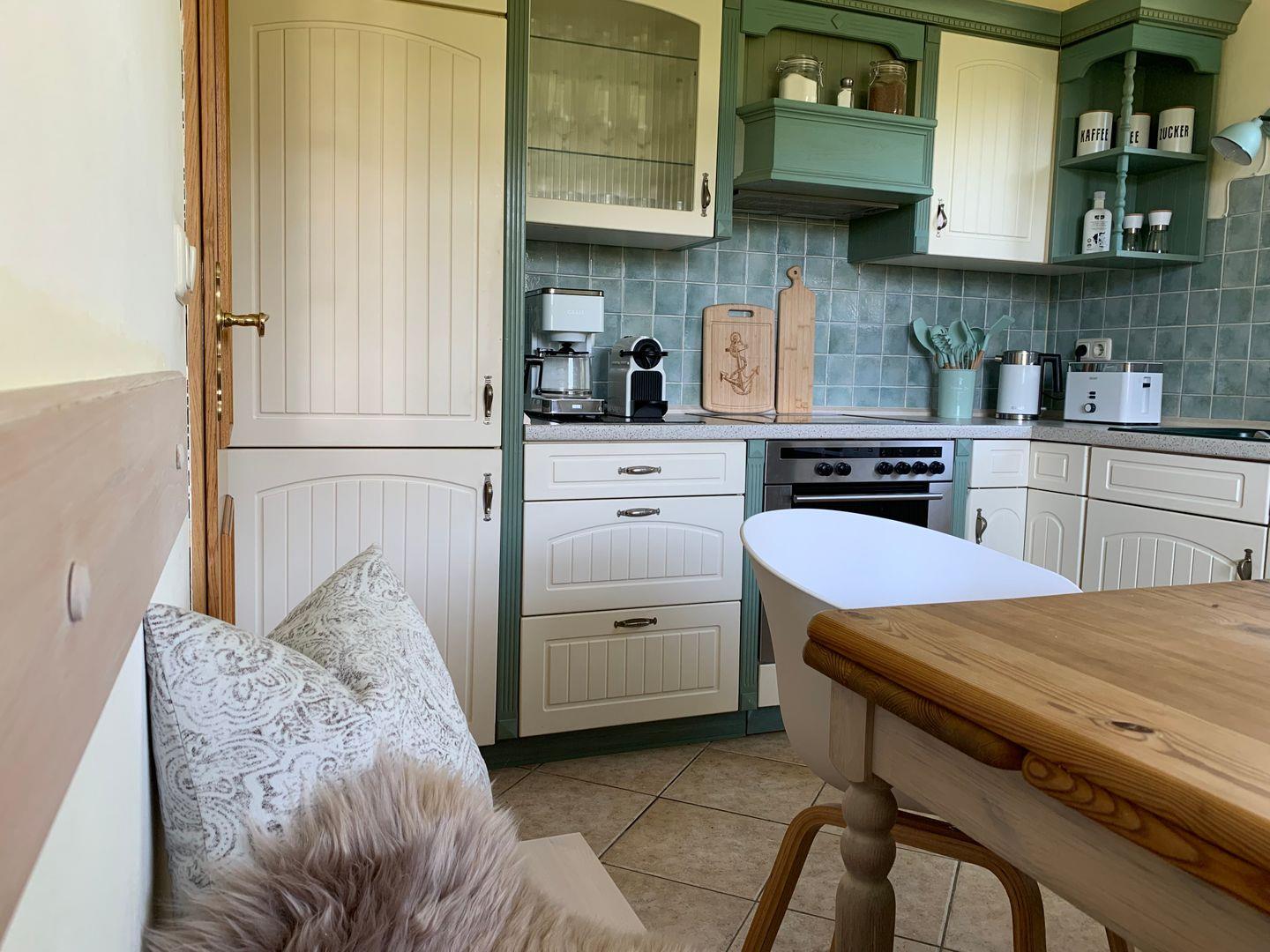 Die helle Landhaus-Küche ist ausgestattet mit Geschirrspüler, Kühlschrank /Gefriermöglichkeit, Backofen, Ceranherd, Mikrowelle, Kaffeemaschine, Espressomaschine, Wasserkocher, Toaster, Stabmixer, Handrührgerät und natürlich mit ausreichend Geschirr und weiteren Küchenutensilien. Auch hier in der Küche gibt es einen gemütlichen Essplatz.