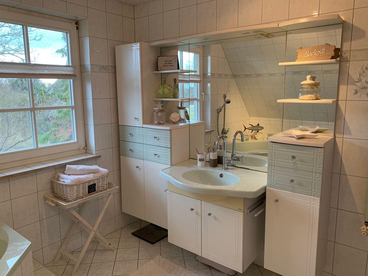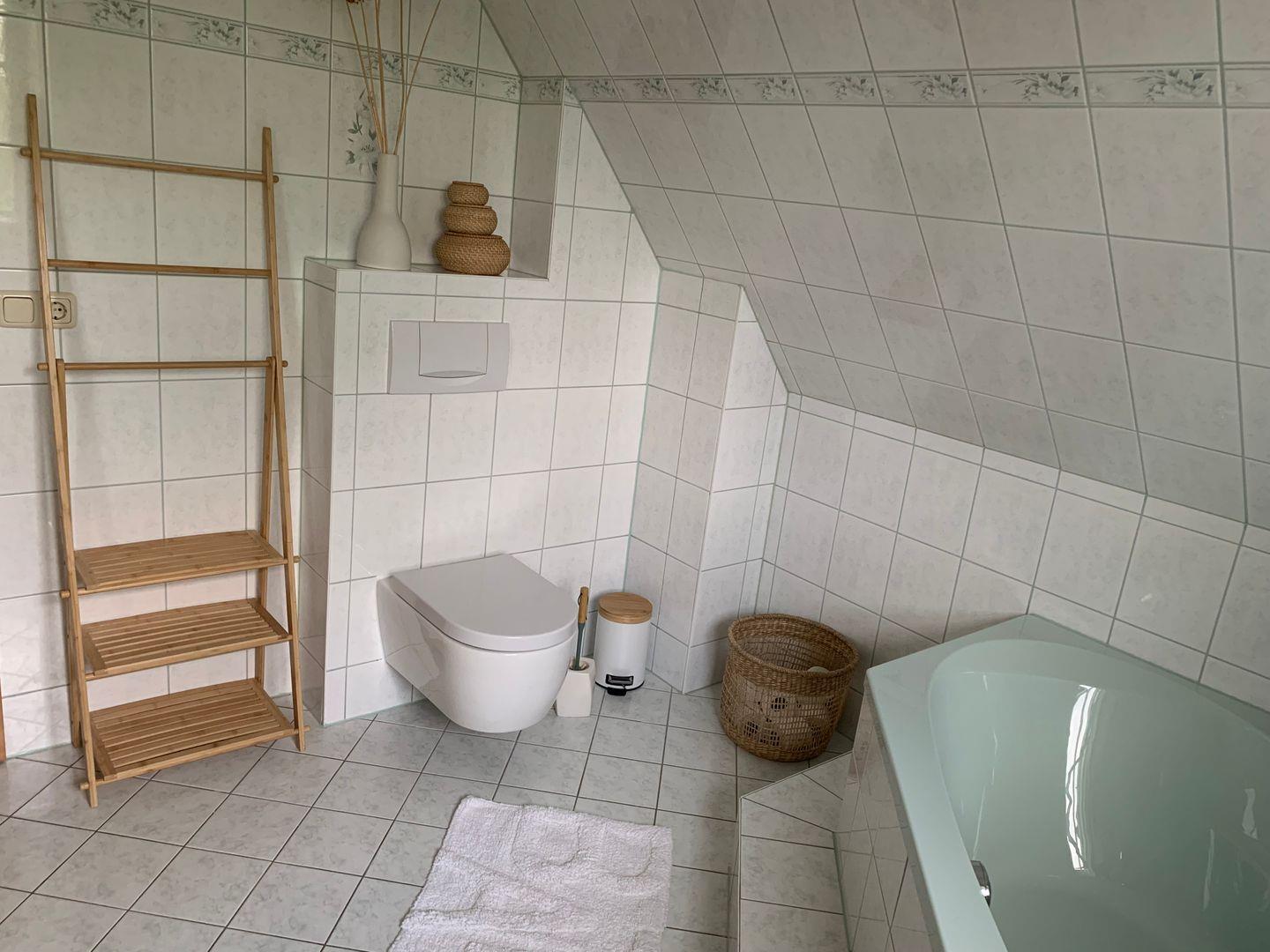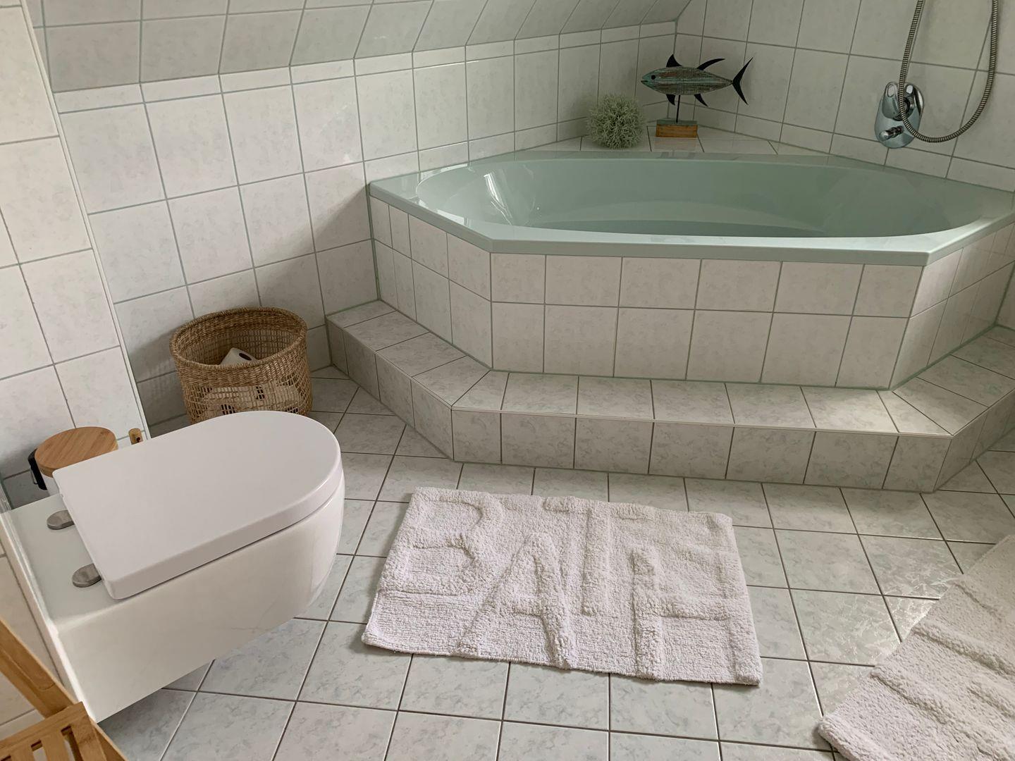 Es gibt zwei großzügige, helle Bäder im Haus: eins im Obergeschoß mit großer Eckbadewanne und eins im Erdgeschoß mit ebenerdiger, großzügiger Glasdusche.