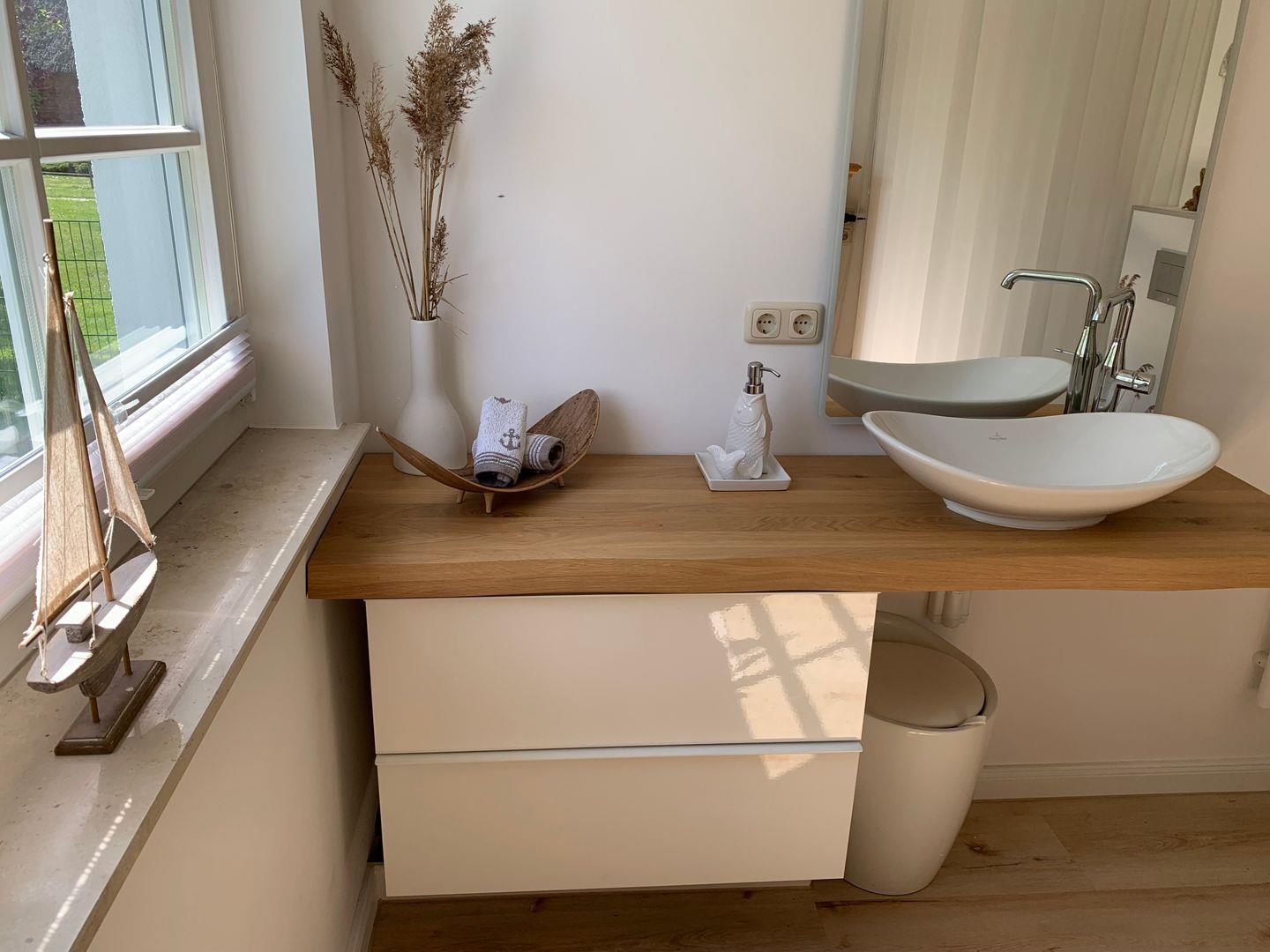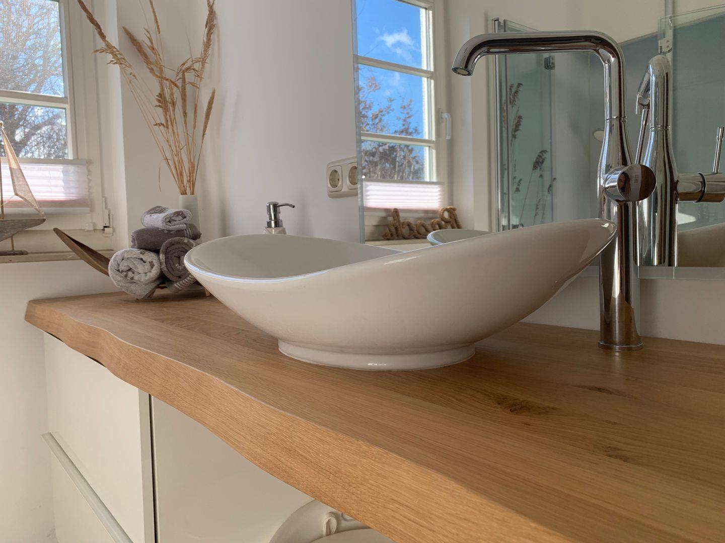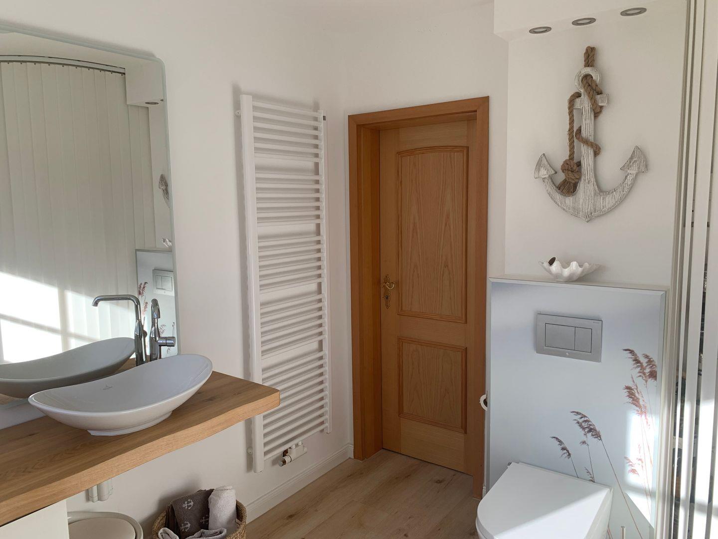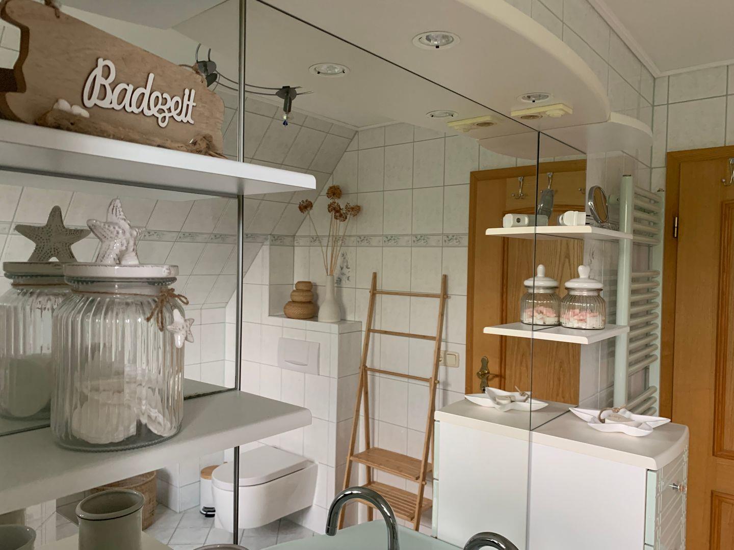 Es gibt zwei großzügige, helle Bäder im Haus: eins im Obergeschoß mit großer Eckbadewanne und eins im Erdgeschoß mit ebenerdiger, großzügiger Glasdusche.
