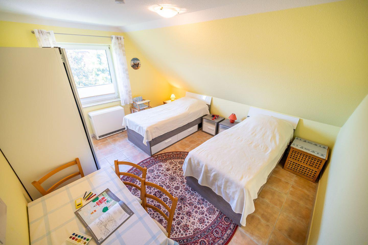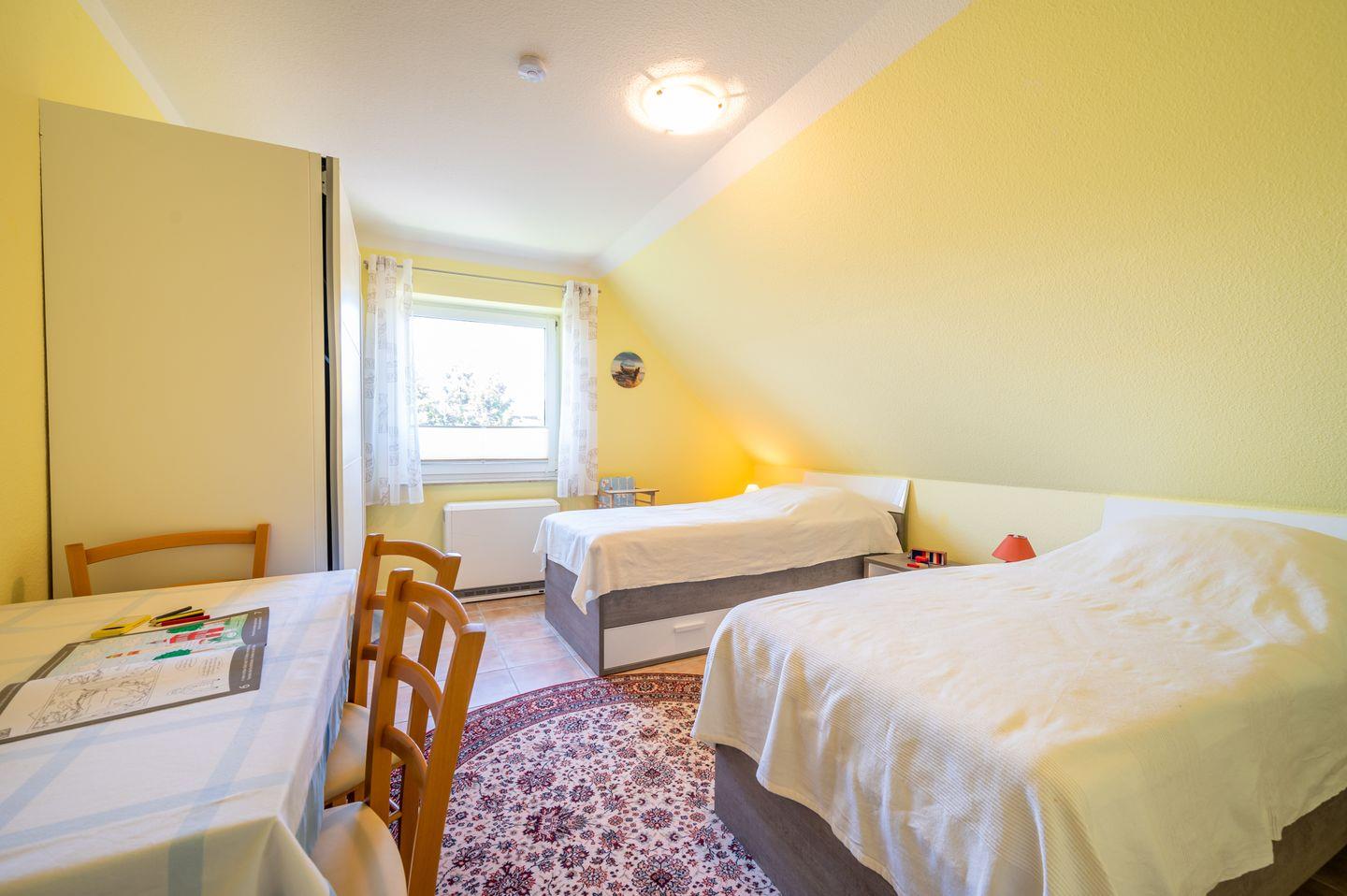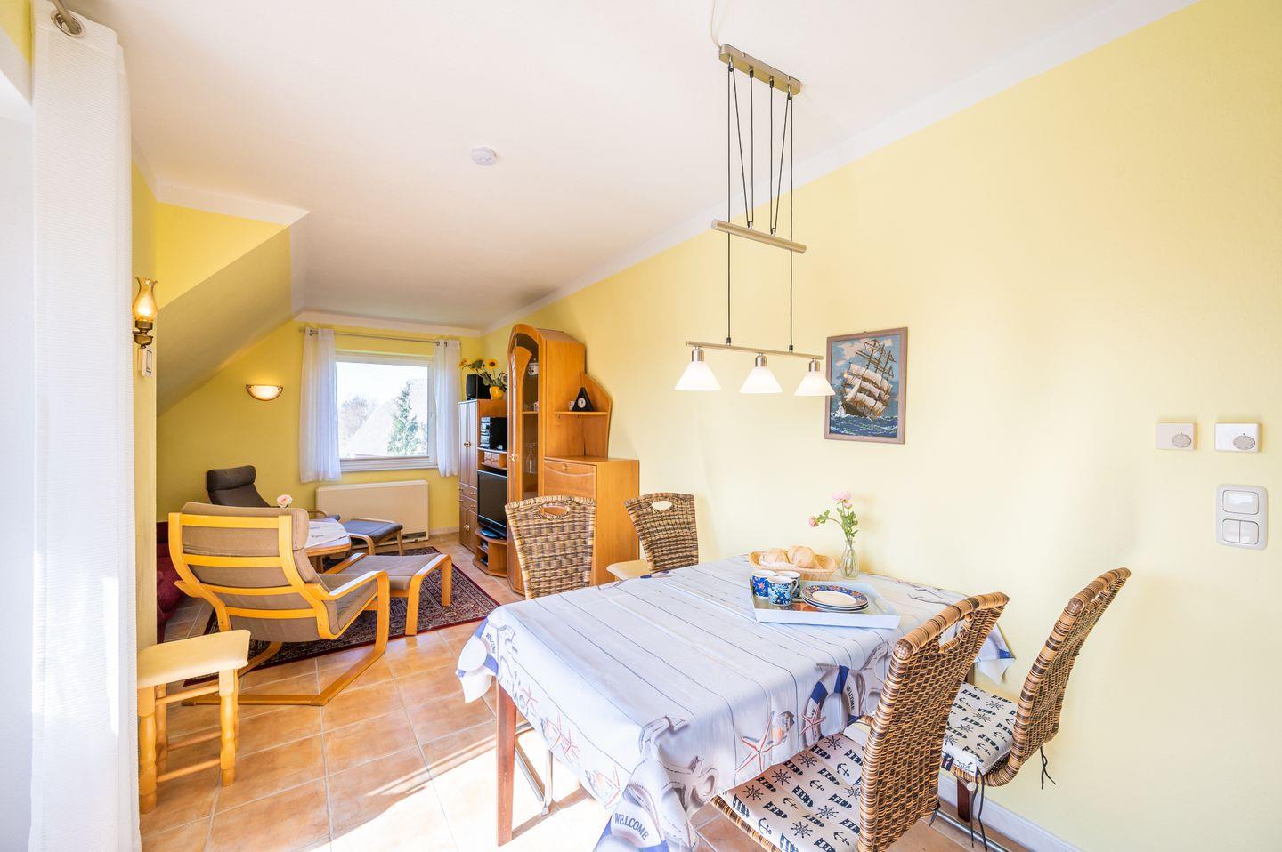 Die 78 m² große Ferienwohnung ist auf bis zu vier Personen und ein Kleinkind ausgelegt und bietet eine gemütliche Atmosphäre für unvergessliche Urlaubstage. Der helle Wohnbereich lädt zu entspannten Stunden ein, während der angrenzende Balkon mit Sonnenschutz und Blick ins Grüne ein Lieblingsplatz für ruhige Momente an der frischen Luft ist. Hier darf auch gegrillt werden. Die Einbauküche ist komplett ausgestattet und macht die Zubereitung gemeinsamer Mahlzeiten zum Vergnügen. Zwei gemütliche Schlafzimmer, eines mit Doppelbett und eines mit zwei Einzelbetten, sorgen für erholsamen Schlaf. Das zweite Schlafzimmer liegt über den Gang; das Treppenhaus nutzen Sie auf dieser Etage jedoch allein und sind daher ungestört. Das helle Badezimmer ist mit Dusche und Waschmaschine ausgestattet. Der Garten im Erdgeschoss steht zur gemeinschaftlichen Nutzung zur Verfügung. Ein Pkw-Stellplatz befindet sich – ganz komfortabel – direkt am Haus. Die Wohnung ist hundefreundlich, sodass auch Ihre vierbeinigen Begleiter herzlich willkommen sind. Hier finden Sie den perfekten Ort, um die Natur Rügens zu erkunden, die Seele baumeln zu lassen und neue Kraft zu tanken.